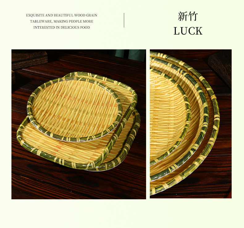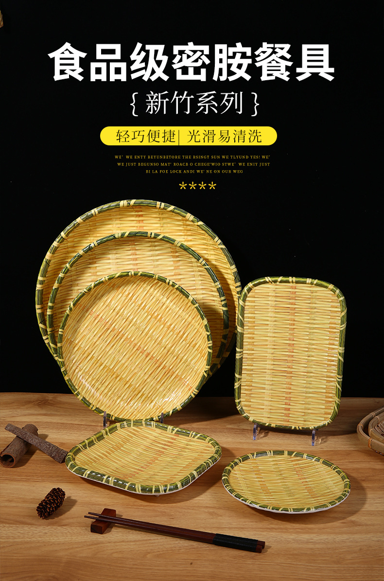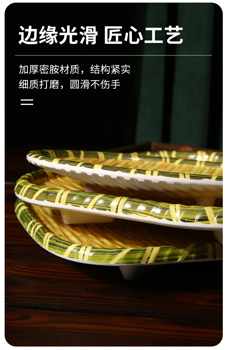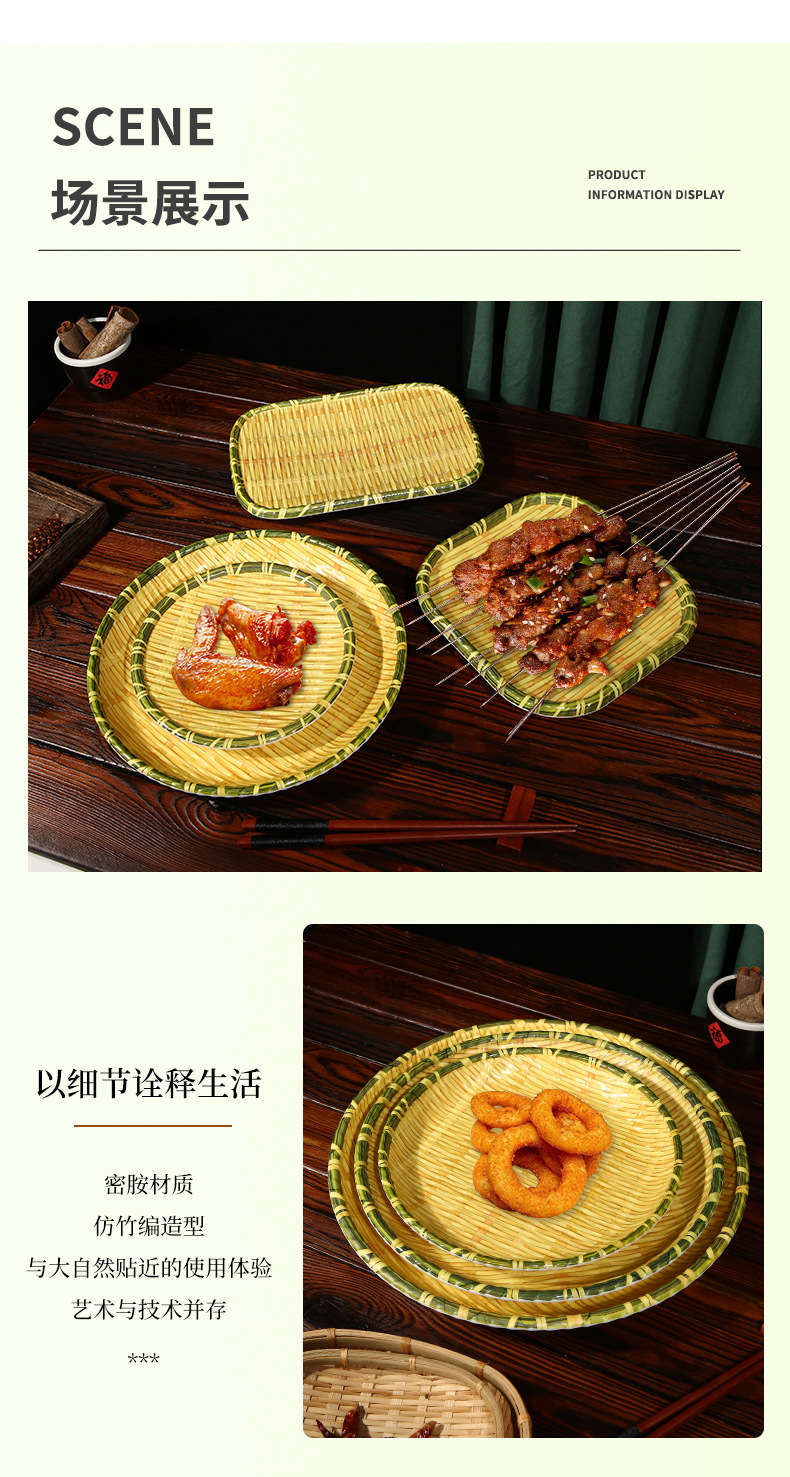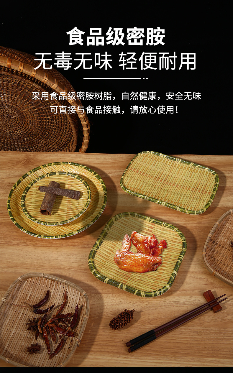 竹编、编织、簸箕、篮子、茶点盘、仿竹编圆盘火锅菜盘烧烤店专用盘创意小吃盘水果点心盘密胺餐具