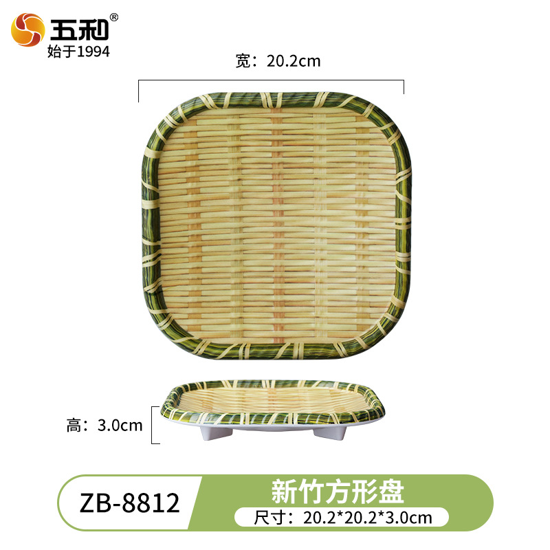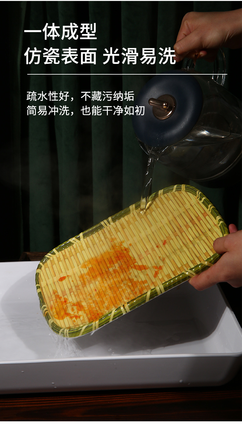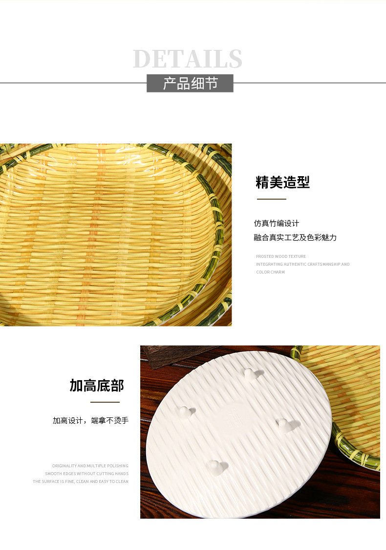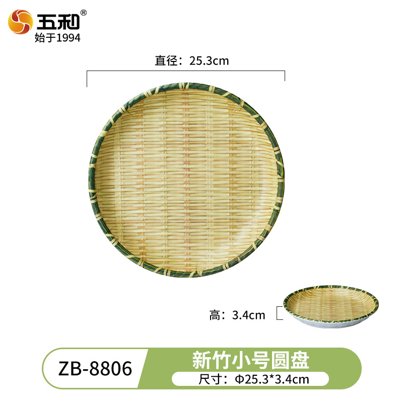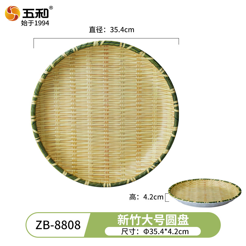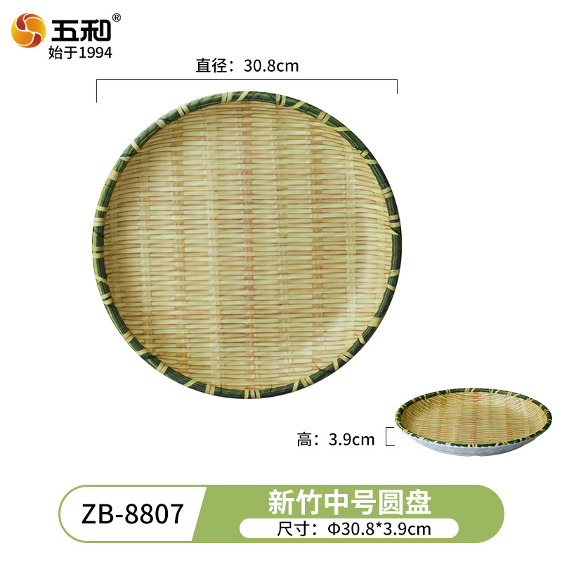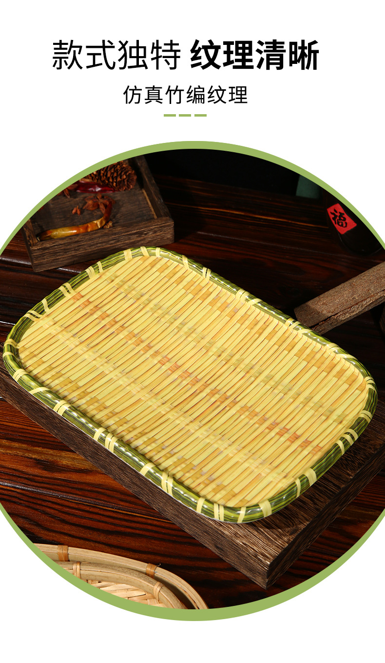 竹编、编织、簸箕、篮子、茶点盘、仿竹编圆盘火锅菜盘烧烤店专用盘创意小吃盘水果点心盘密胺餐具
