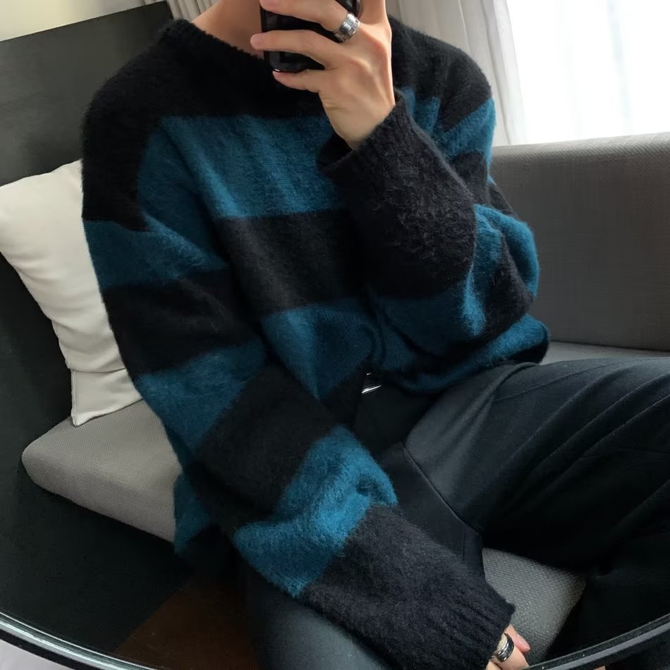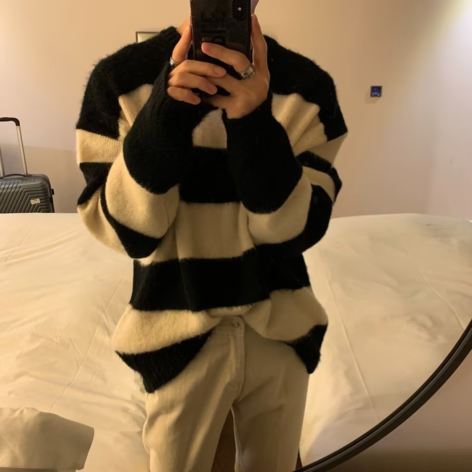 미국 복고풍 대비 색상 줄무늬 부드러운 찹쌀 스웨터 남성과 여성 디자인 감각 가을과 겨울 2024 새로운 느슨한 커플 스웨터스토어 가기