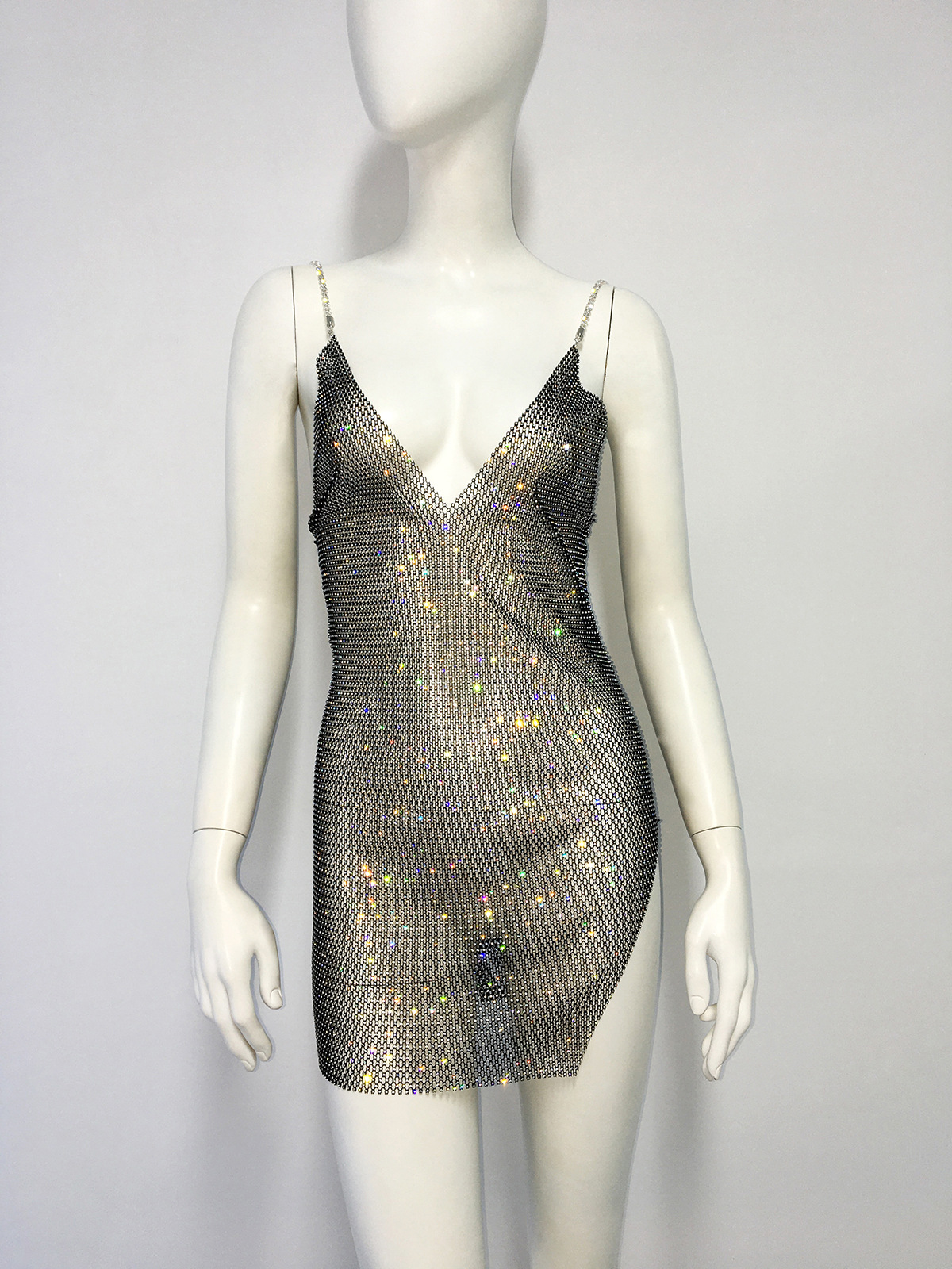 유럽과 미국의 패션 여성 의류 디자인 고급 메쉬 모조 다이아몬드 서스펜더 스커트 핫 소녀 섹시한 다이아몬드 체인 V 넥 원피스 여성