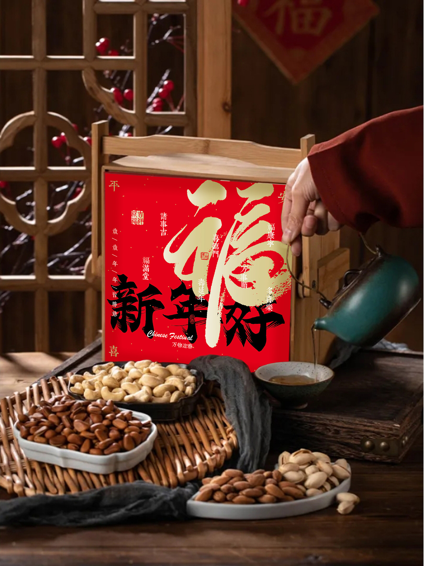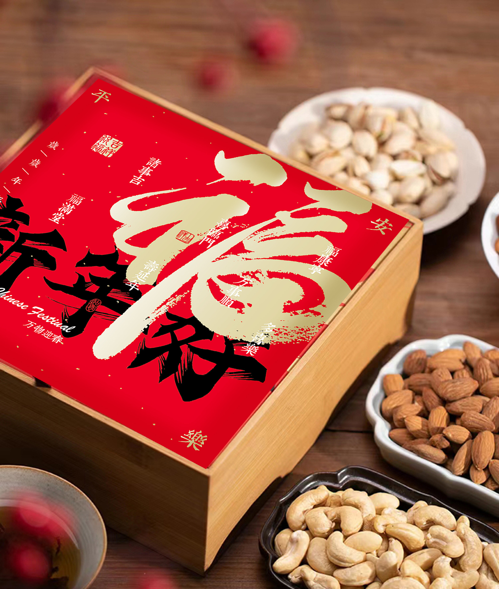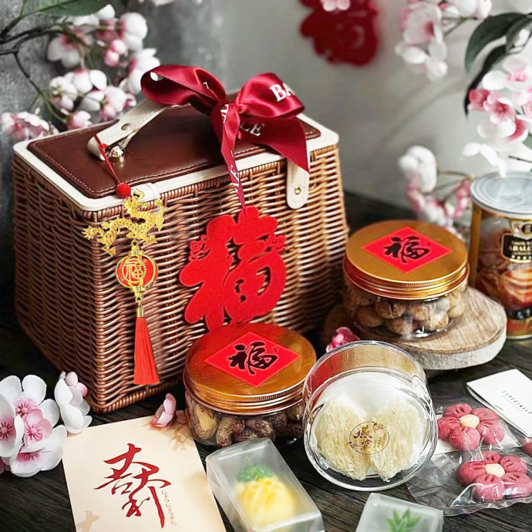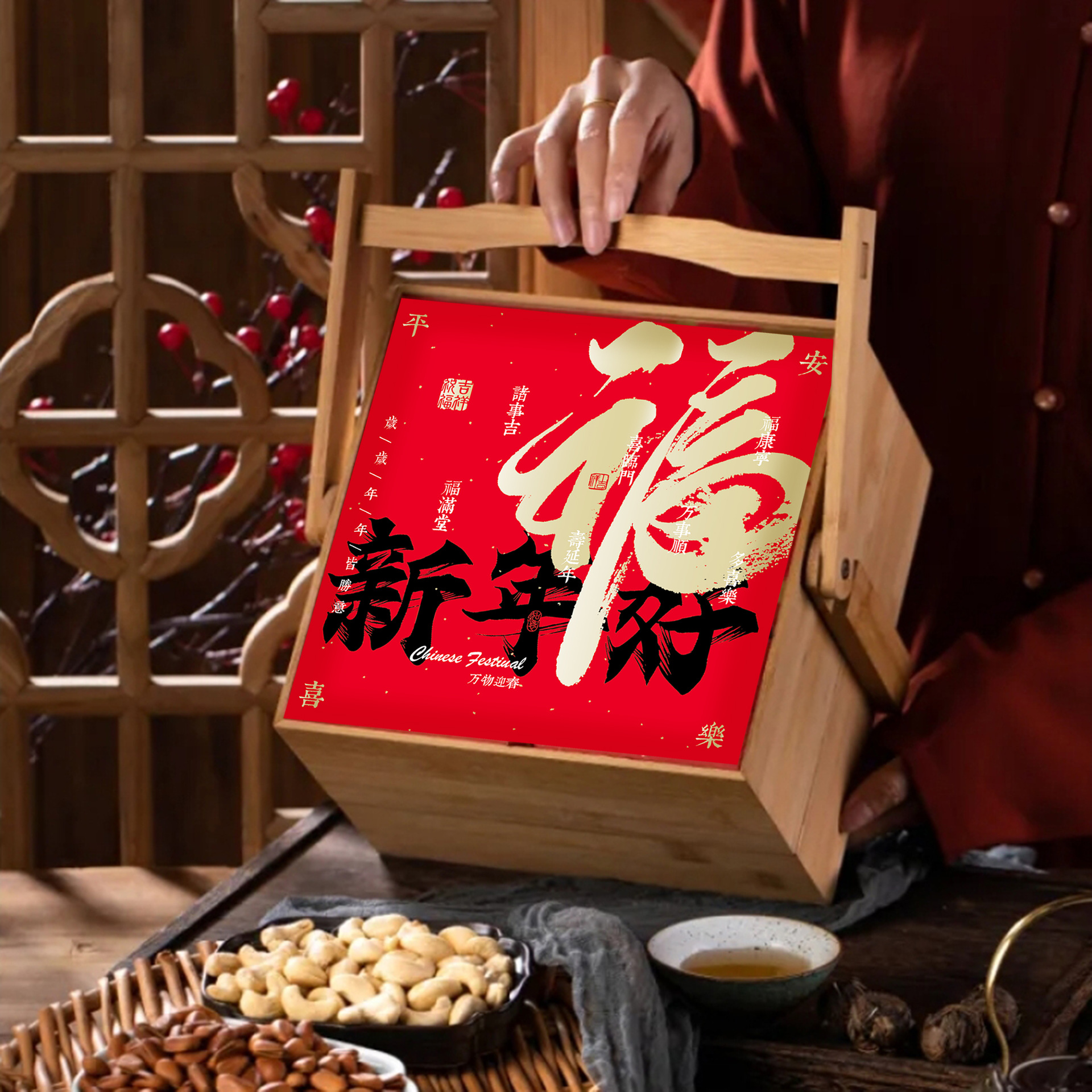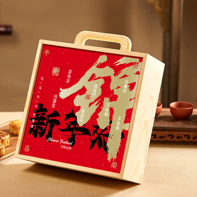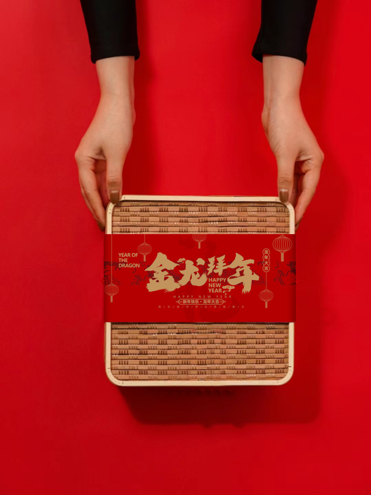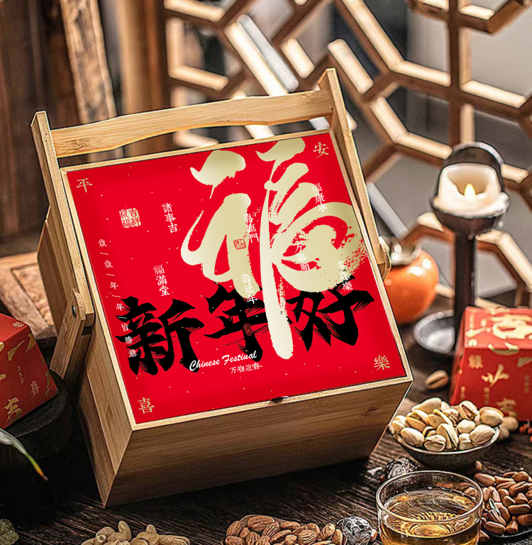 2024년 새해 나무 상자 차 포장 상자 견과류 식품 설날 특산품 선물 상자 연회 기념품 용년 볶음과자