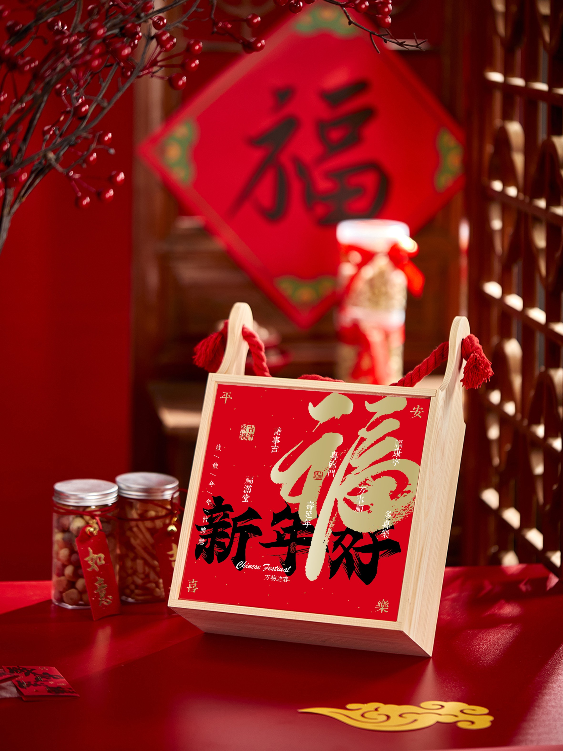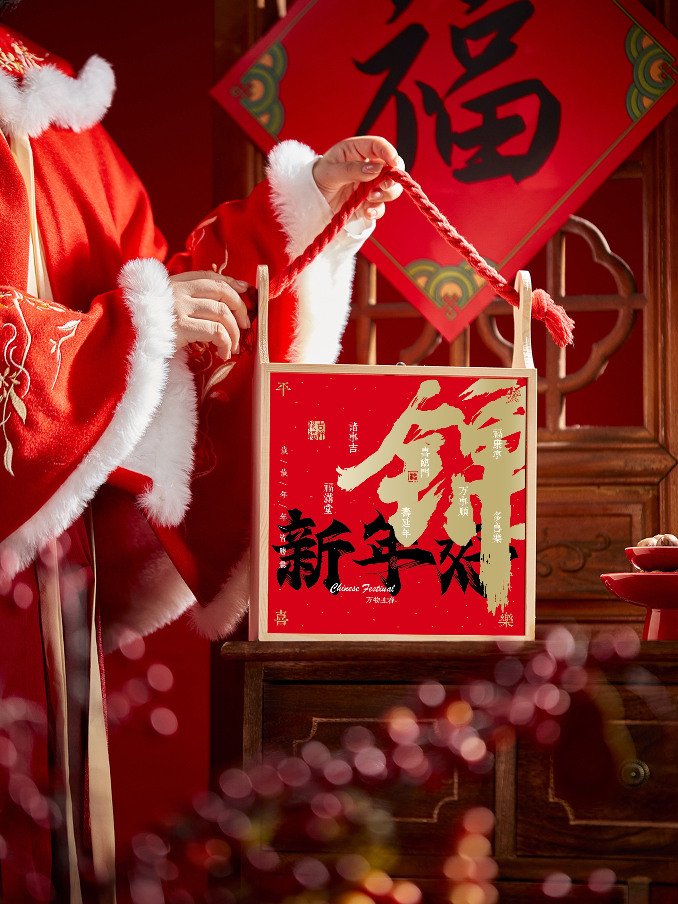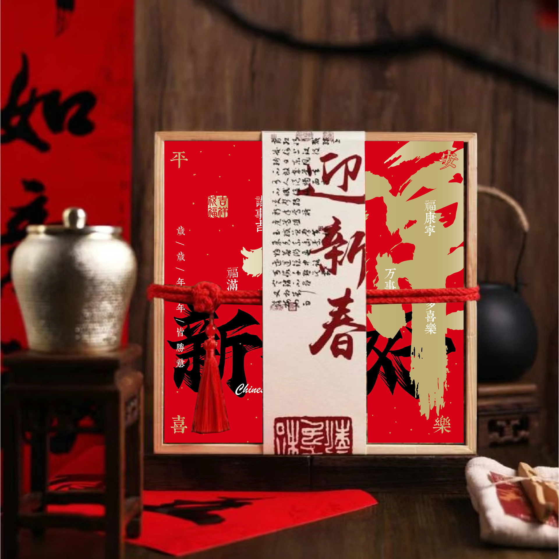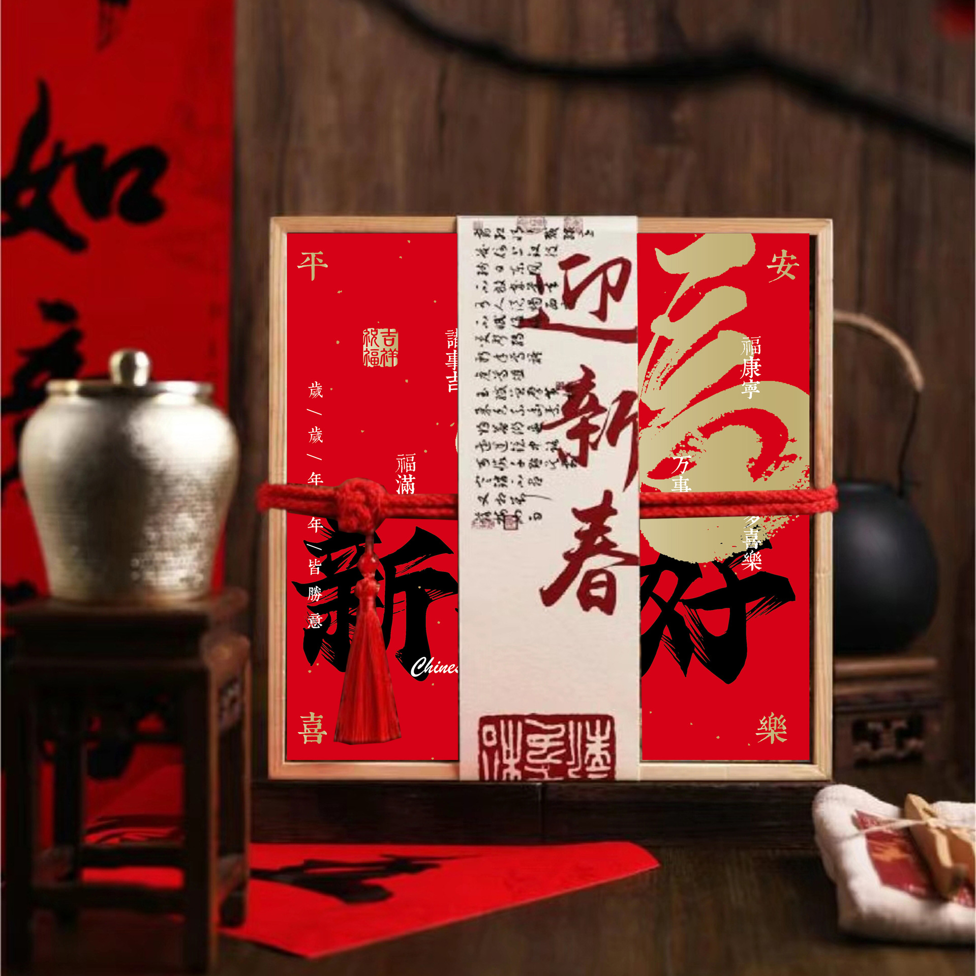 • 큰 빨간색 면 로프 손으로 들고 빈 나무 상자 + 새해 복 많이 받으세요 브로케이드 씰 * 나무 재료