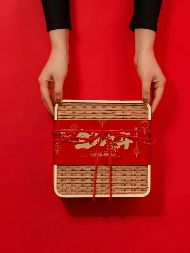 • 사각 대나무 빈 상자 + 황금 용 신년 인사 봉인 + 빨간색 가죽 밧줄 - 각 약 22*22*8.5cm* 목재 재료