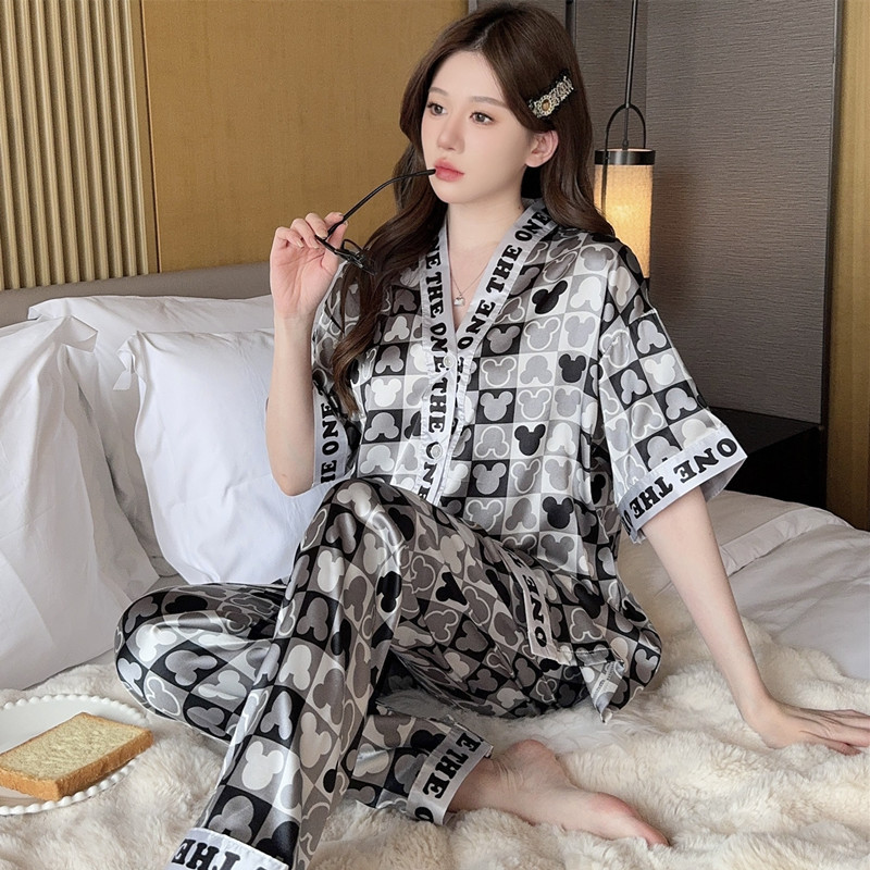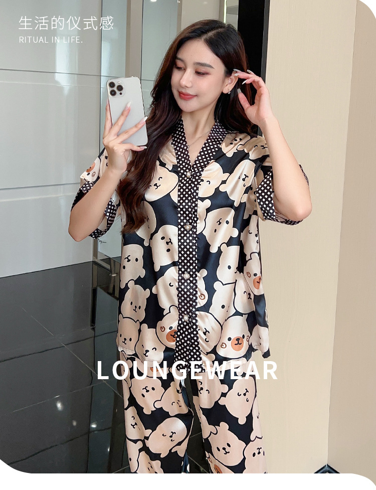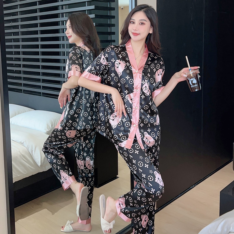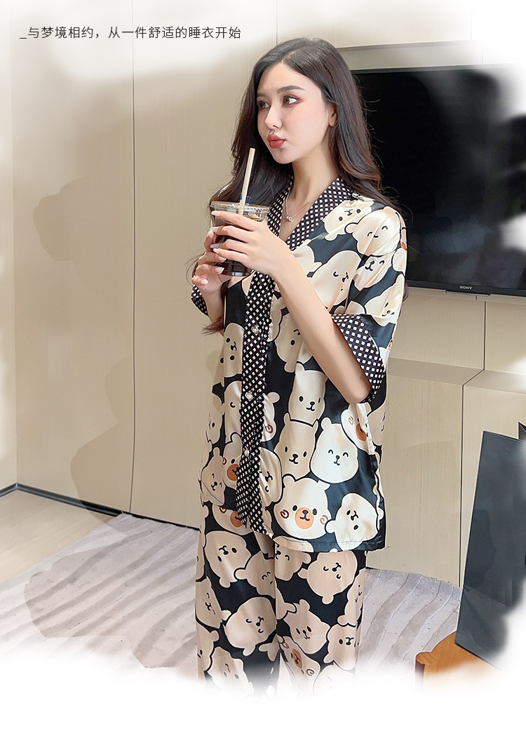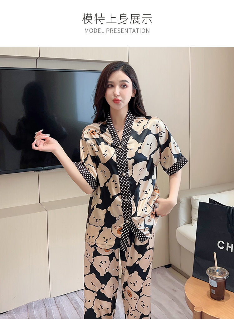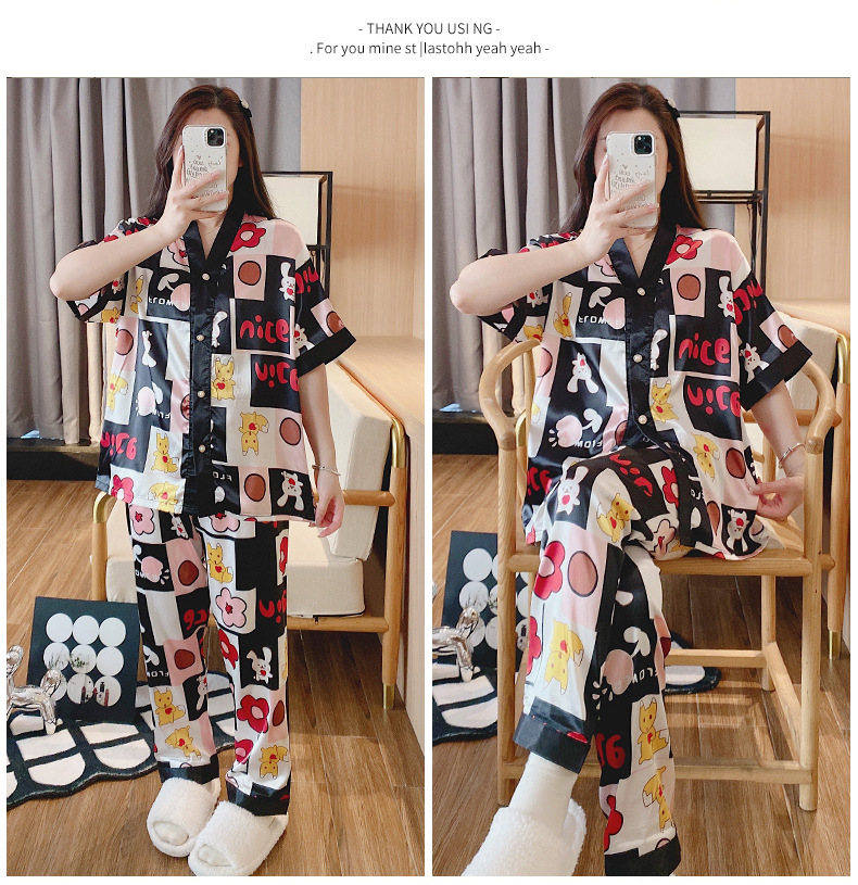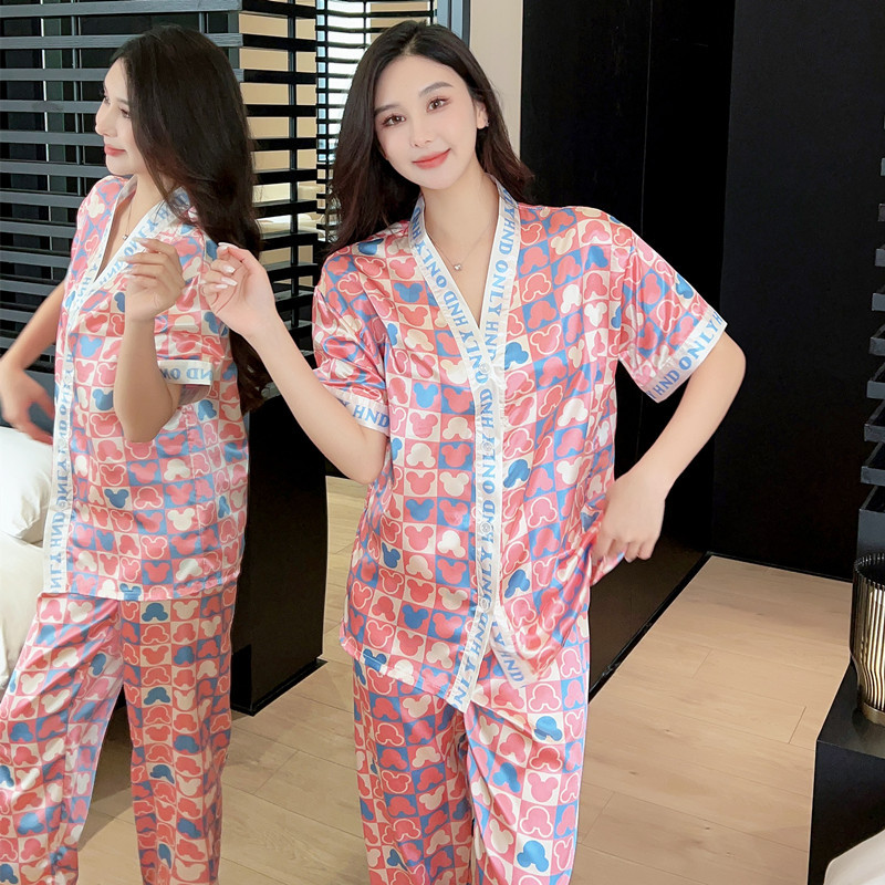 인도네시아와 태국 핫 아이스 실크 파자마 여성 여름 기모노 칼라 짧은 소매 바지 만화 세트 공장 아울렛