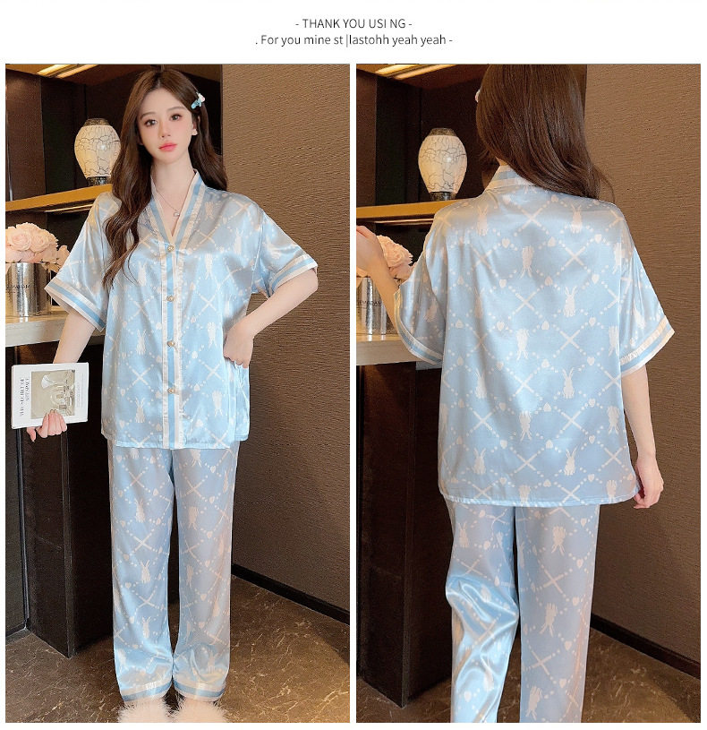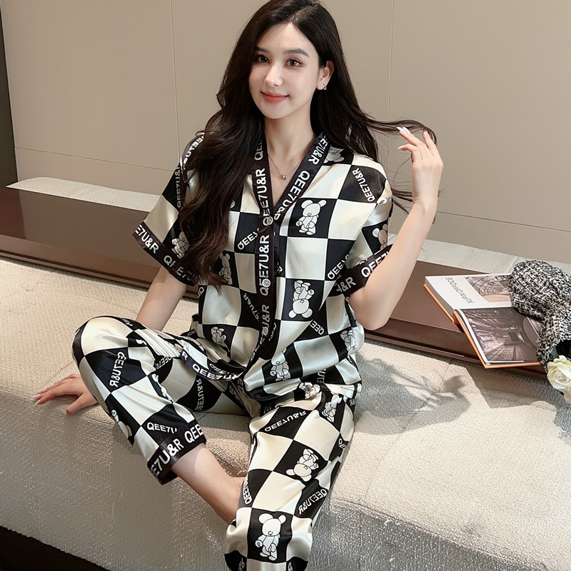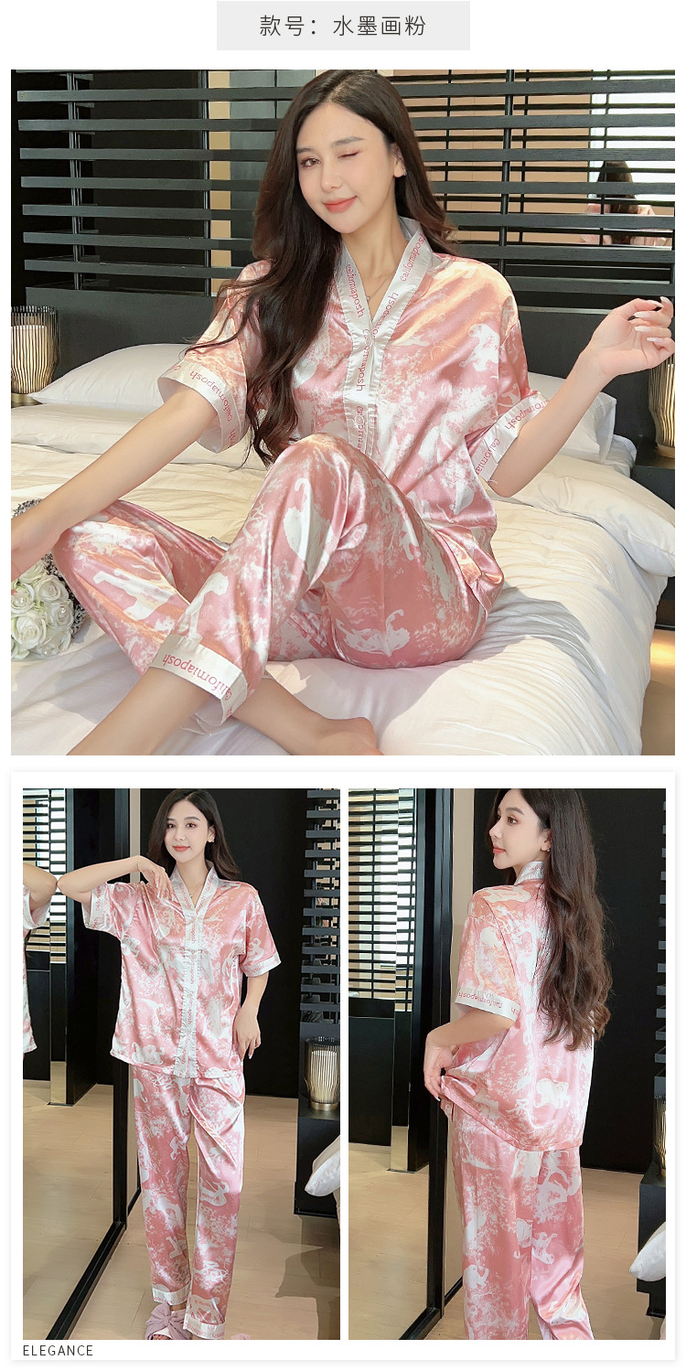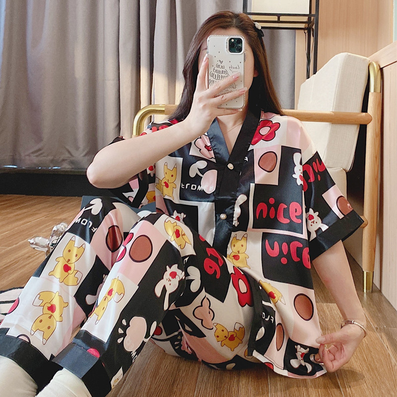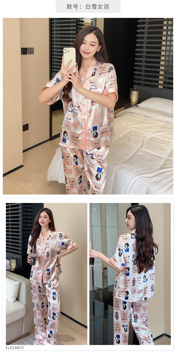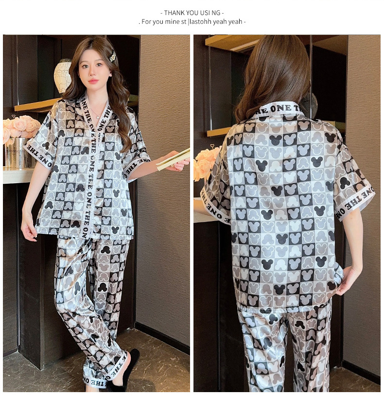 인도네시아와 태국 핫 아이스 실크 파자마 여성 여름 기모노 칼라 짧은 소매 바지 만화 세트 공장 아울렛