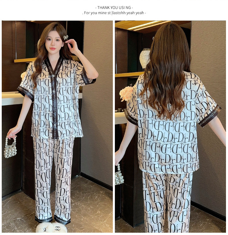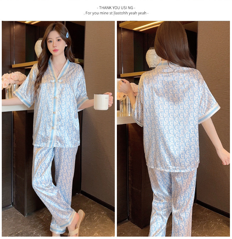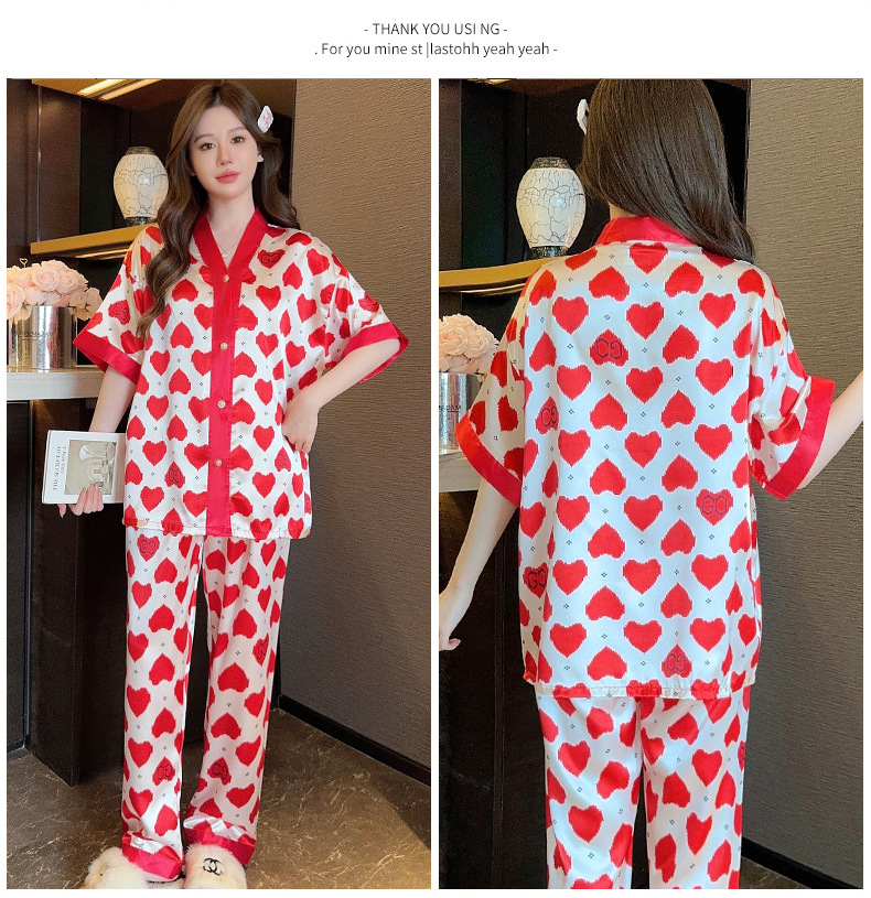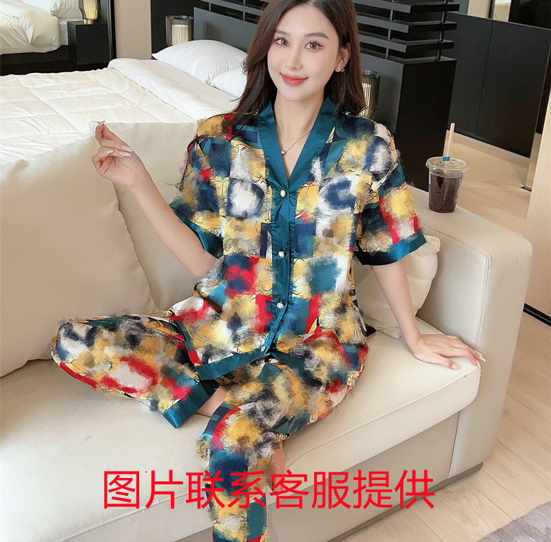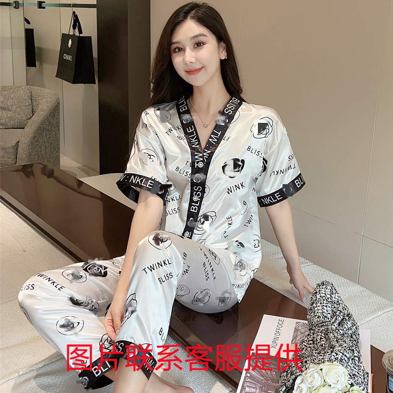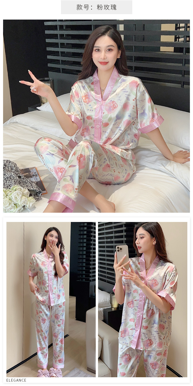 인도네시아와 태국 핫 아이스 실크 파자마 여성 여름 기모노 칼라 짧은 소매 바지 만화 세트 공장 아울렛