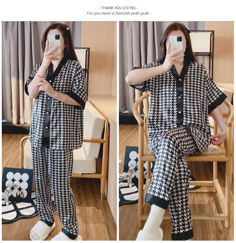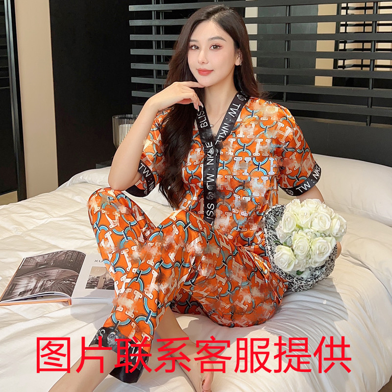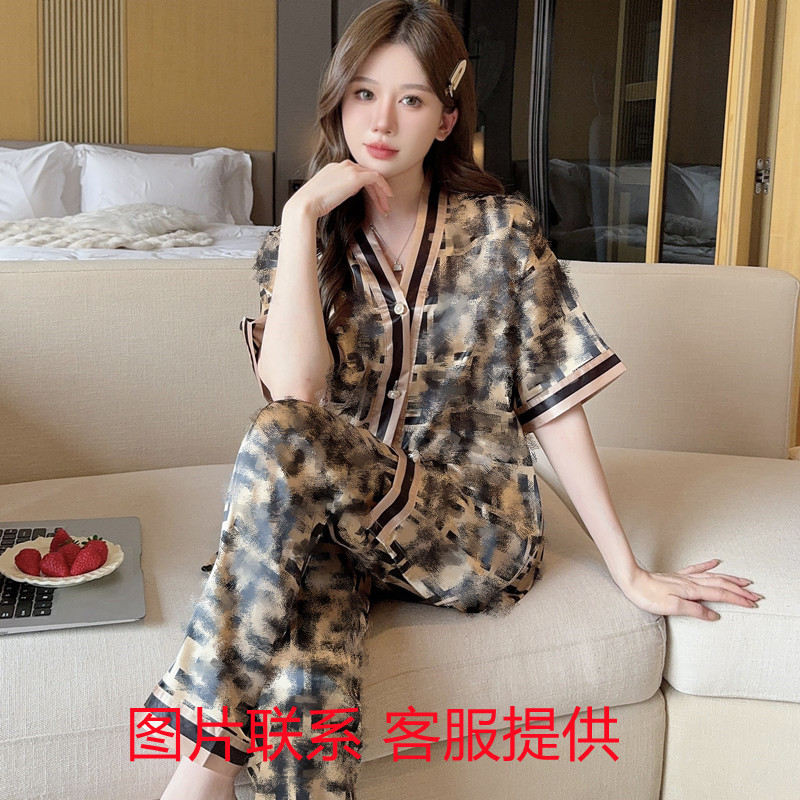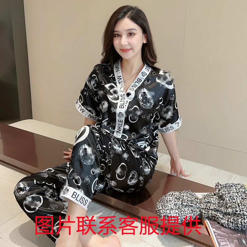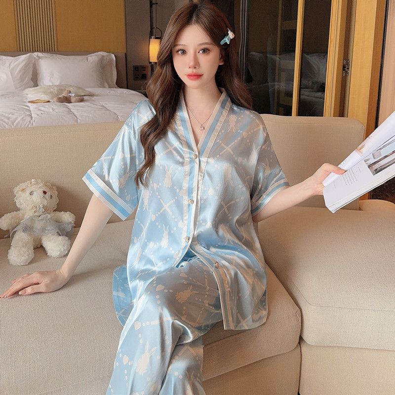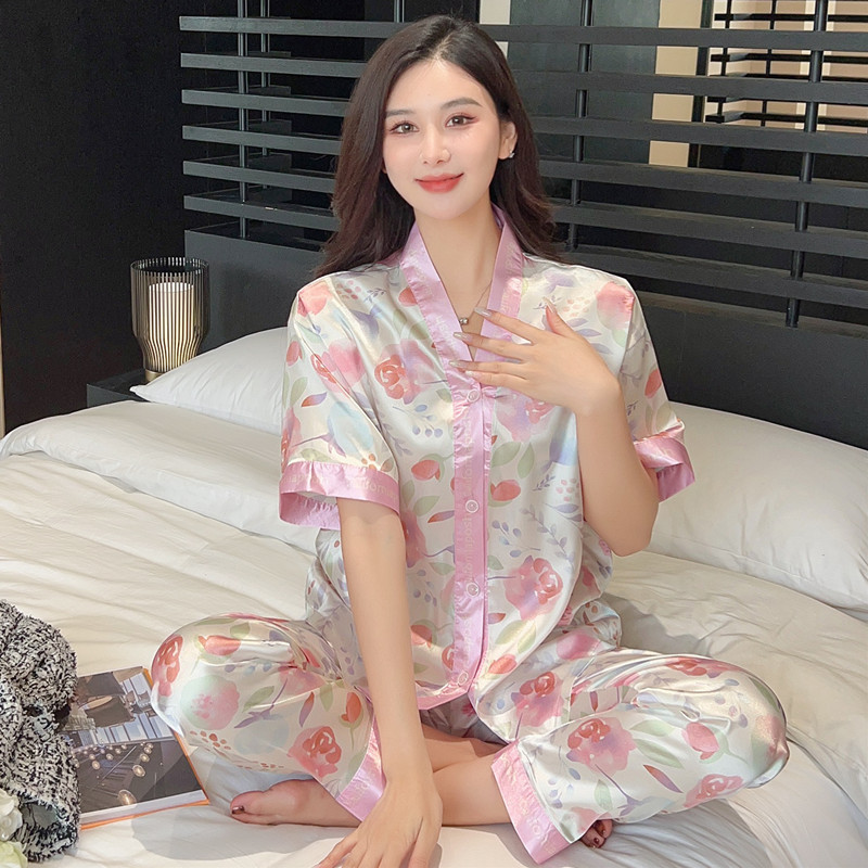 인도네시아와 태국 핫 아이스 실크 파자마 여성 여름 기모노 칼라 짧은 소매 바지 만화 세트 공장 아울렛스토어 가기