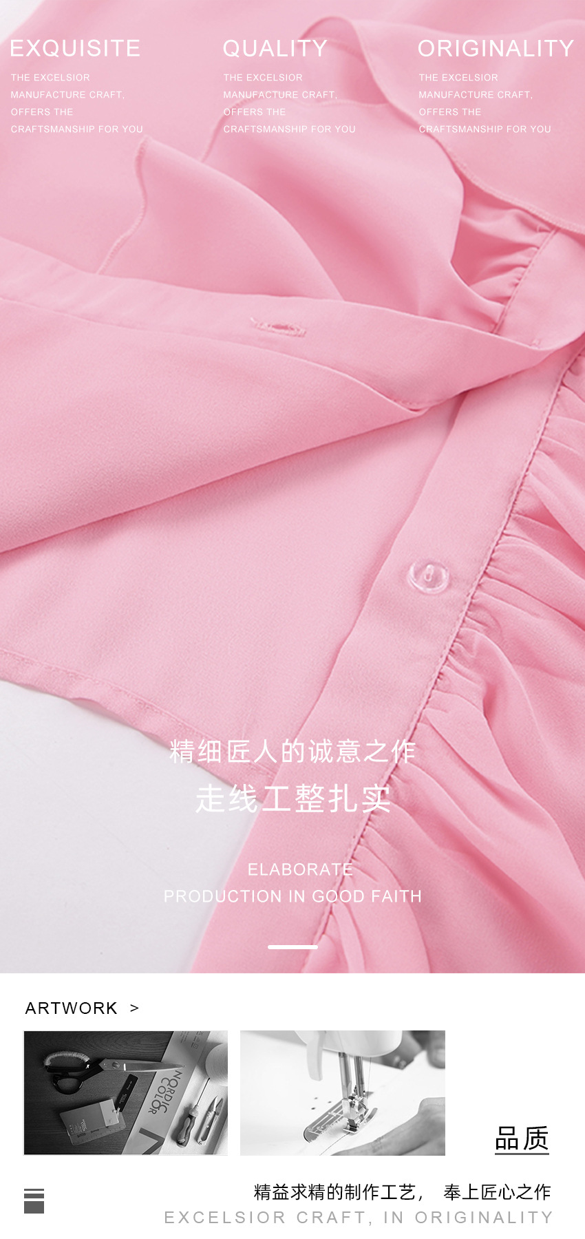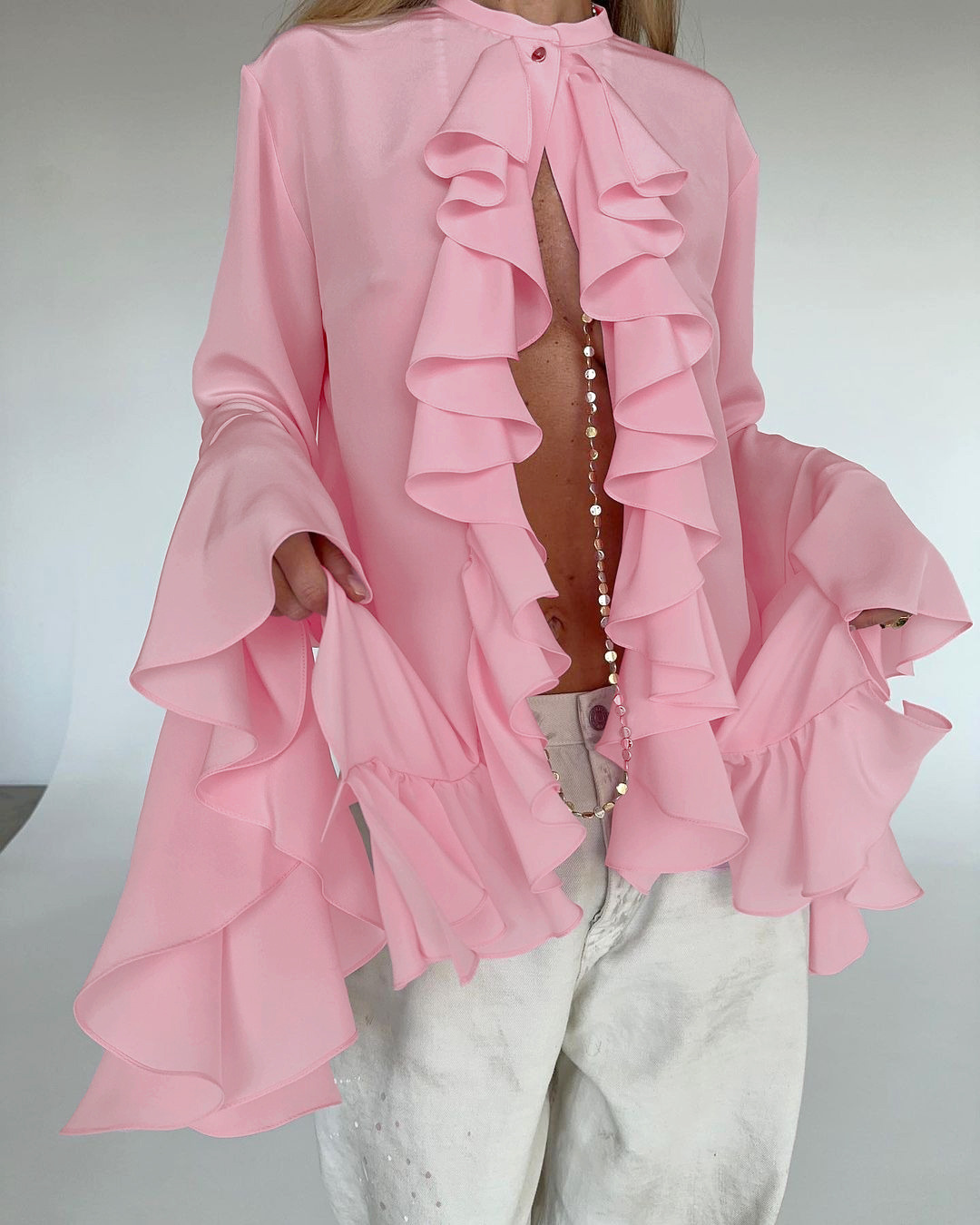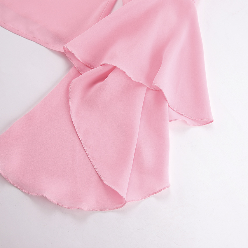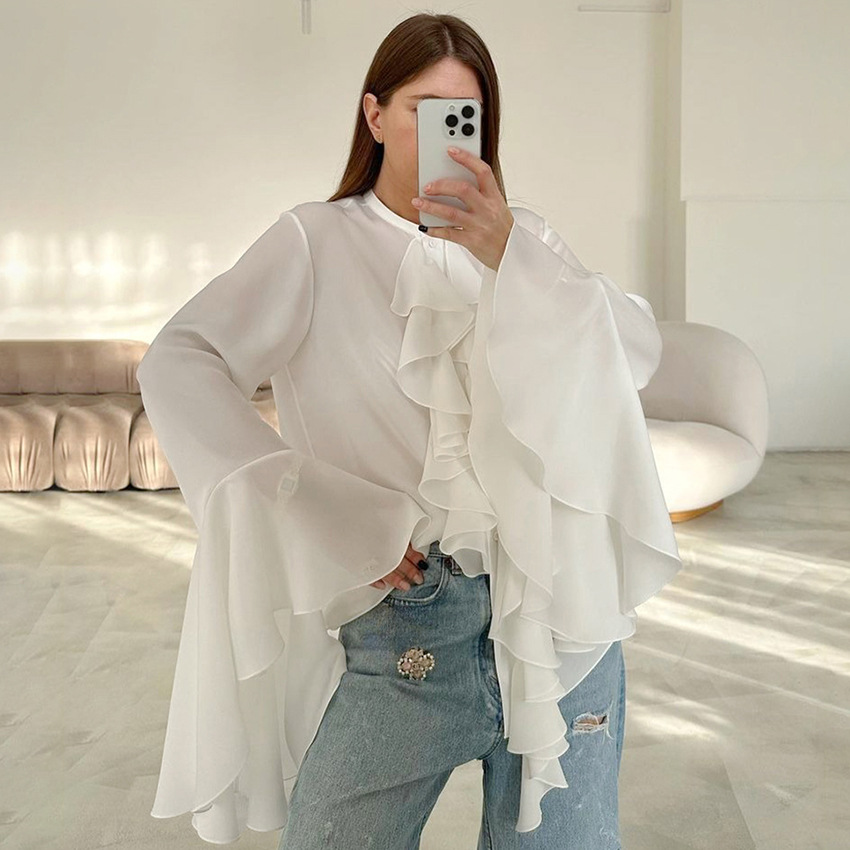 화이트 쉬폰 디자인 크루 넥 트럼펫 슬리브 러플 여성용 셔츠 2024 유럽과 미국의 봄과 여름 새로운 패션 여성스토어 가기