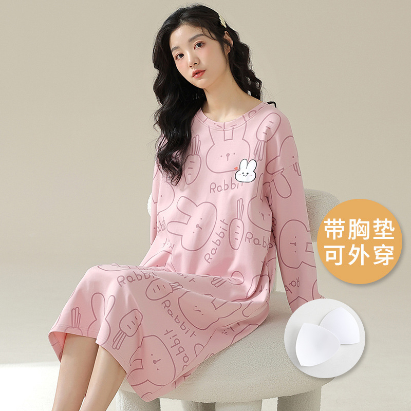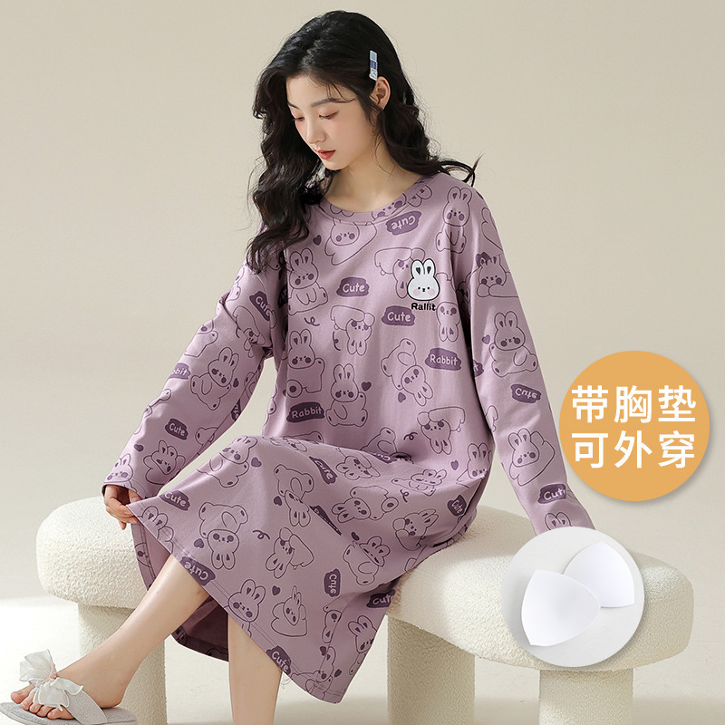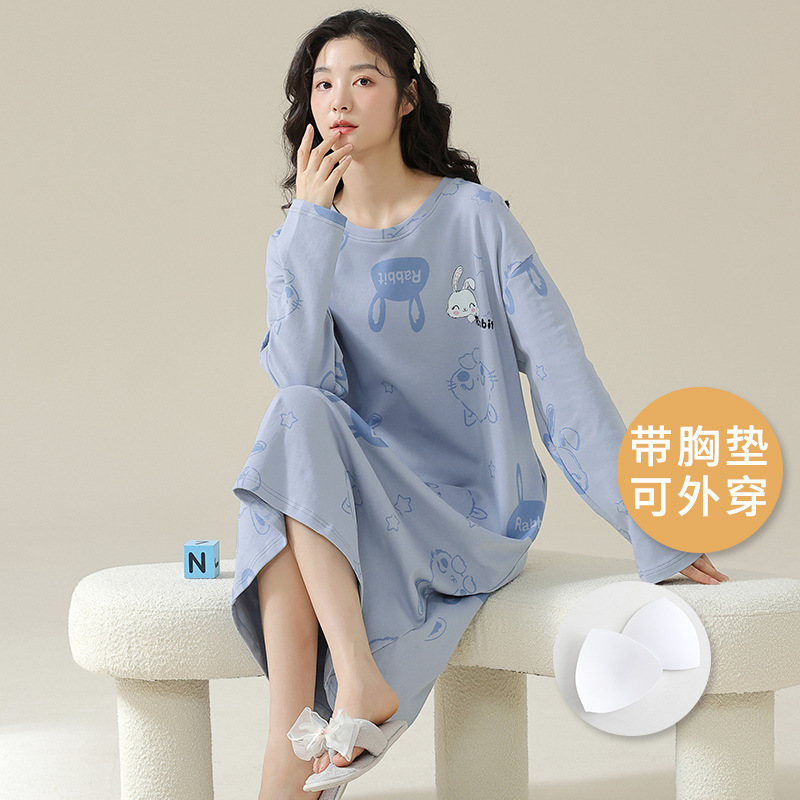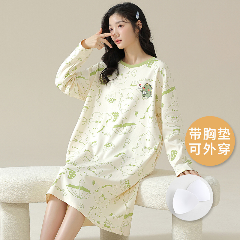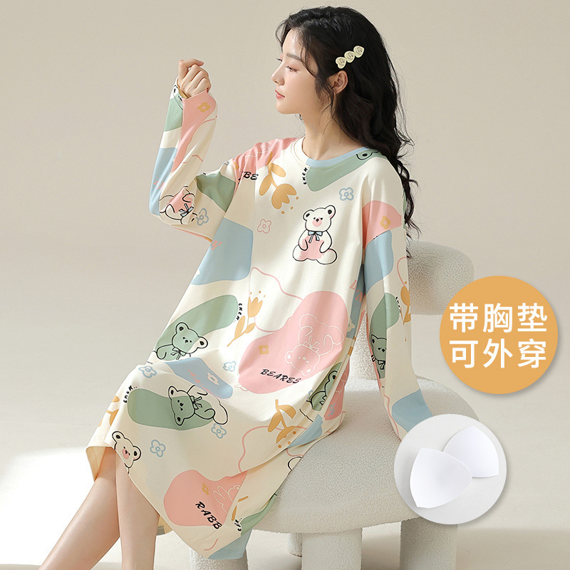 여성용 긴팔 나이트 드레스, 2024 가을 가슴 패드가 달린 얇은면 파자마 홈 착용 봄, 가을, 겨울 세트스토어 가기