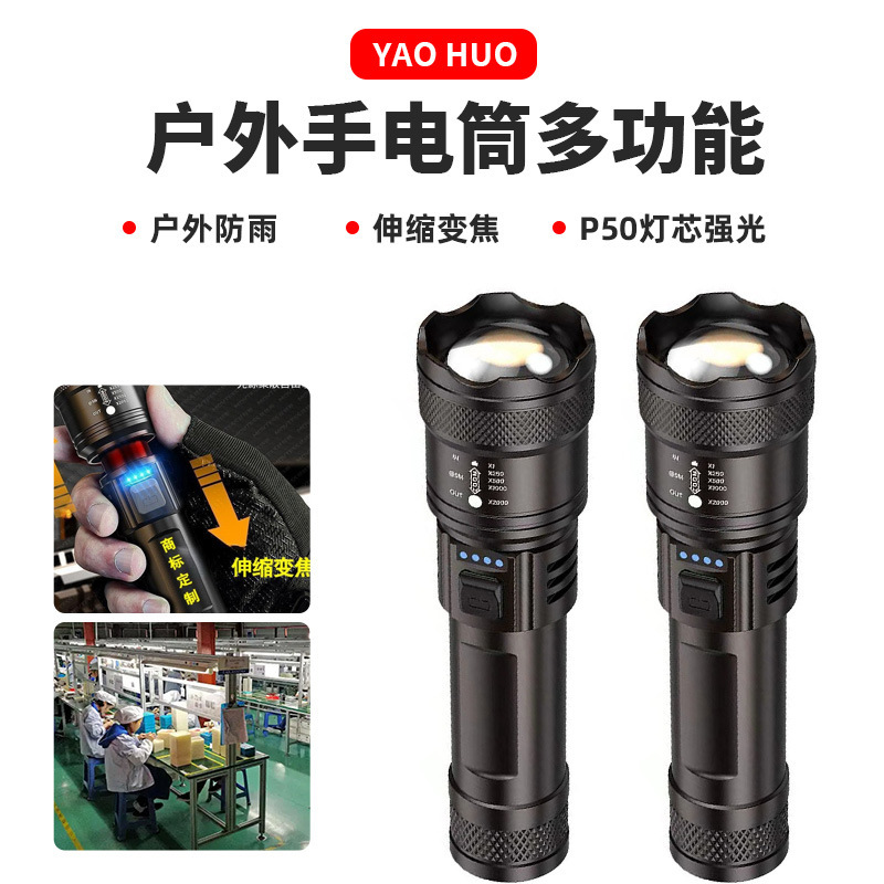 국경 옥외 강한 빛 손전등 다기능 텔레스코픽 줌 조명 P50 윅 강한 빛 손전등 높은 전력스토어 가기
