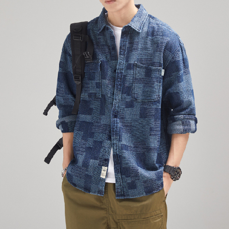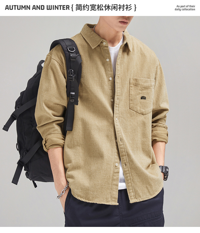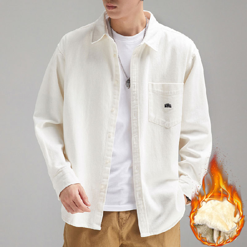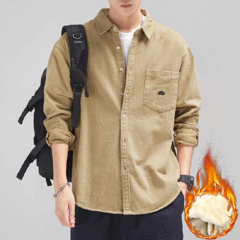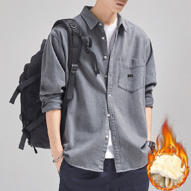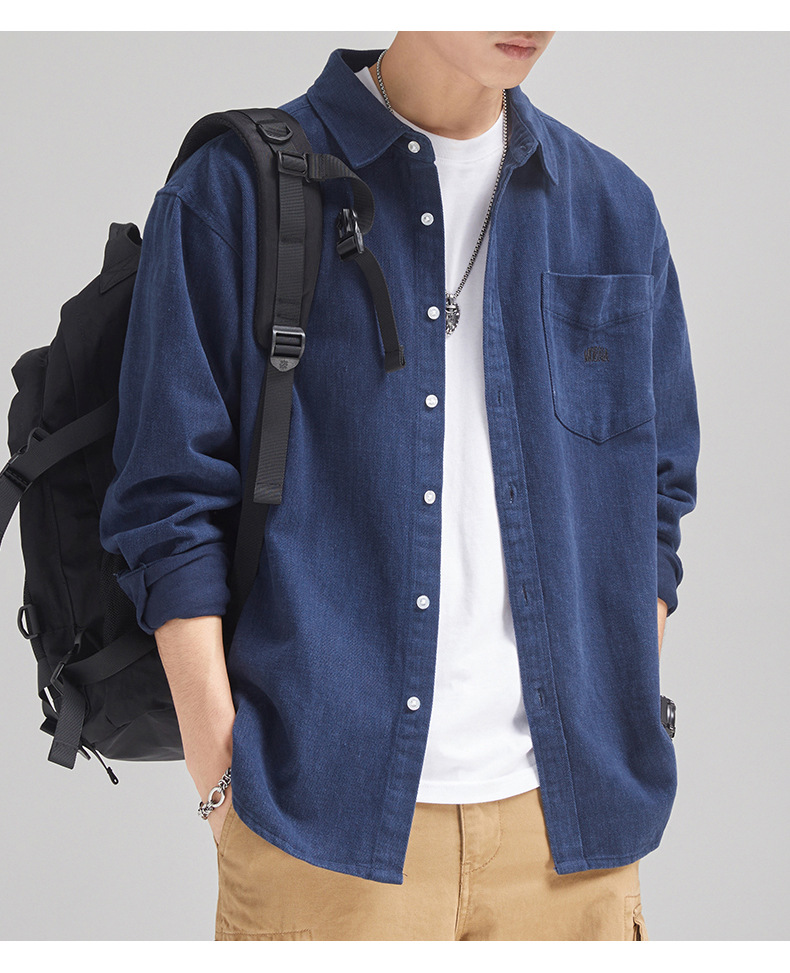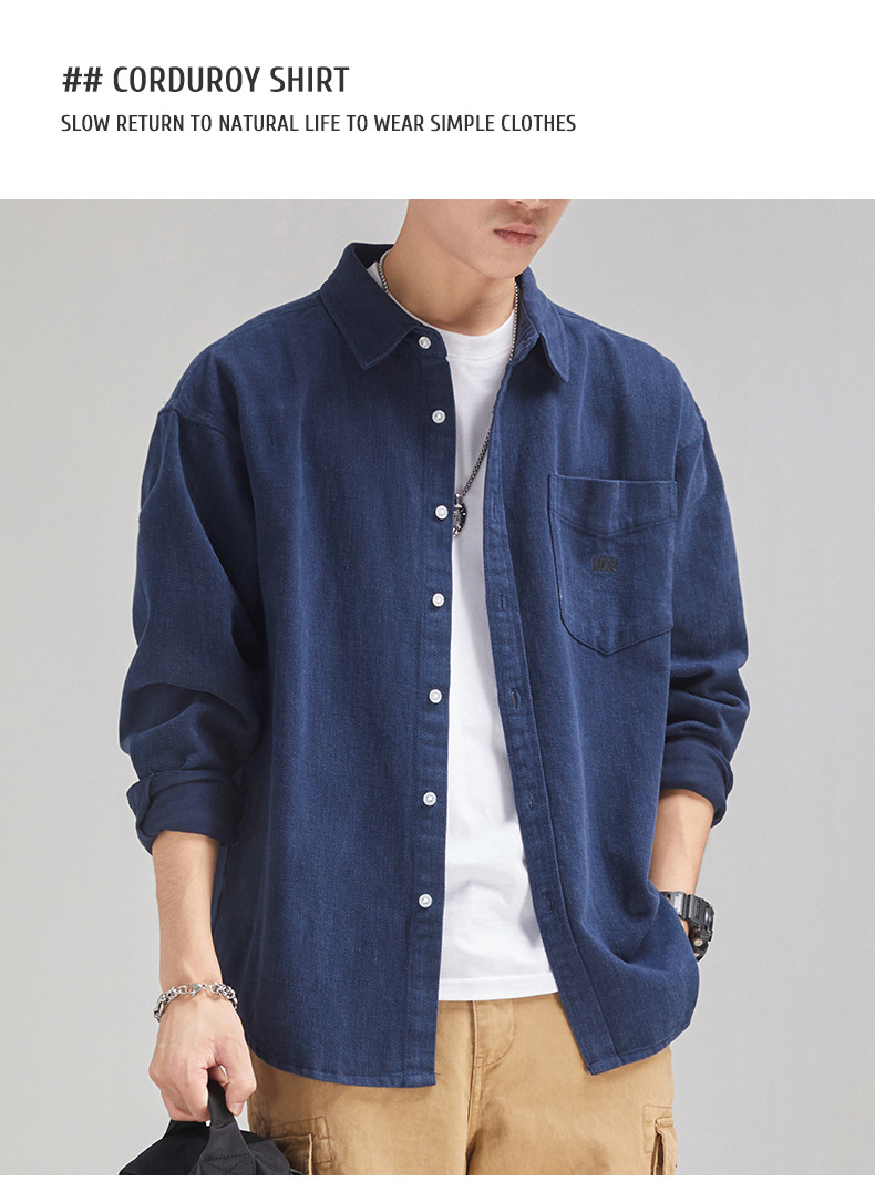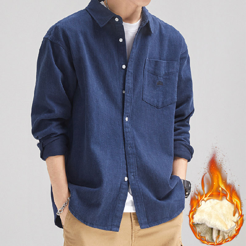 가을 겨울용 벨벳 안감 두꺼운 네이비 블루 아메리칸 레트로 셔츠 남성용 루즈핏 일본풍 워크웨어 스타일 캐주얼 셔츠 자켓스토어 가기