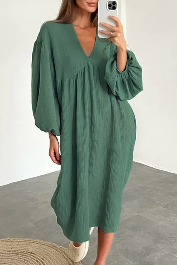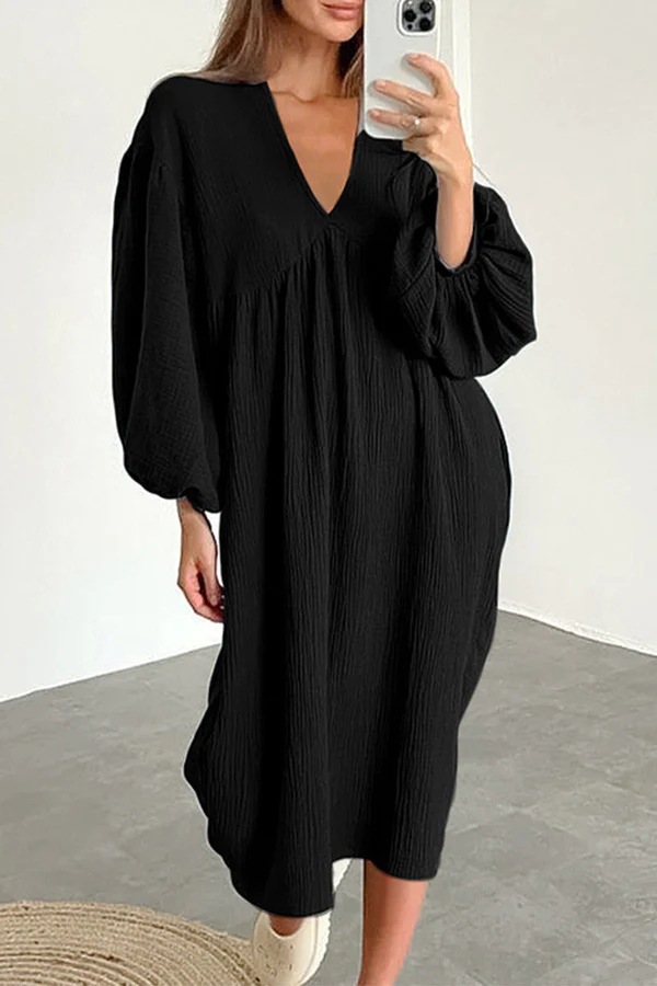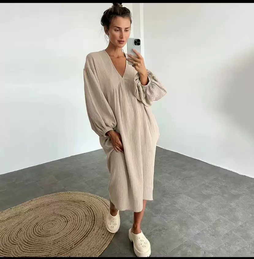 2023 아마존 AliExpress 독립 역 새로운 레저 생활 단색 포켓 V 넥 긴 소매 원피스