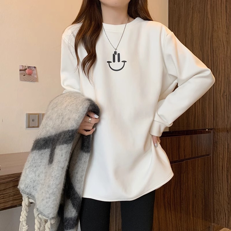 웃는 얼굴 자수 기모 흰색 중간 길이의 바닥 셔츠 여성의 가을과 겨울 내복 새로운 느슨한 배꼽 커버 슬리밍 탑 착용