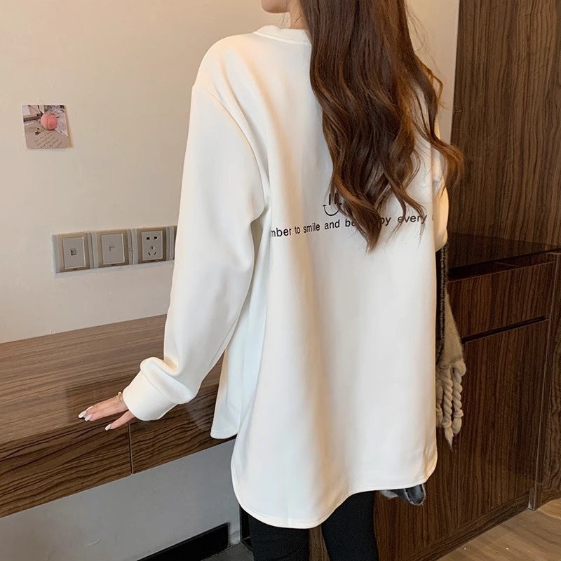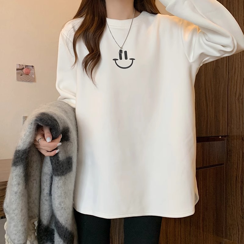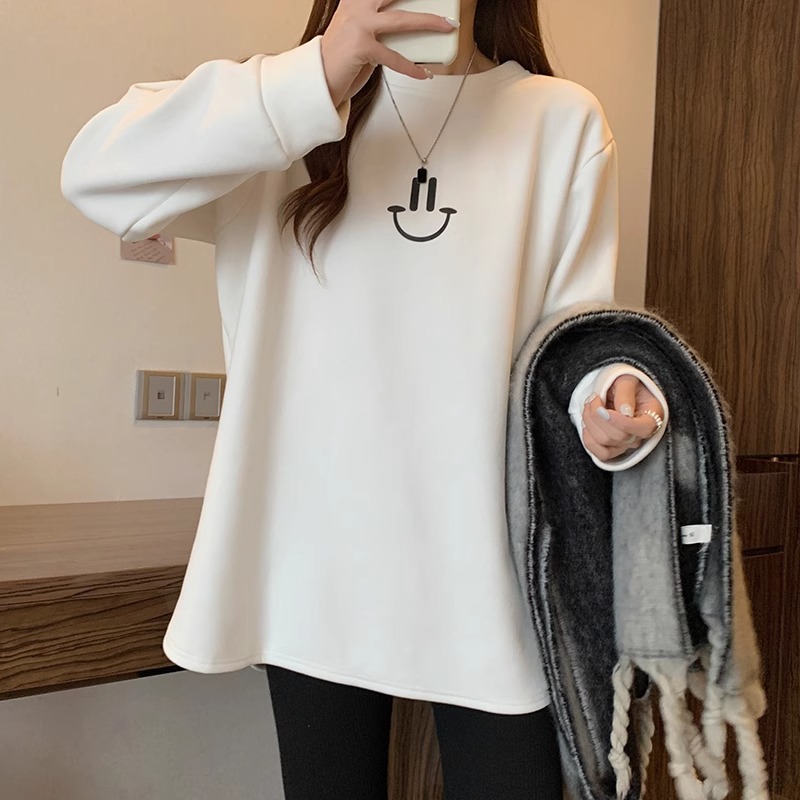 웃는 얼굴 자수 기모 흰색 중간 길이의 바닥 셔츠 여성의 가을과 겨울 내복 새로운 느슨한 배꼽 커버 슬리밍 탑 착용스토어 가기