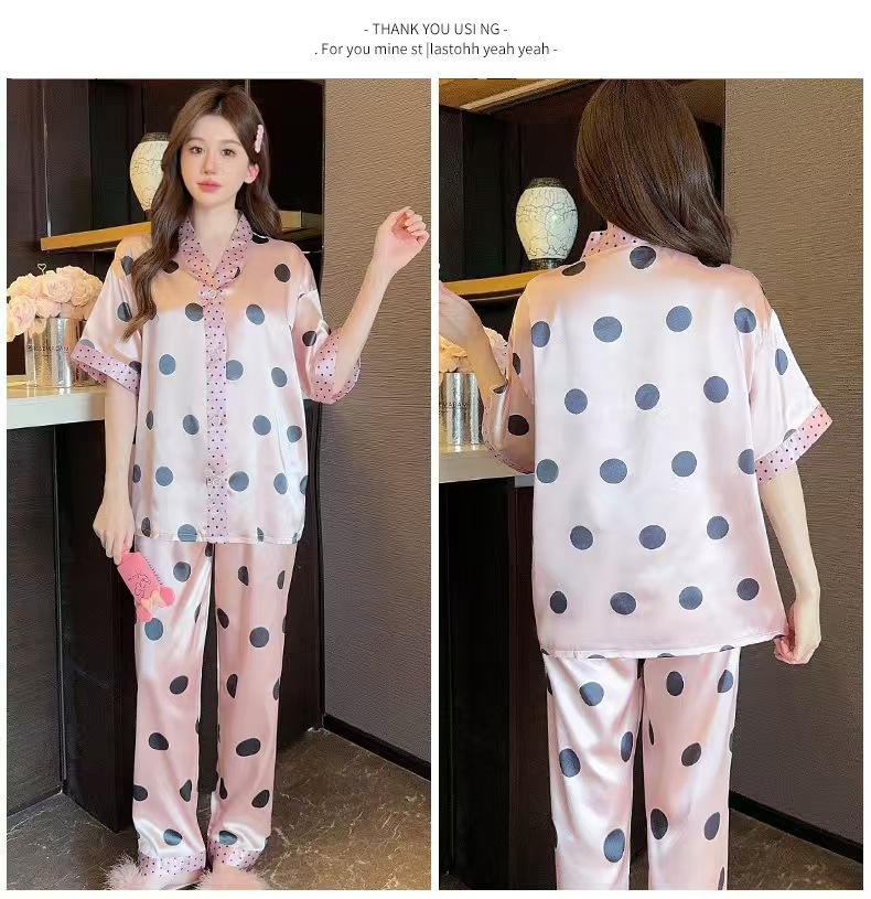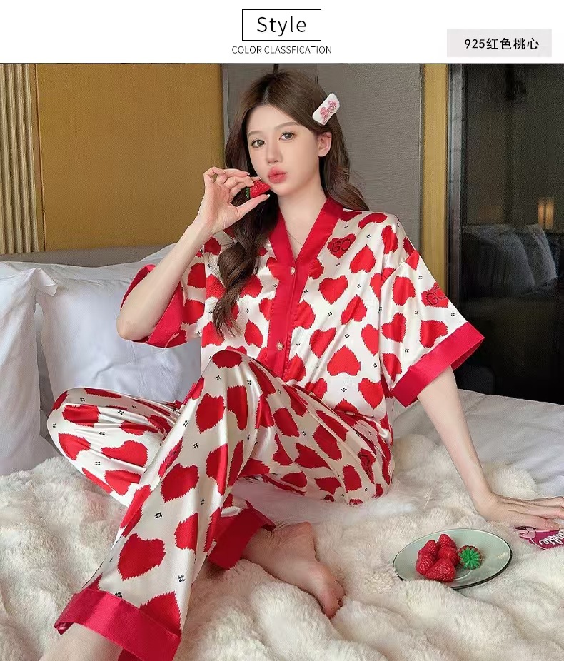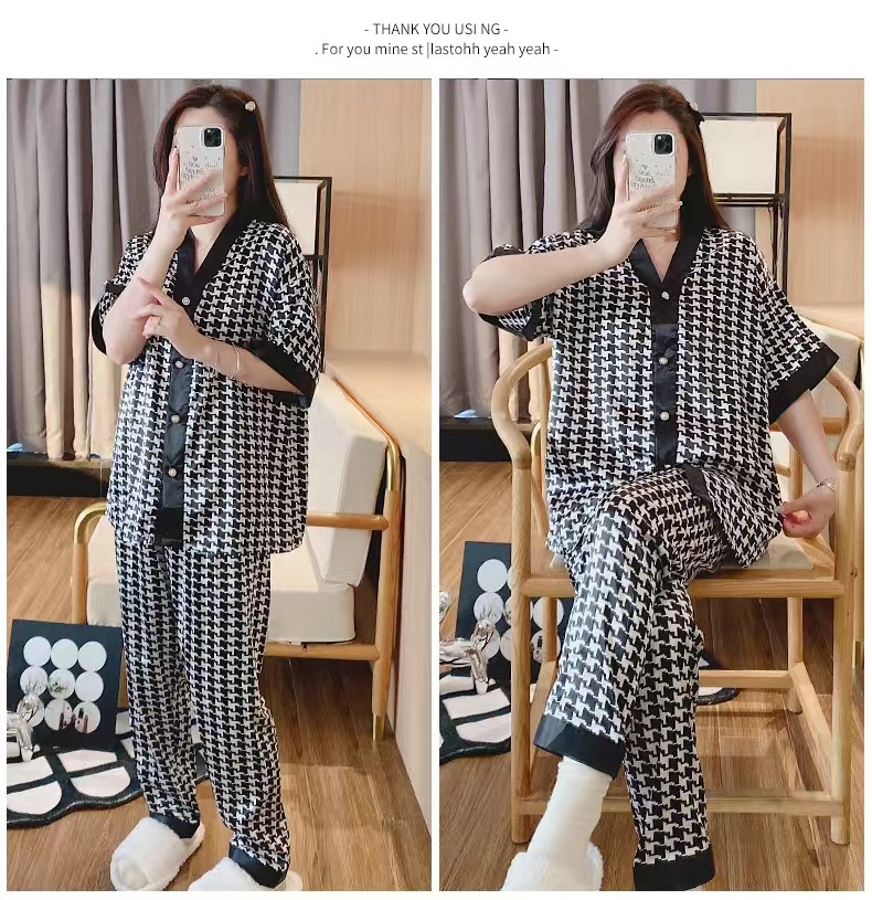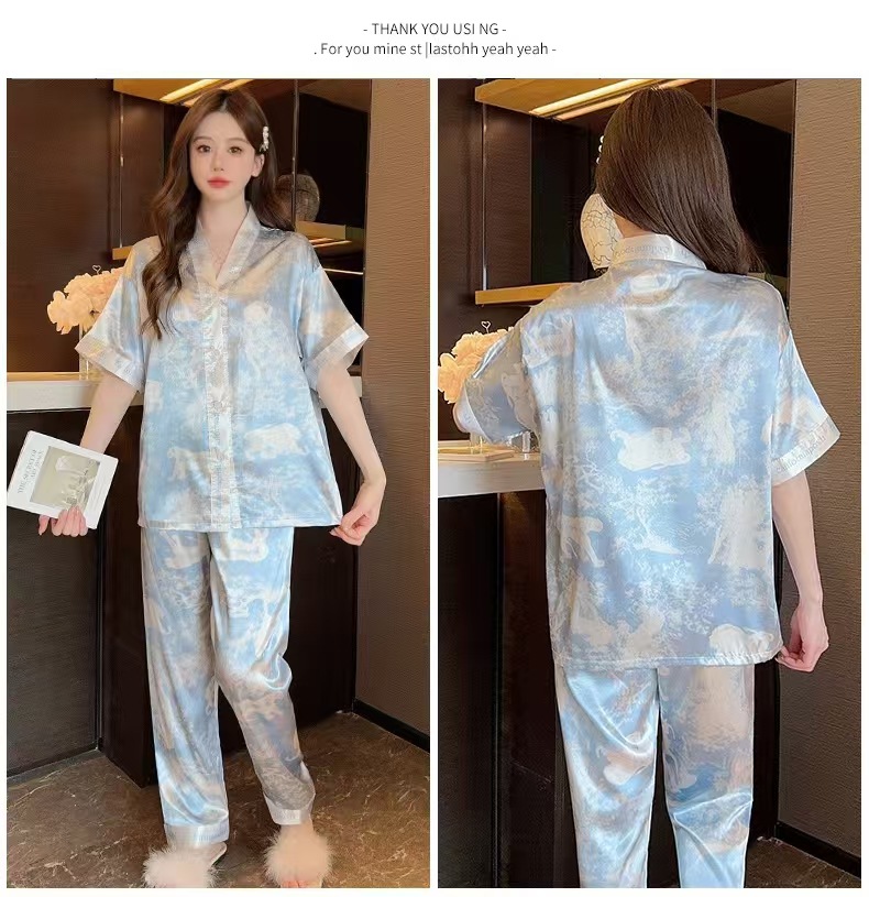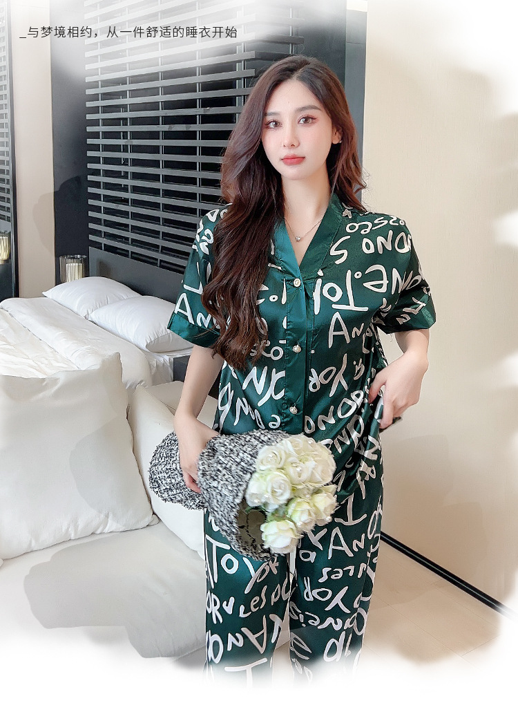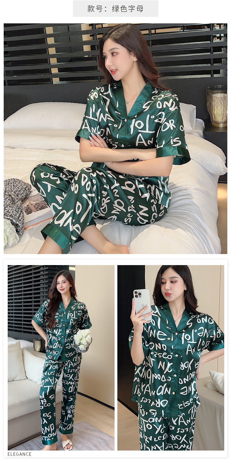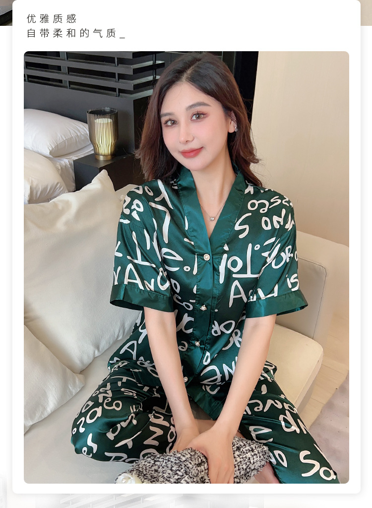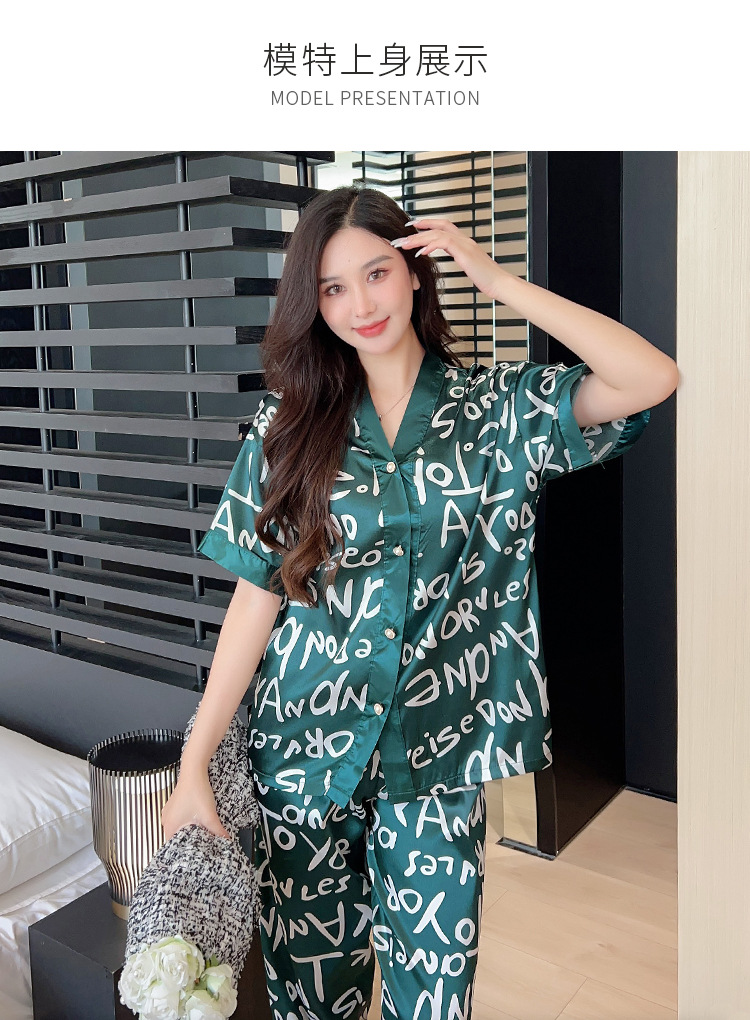 고급 아이스 실크 파자마 여성 여름 반팔 바지 카디건 V 넥 편지 인쇄 캐주얼 럭셔리 홈 의류 세트