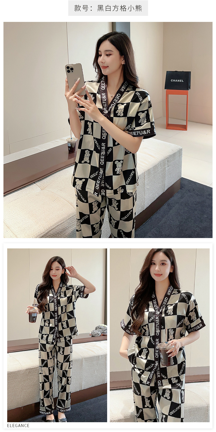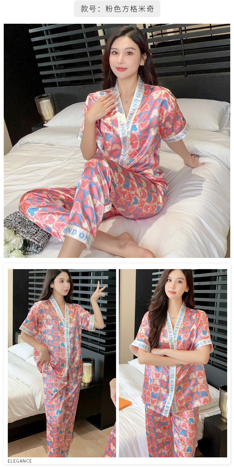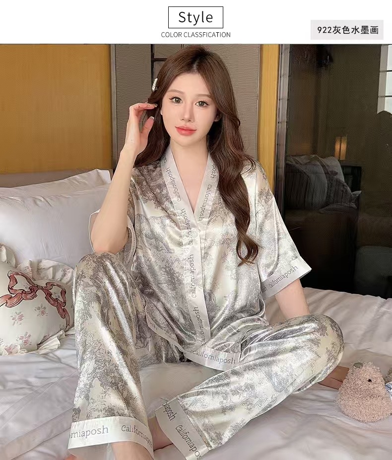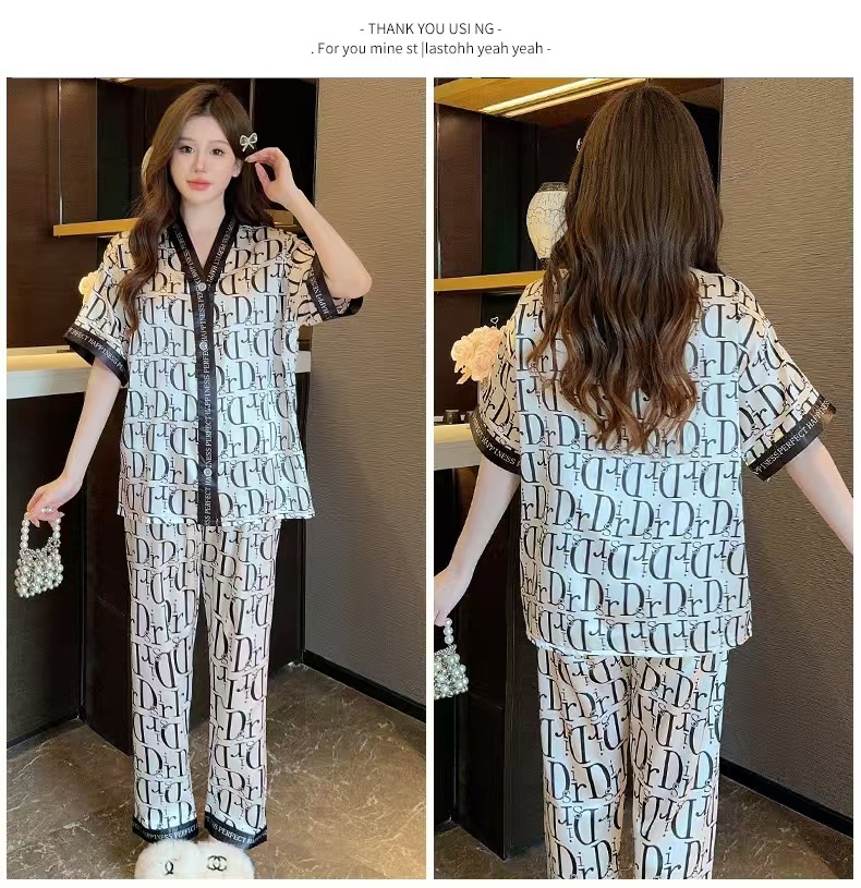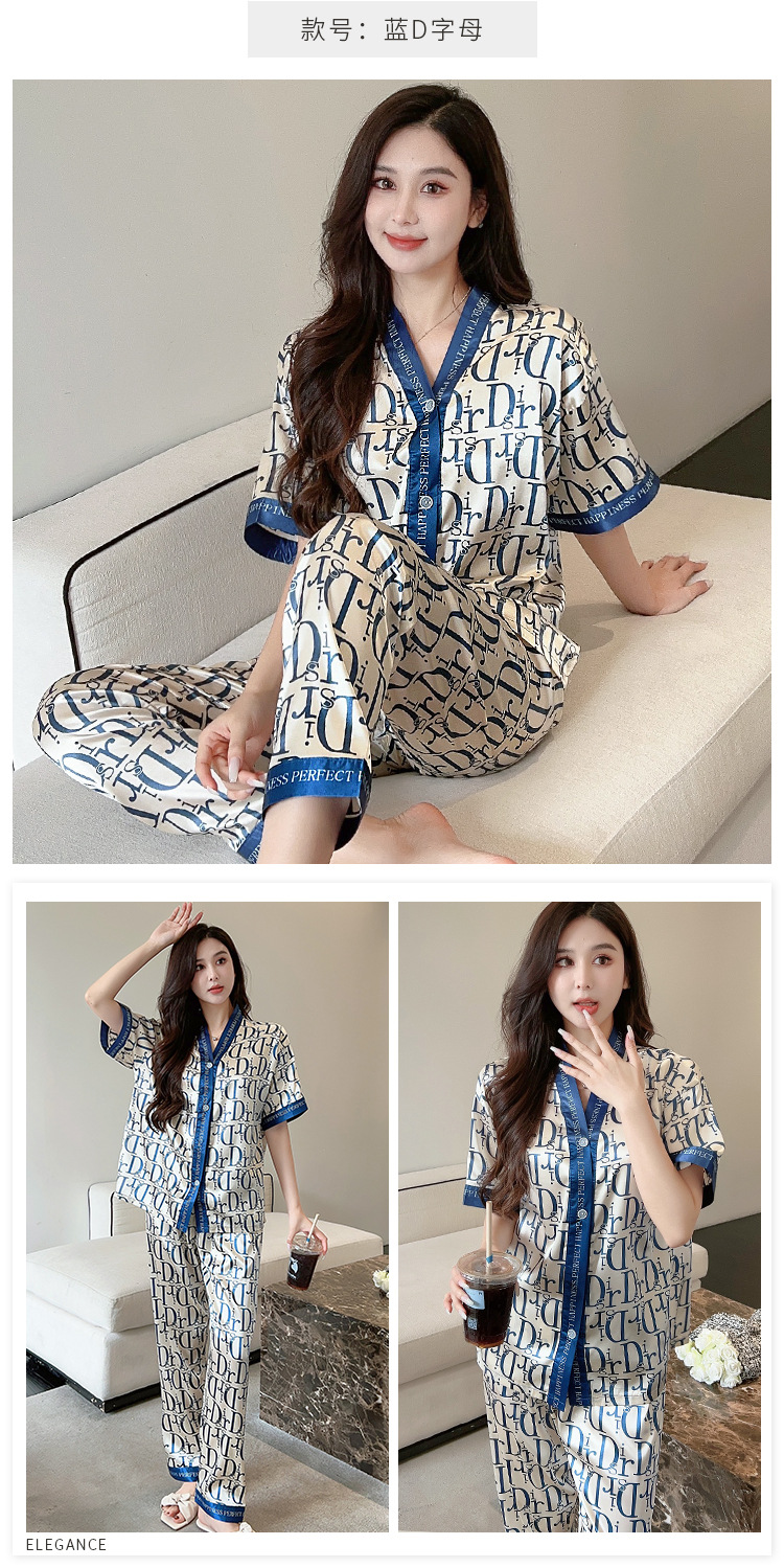 고급 아이스 실크 파자마 여성 여름 반팔 바지 카디건 V 넥 편지 인쇄 캐주얼 럭셔리 홈 의류 세트스토어 가기
