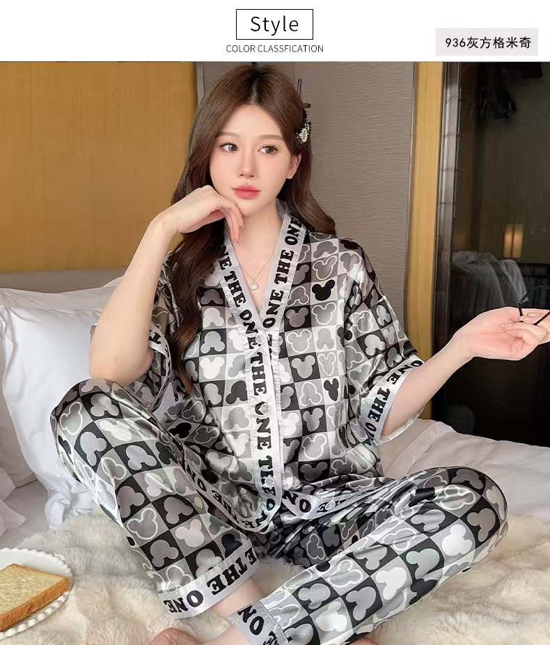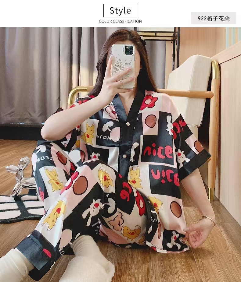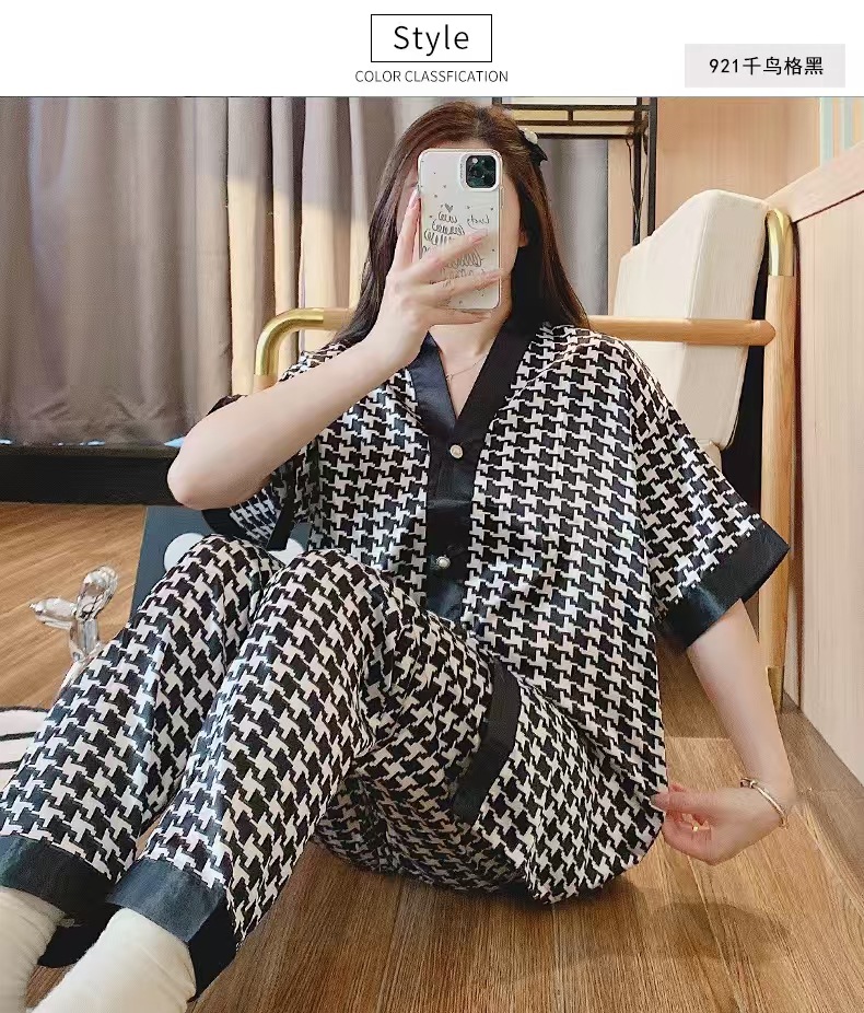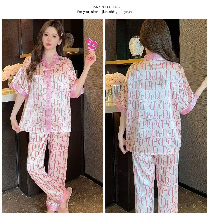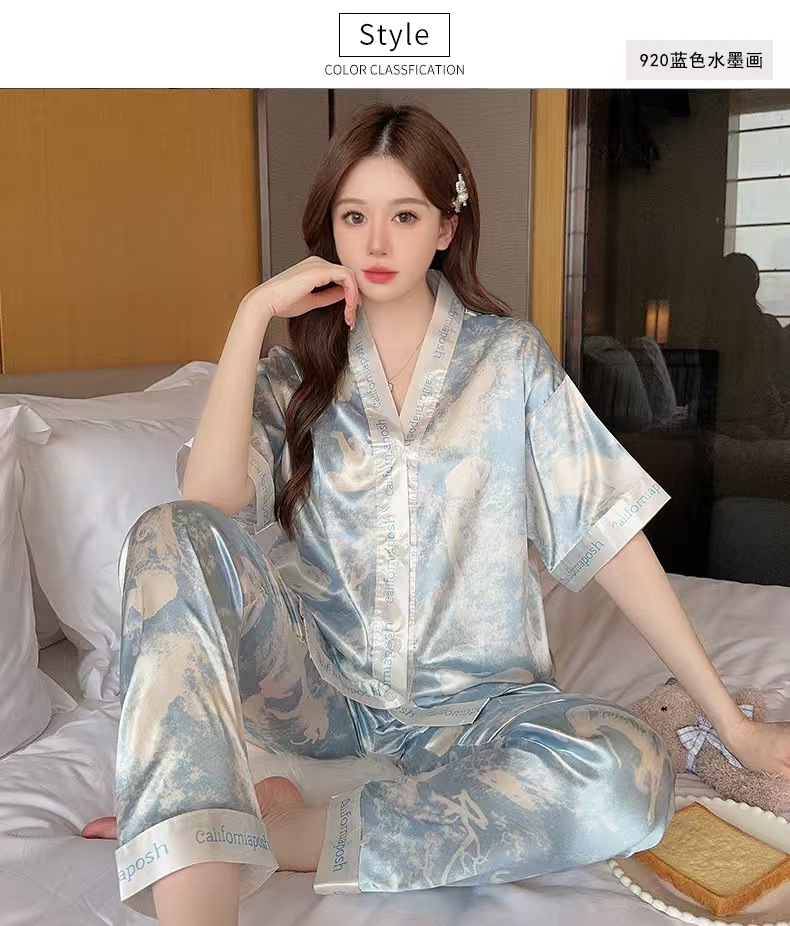 고급 아이스 실크 파자마 여성 여름 반팔 바지 카디건 V 넥 편지 인쇄 캐주얼 럭셔리 홈 의류 세트스토어 가기