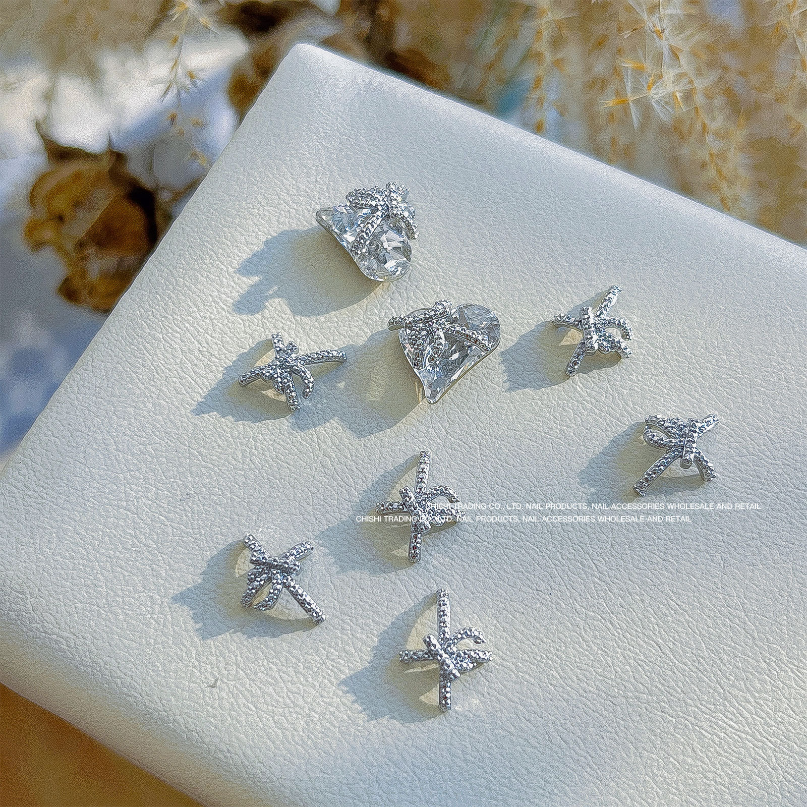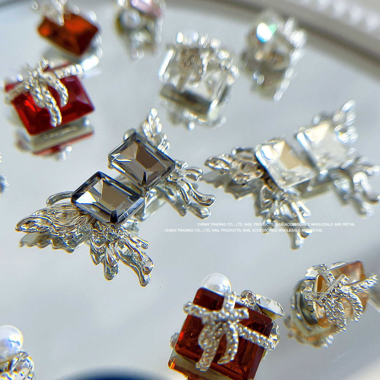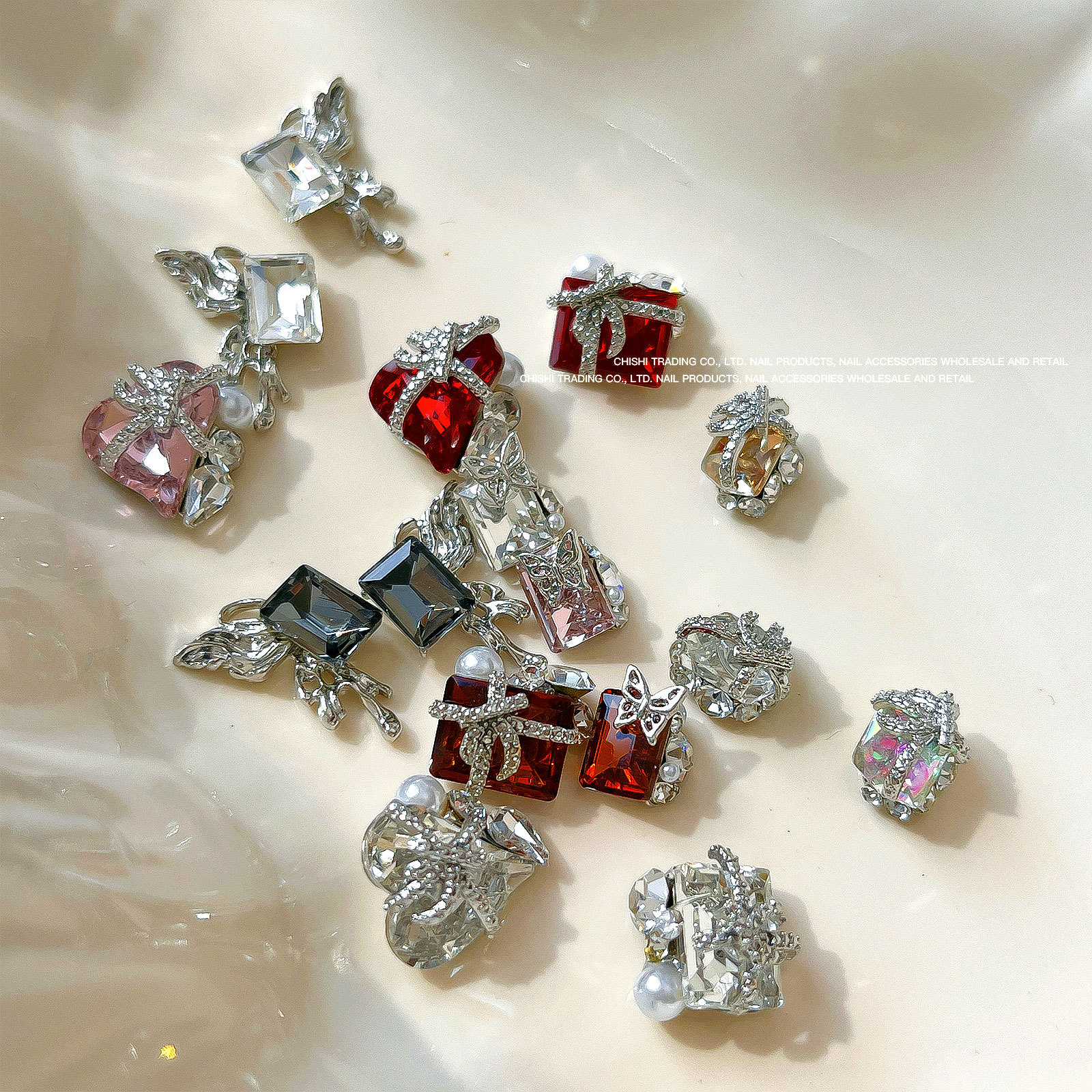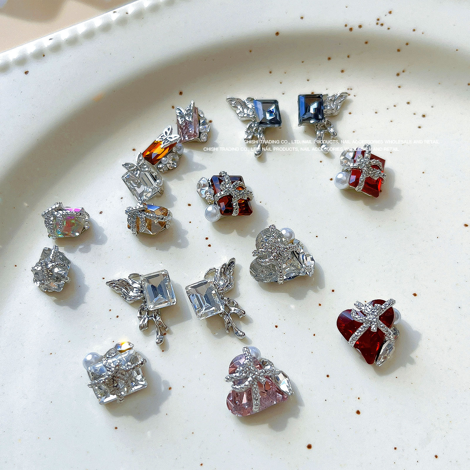붕대 선물 클립 다이아몬드 네일 보석 새해 선물 상자 비뚤어진 심장 긴 직각 나비 다이아몬드 네일 장식 도매