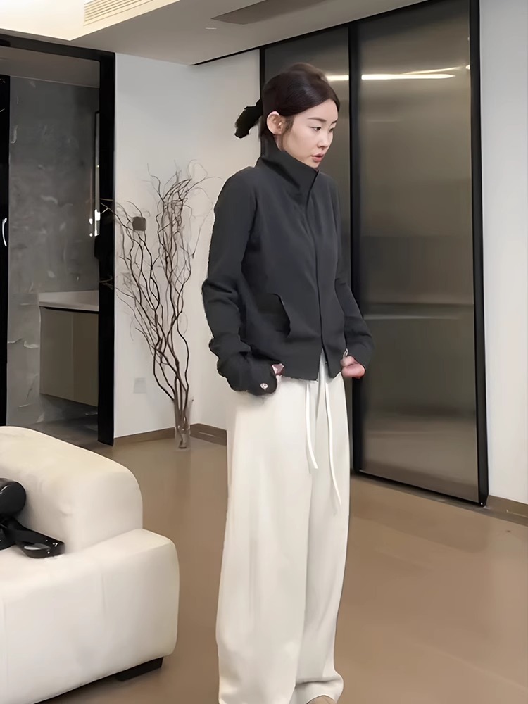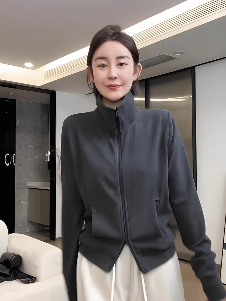 블랙 더블 지퍼 스탠드 칼라 코트 여성 가을과 겨울 고급 짧은 슬림 슬리밍 긴 소매 벨벳 카디건 탑