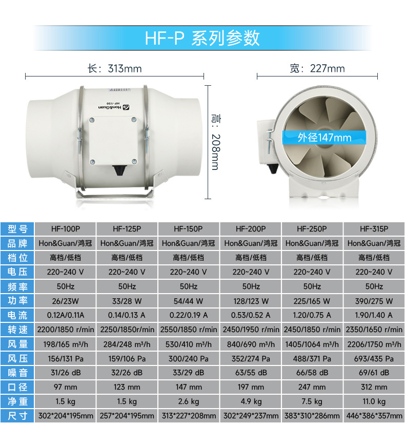 • 6inch HF-150P(이중 속도 스위치) AC 고정 주파수 팬