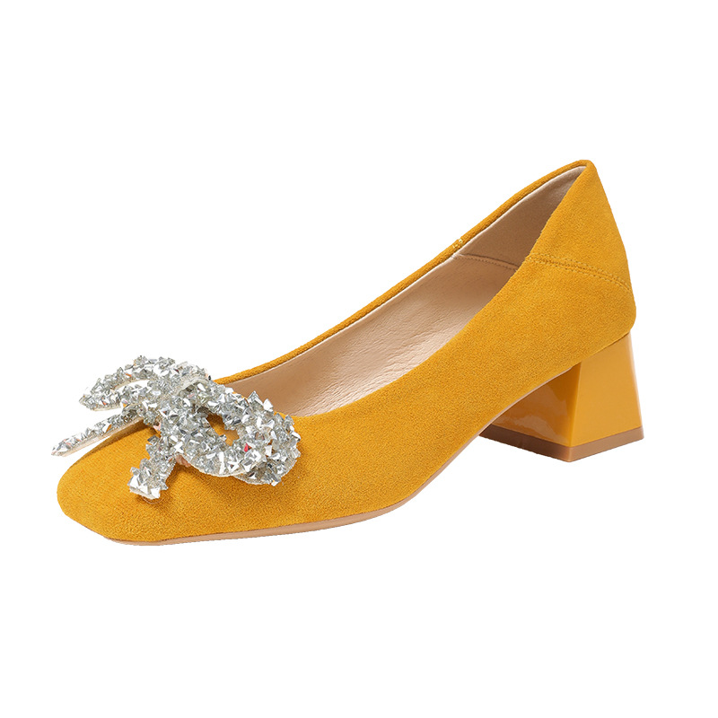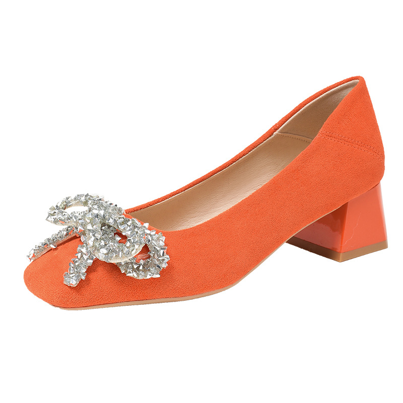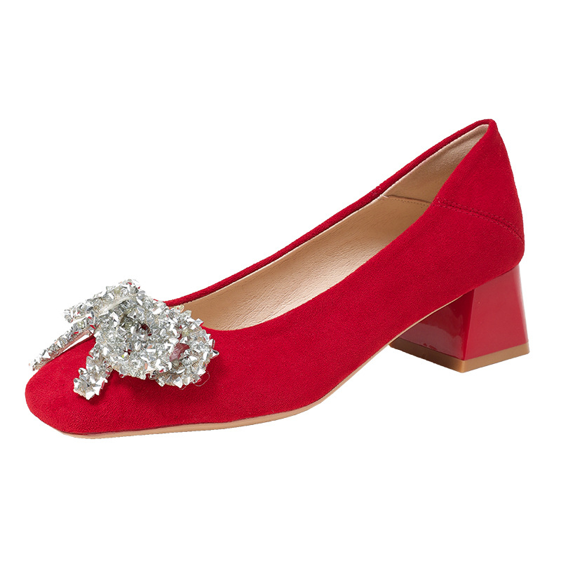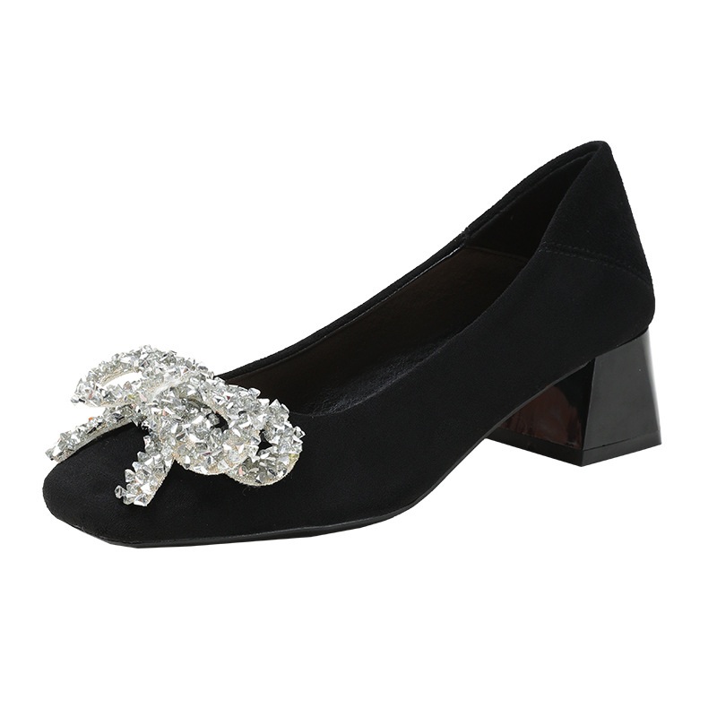 라인스톤 활 하이힐 가죽 싱글 레이어 신발 여성용 로우 컷 청키 힐 프랑스 요정 신발 2024 새로운 통근 양가죽 신발스토어 가기