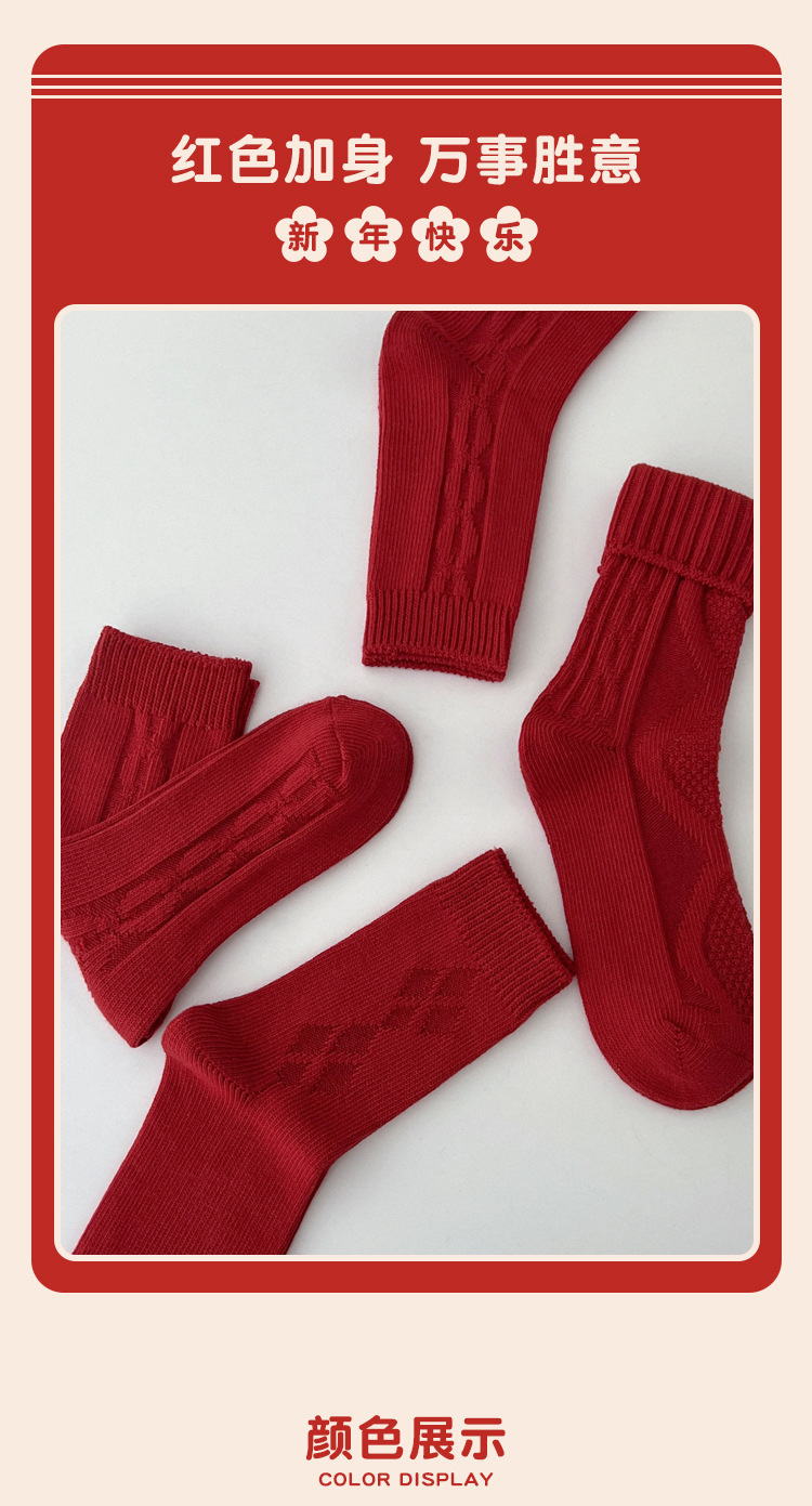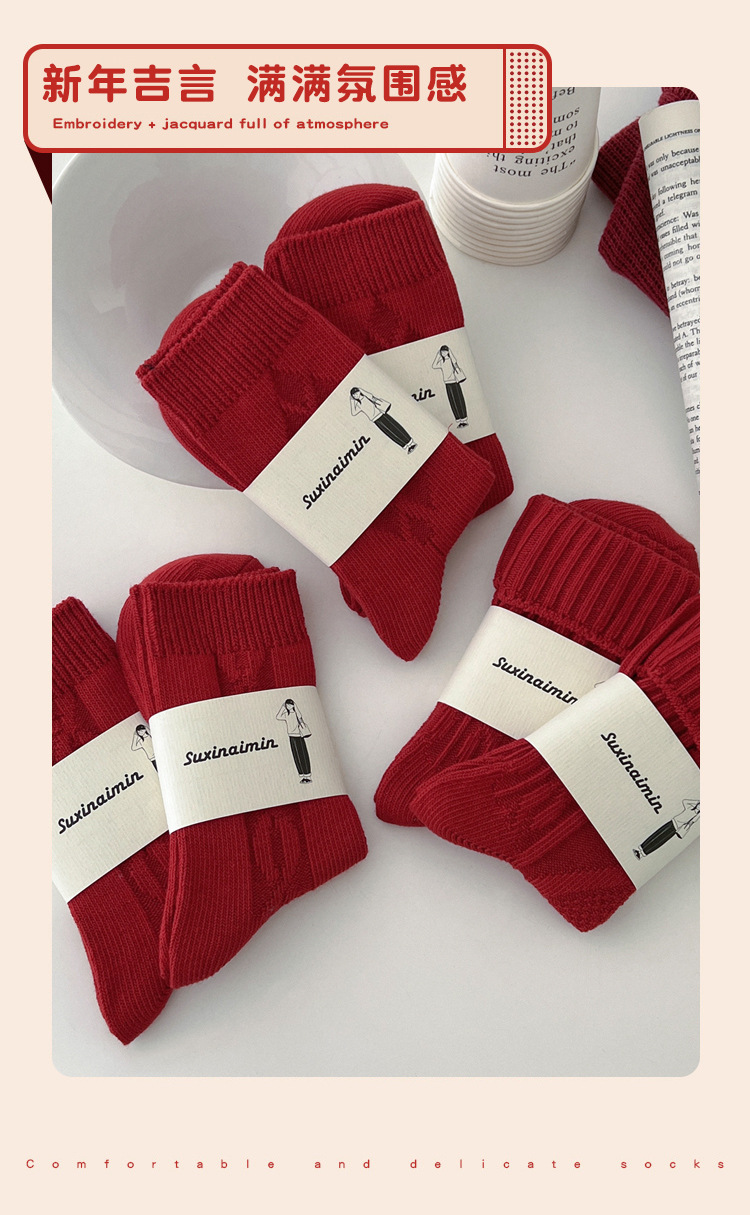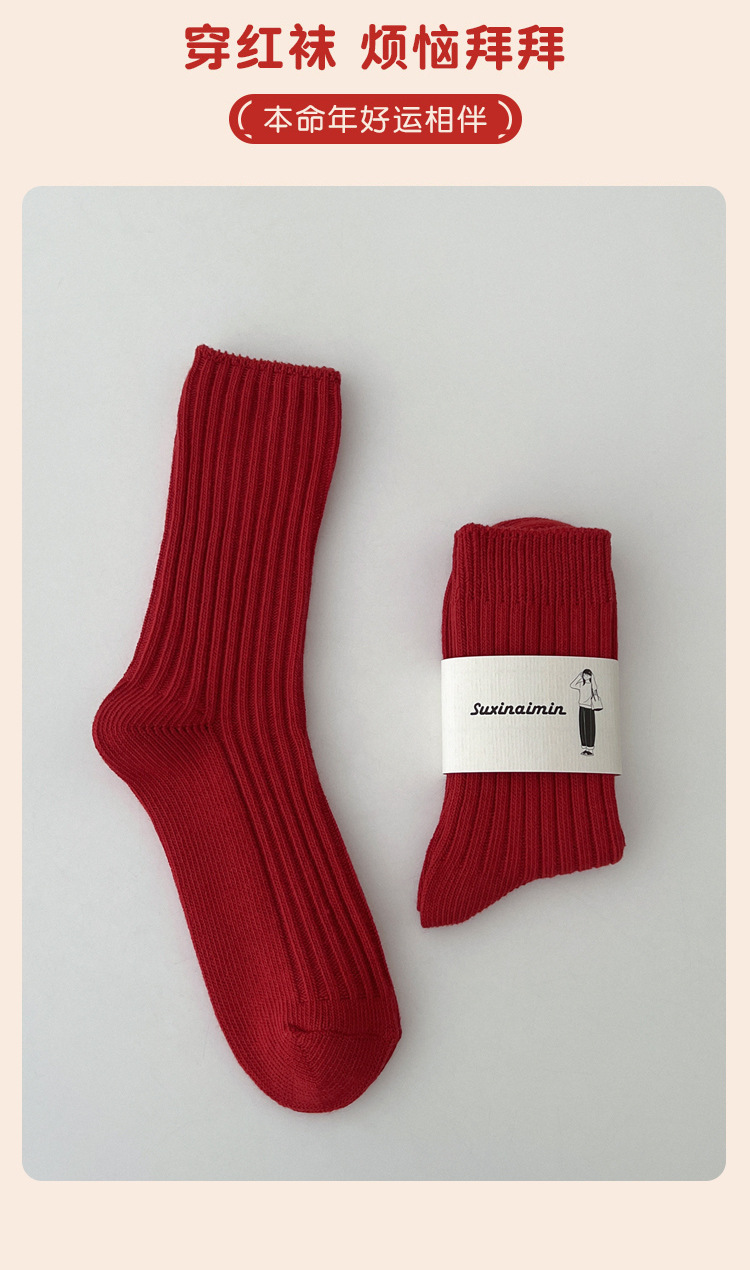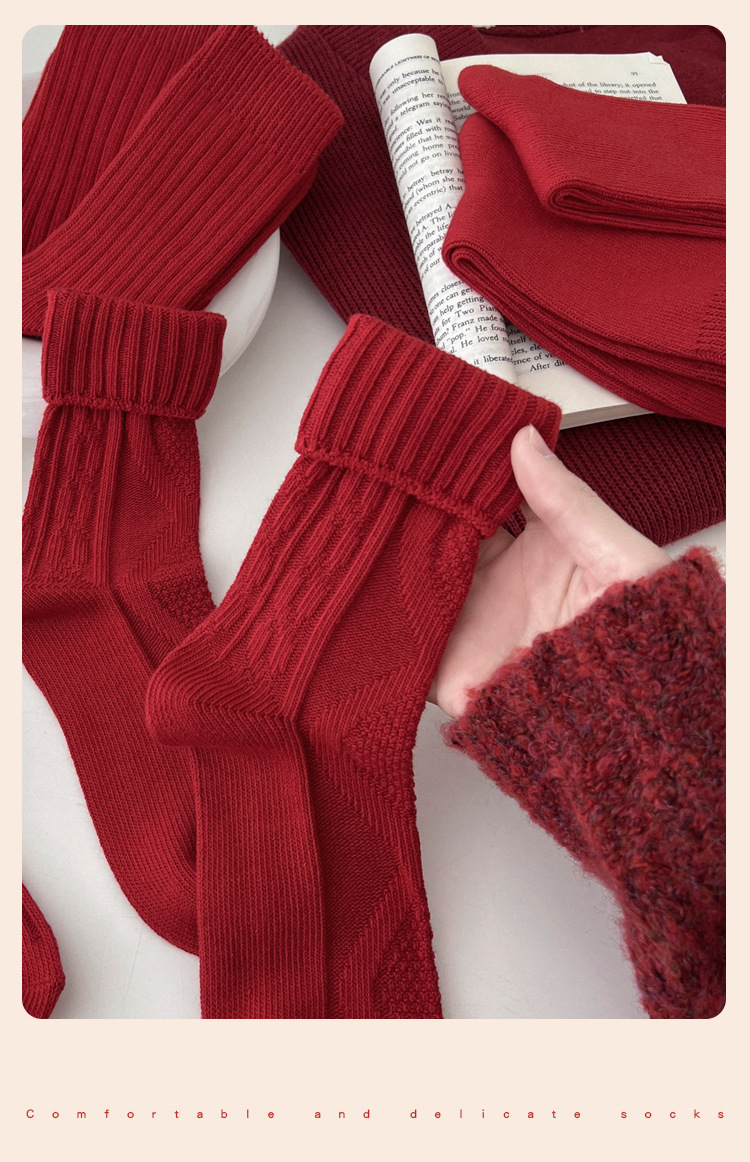 빨간 양말 여성의 유행 가을과 겨울 토끼 출생 년 중간 튜브 여성의 긴 튜브 새해 토끼 양모 복고풍 버건디스토어 가기