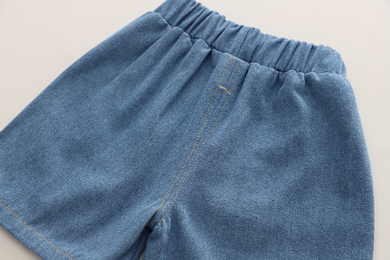 0-5 세 소년 새로운 짧은 소매 세트 아기면 편안한 줄무늬 짧은 소매 + 데님 반바지 투피스 세트 도매스토어 가기