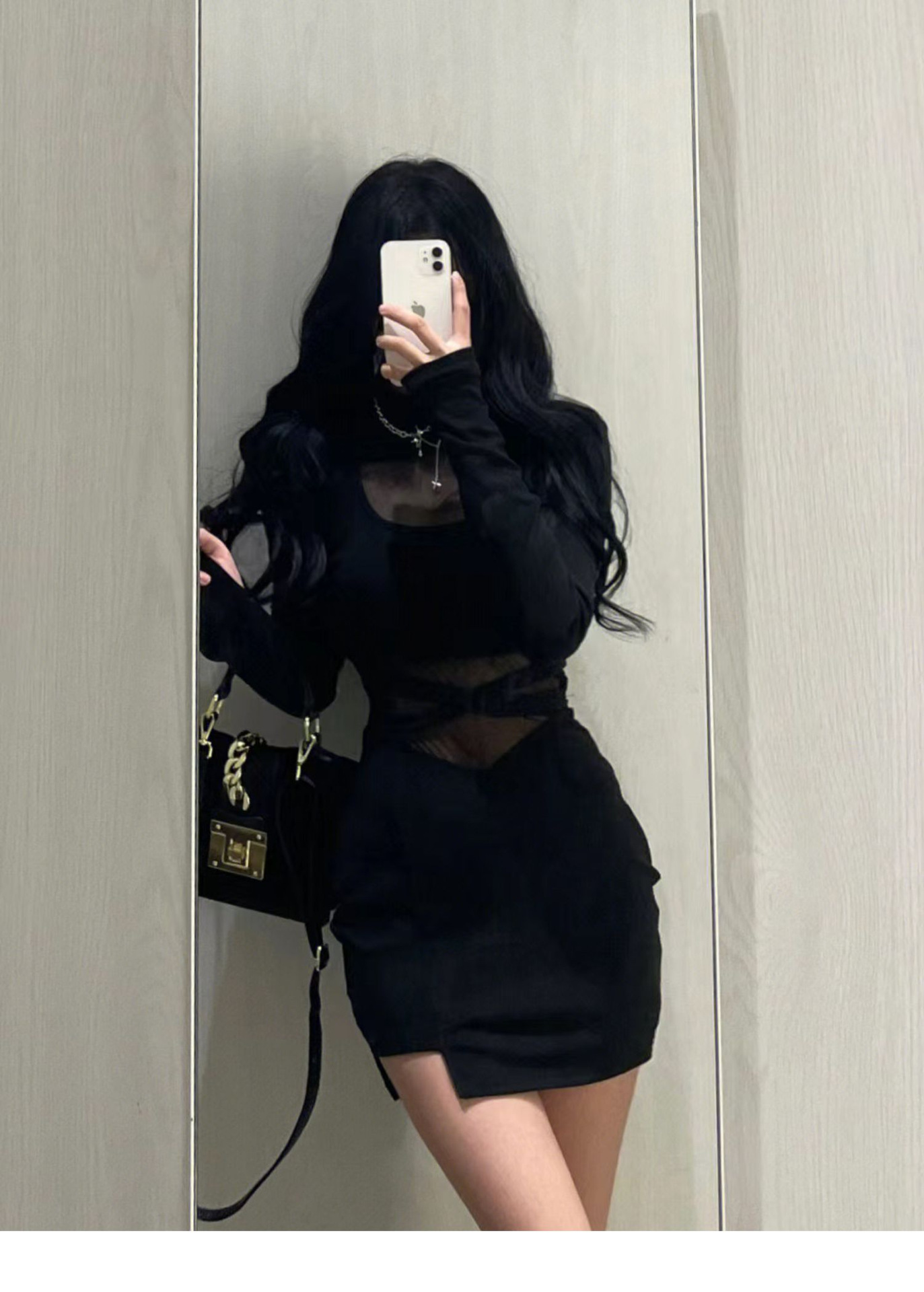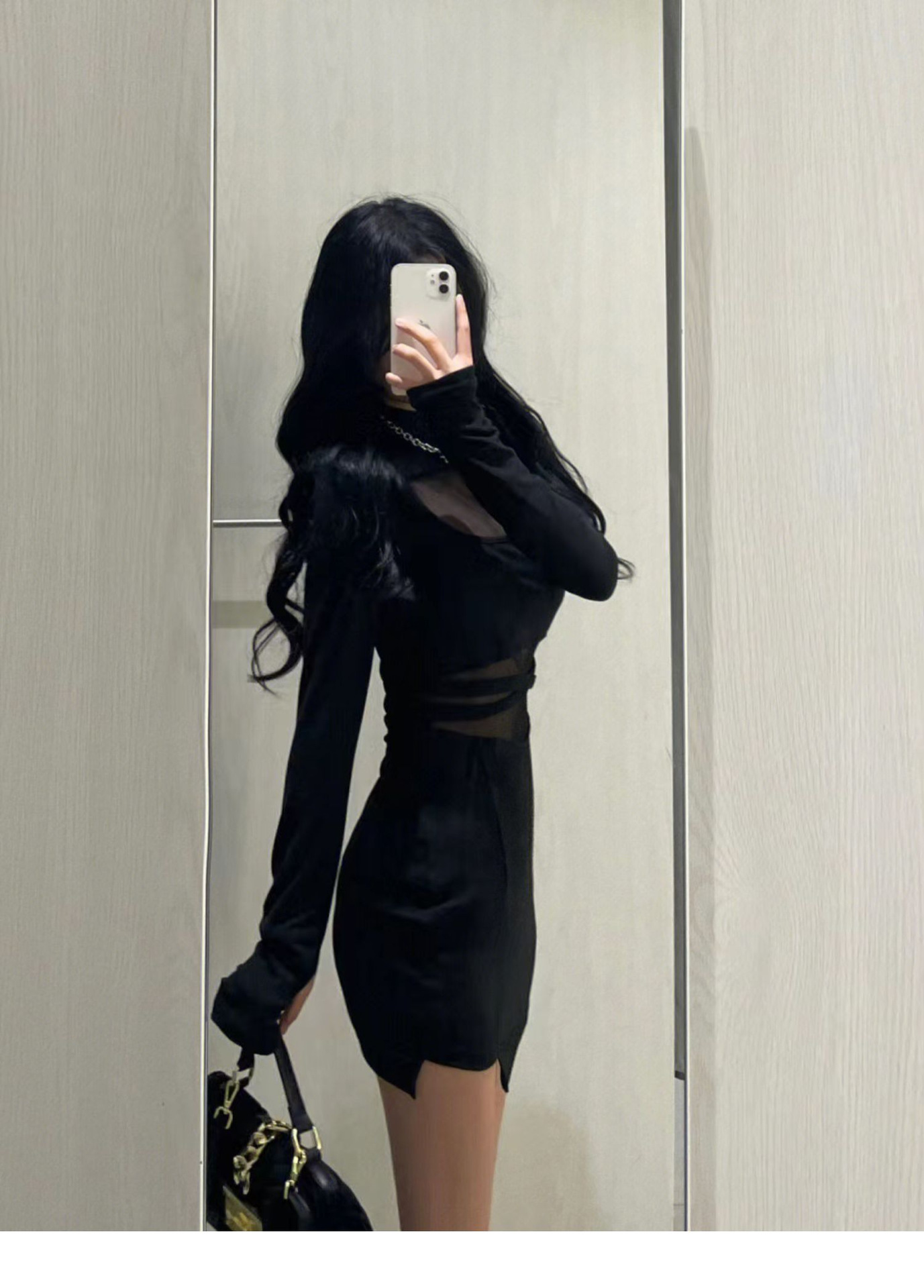 여성을위한 프랑스 세련된 메쉬 접합 순수한 정욕 스타일 드레스 가을, 겨울 새로운 섹시한 허리 슬리밍 엉덩이 덮는 짧은 스커트스토어 가기