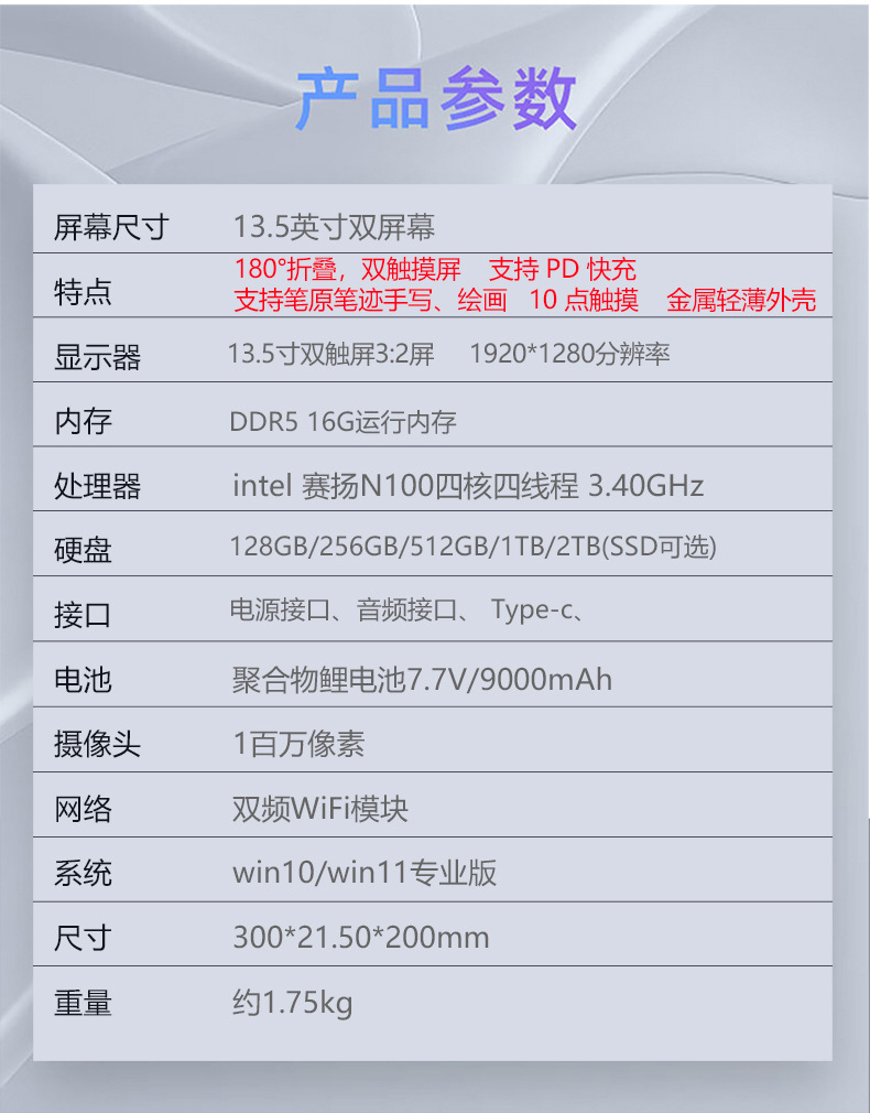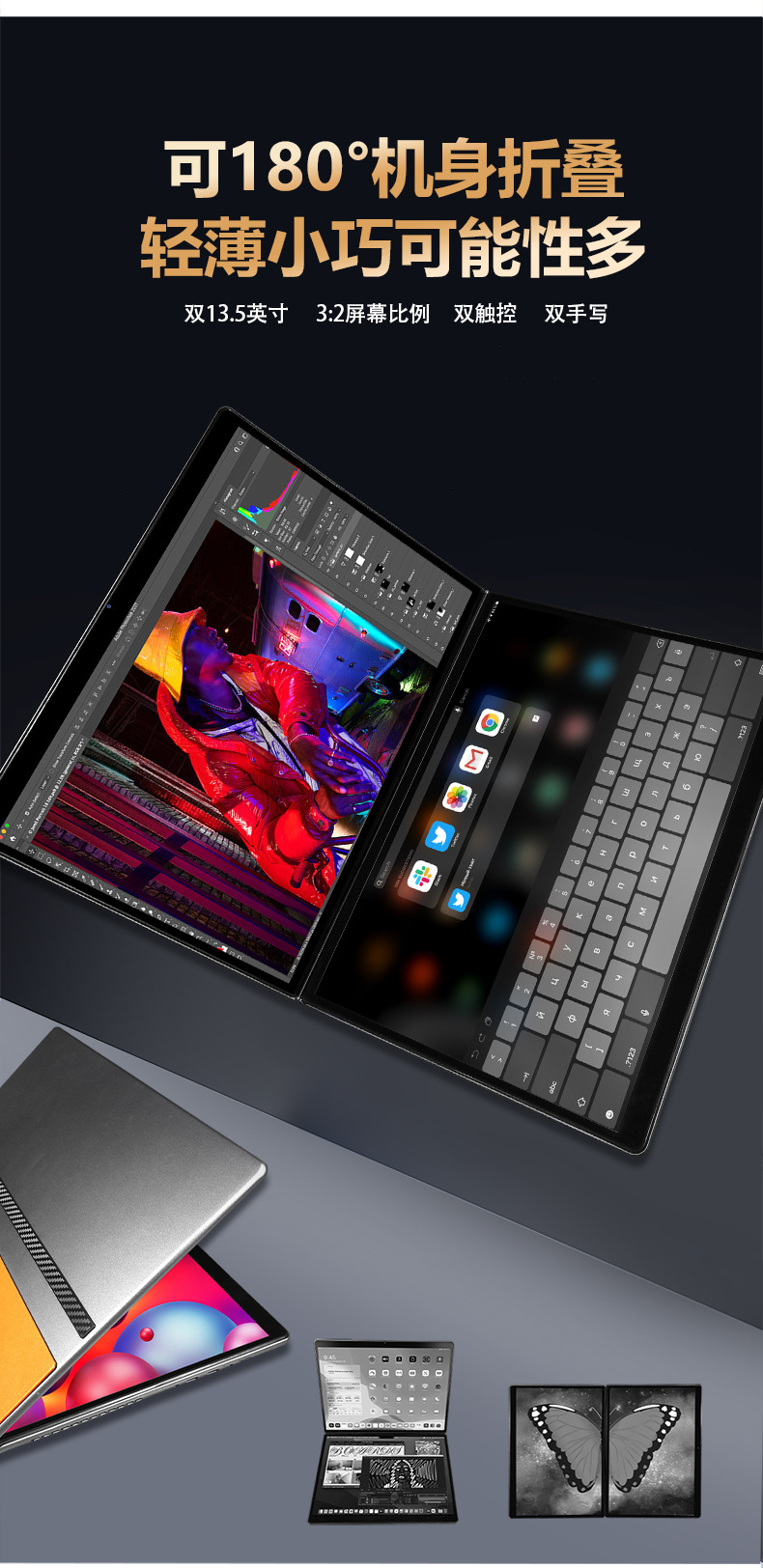 다중 화면 노트북 13.5인치 접이식 화면 듀얼 터치스크린 사무용 게임용 휴대용 접이식 화면 노트북