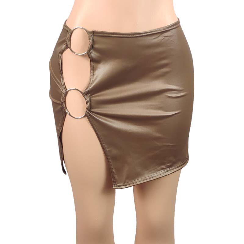 2025 유럽 및 미국 나이트클럽 여성용 드레스, 무광 힙허깅 스커트, 인조 PU 가죽, 메탈 링 섹시 미니스커트, 슬릿 디자인