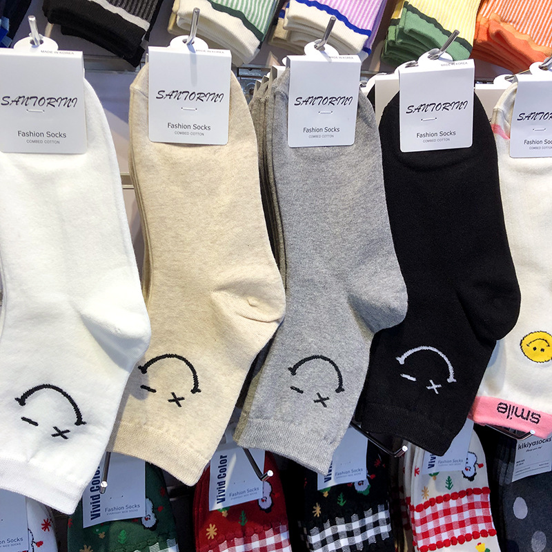 한국 수입 양말 행복한 표정 가방 웃는 얼굴 소녀 면화 양말 일본식 다재다능한 검은 흰색 회색 중간 송아지 여성 양말스토어 가기