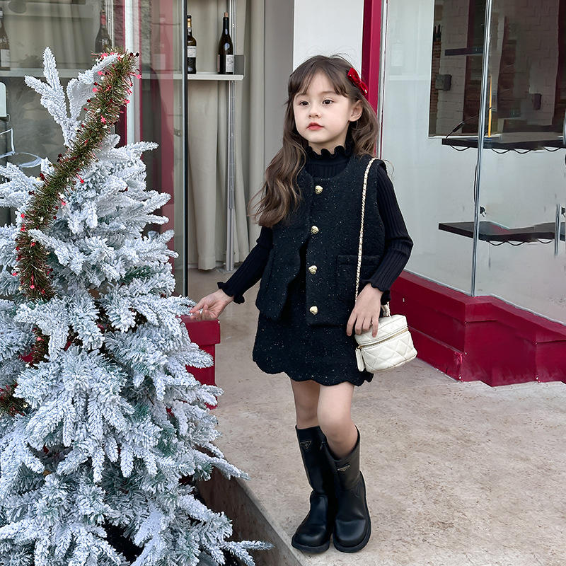 【클리어런스 상품】여아용 누빔 두꺼운 패셔너블한 샤넬 스타일 모직 조끼+반바지 스커트 세트