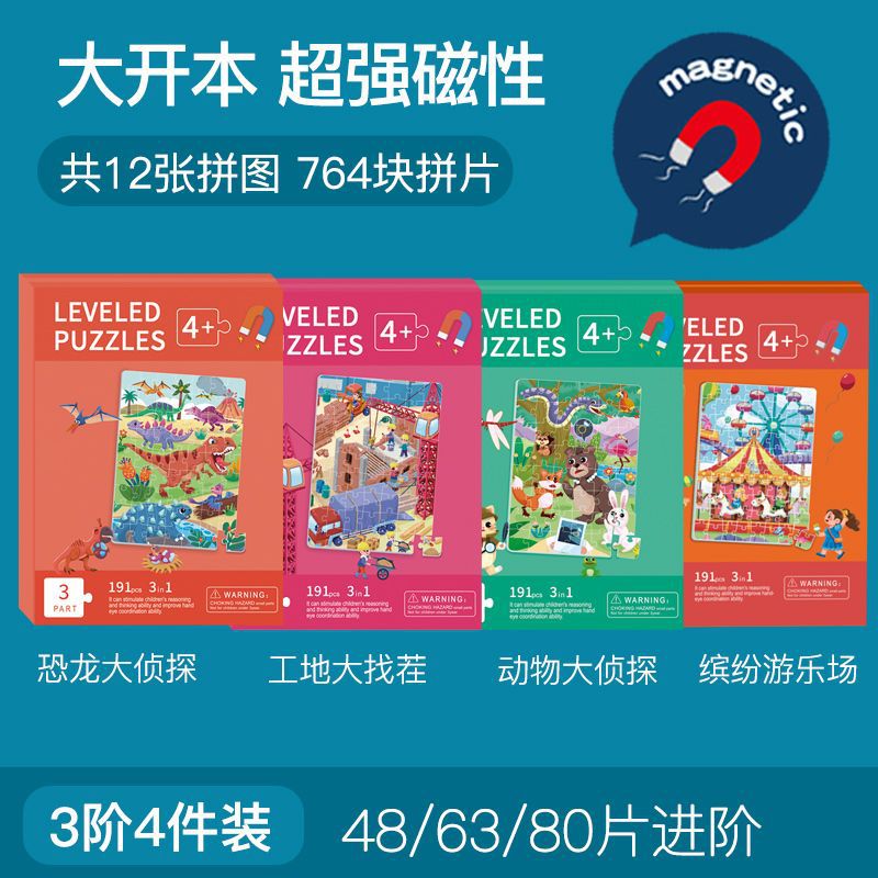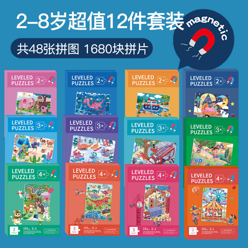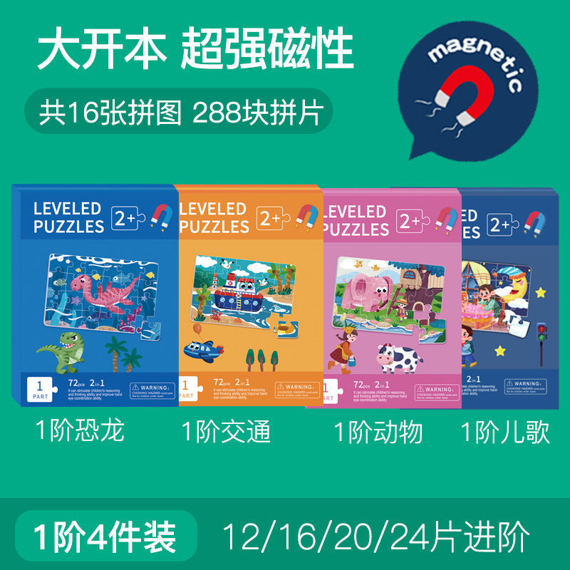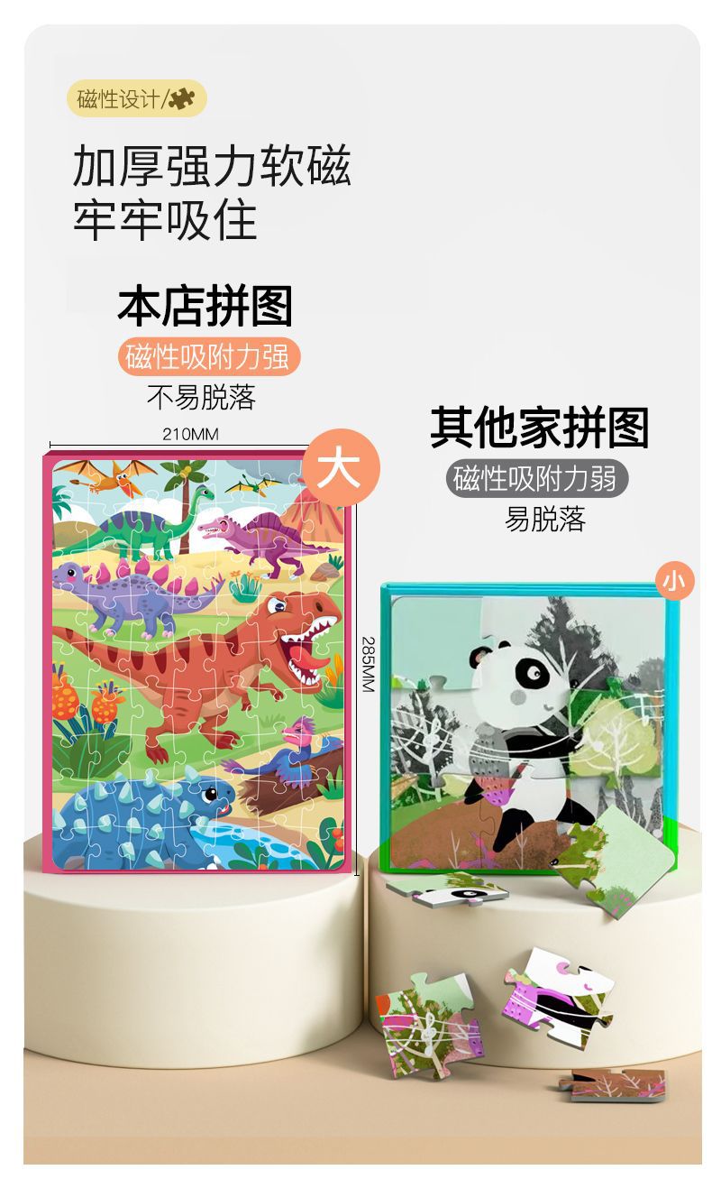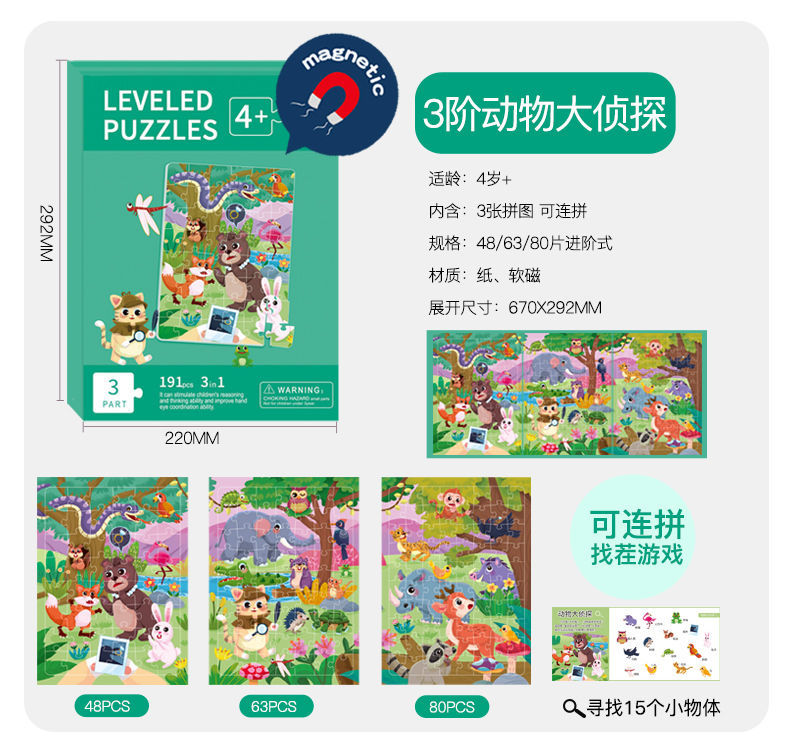 特别提醒:本厂产品激光切割,光滑无毛刺,图案清晰,1色彩鲜艳,非常贴合不易开裂,磁性强,12种系列可选,1-3阶不同难度,让孩子放心玩,是一块激发孩子学习兴趣磁性拼图书拼图。