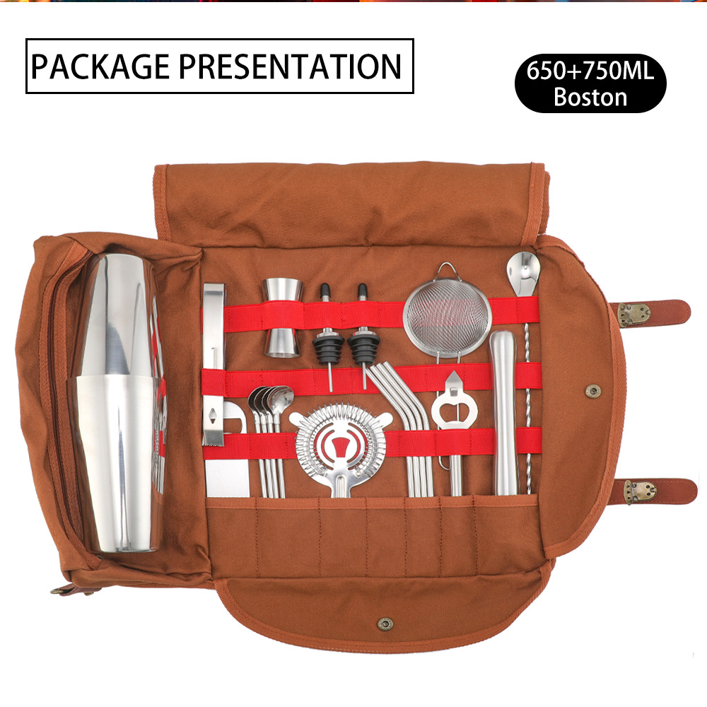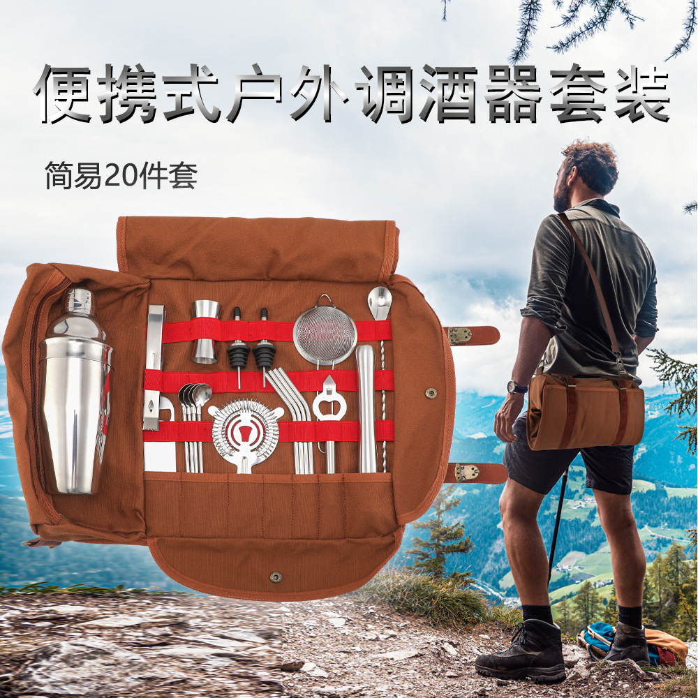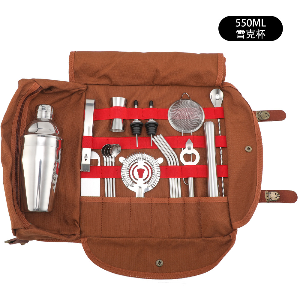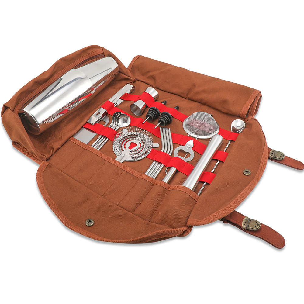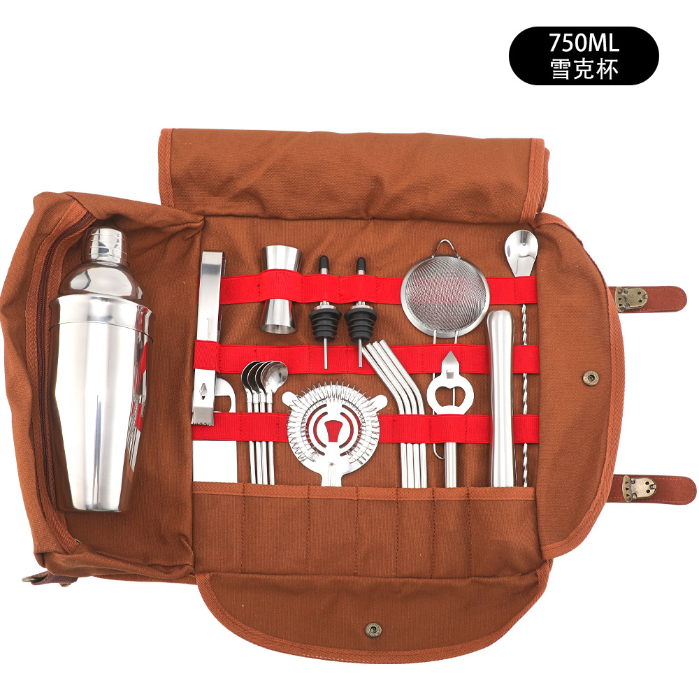 국경 간 직접 공급 스테인레스 스틸 칵테일 믹서 20 세트 바 도구 칵테일 가방 야외 어깨 가방 와인 세트 가방