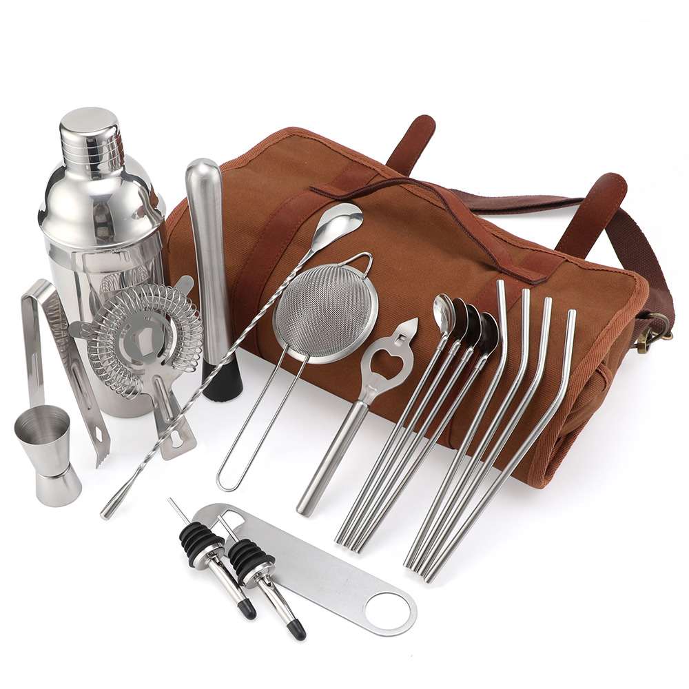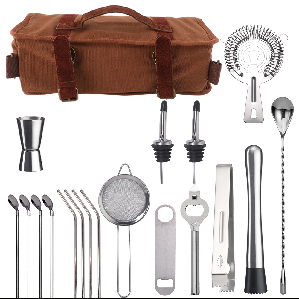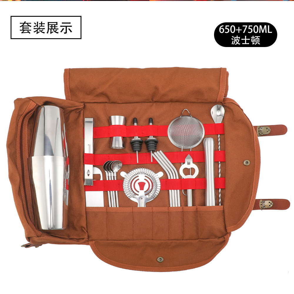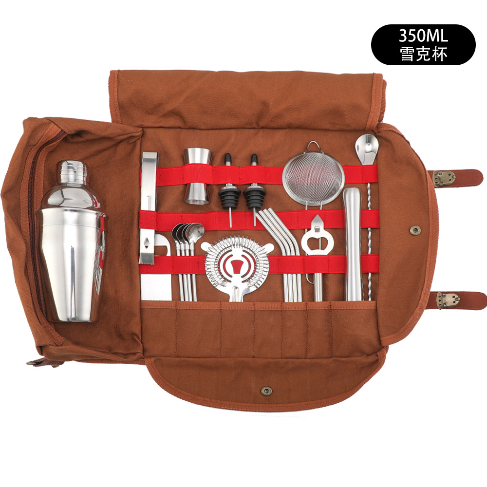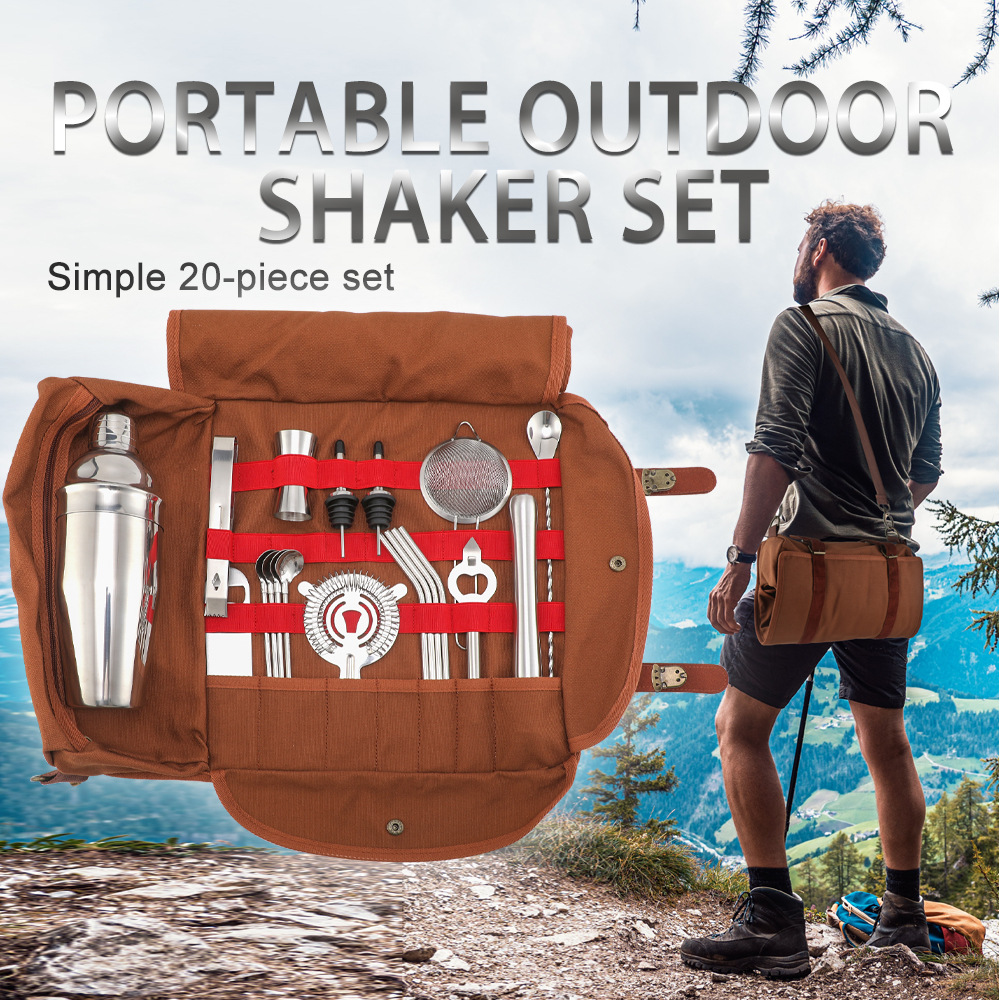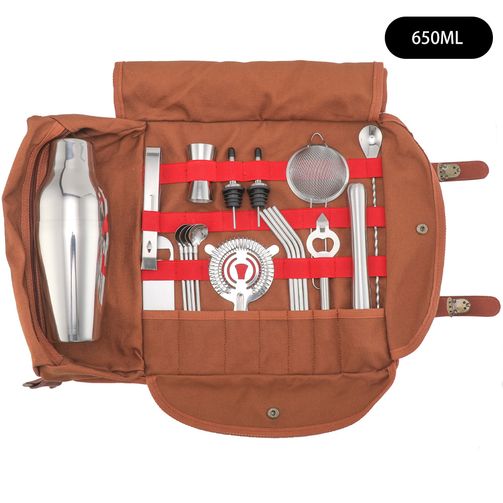 국경 간 직접 공급 스테인레스 스틸 칵테일 믹서 20 세트 바 도구 칵테일 가방 야외 어깨 가방 와인 세트 가방