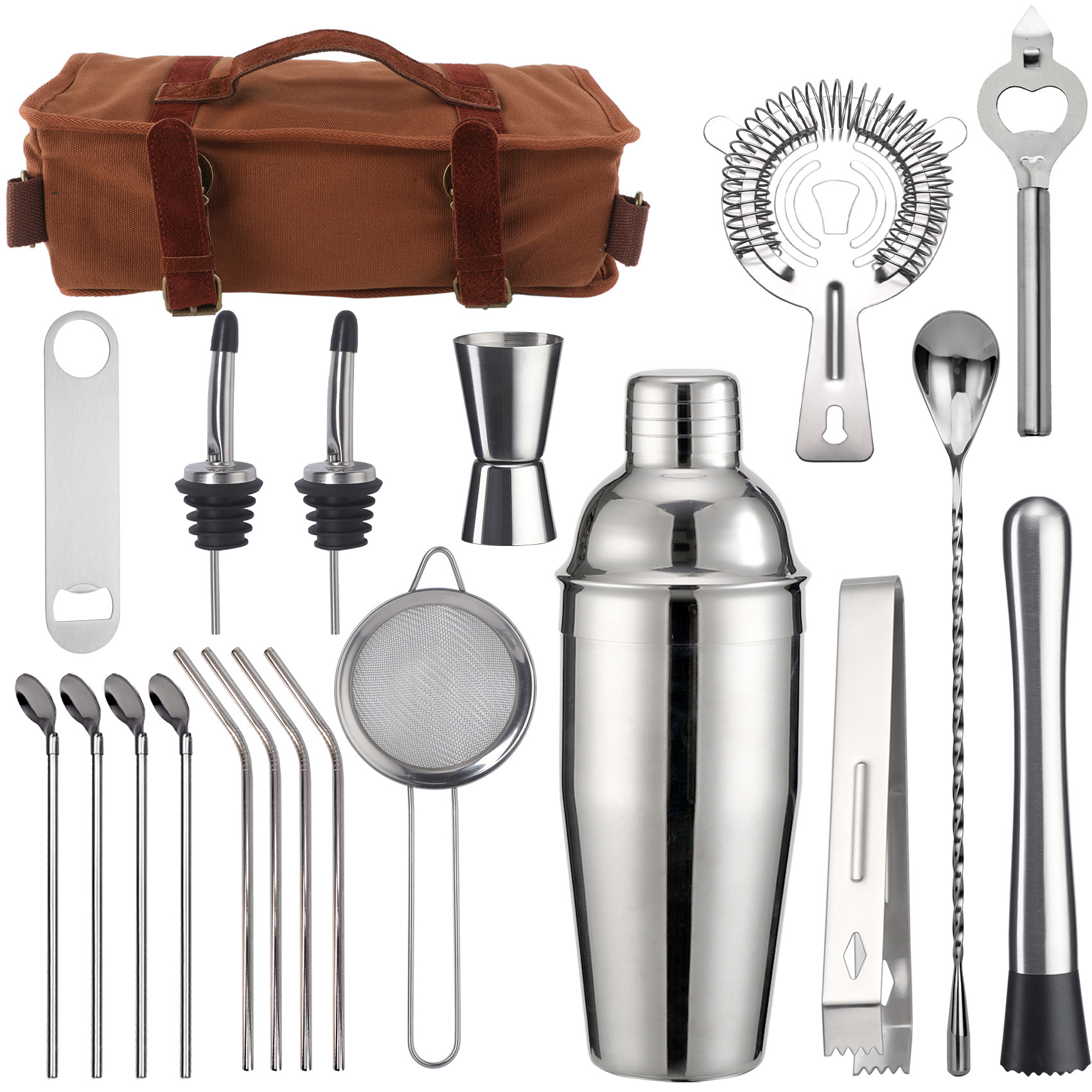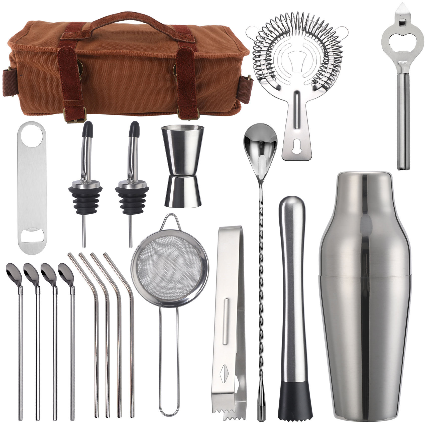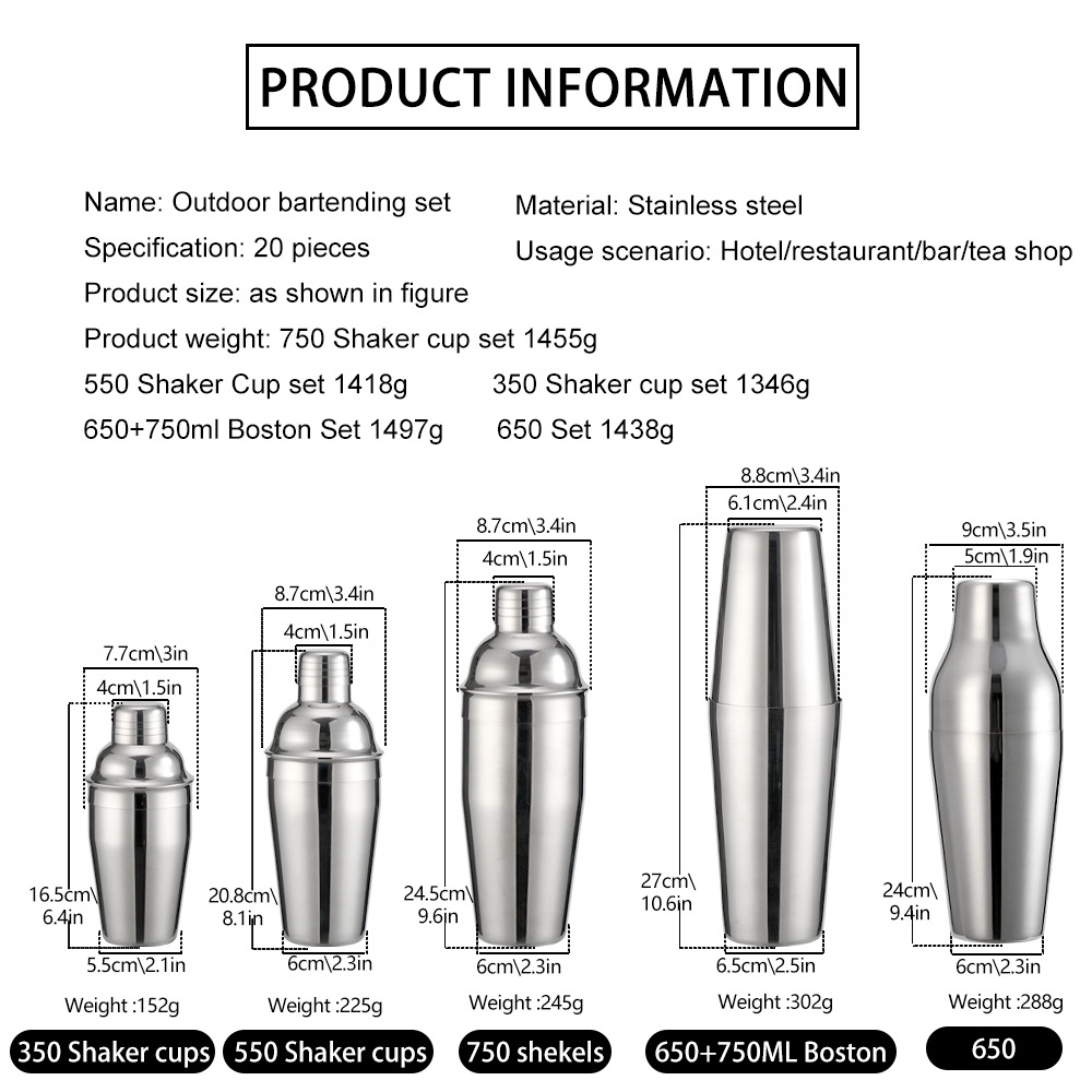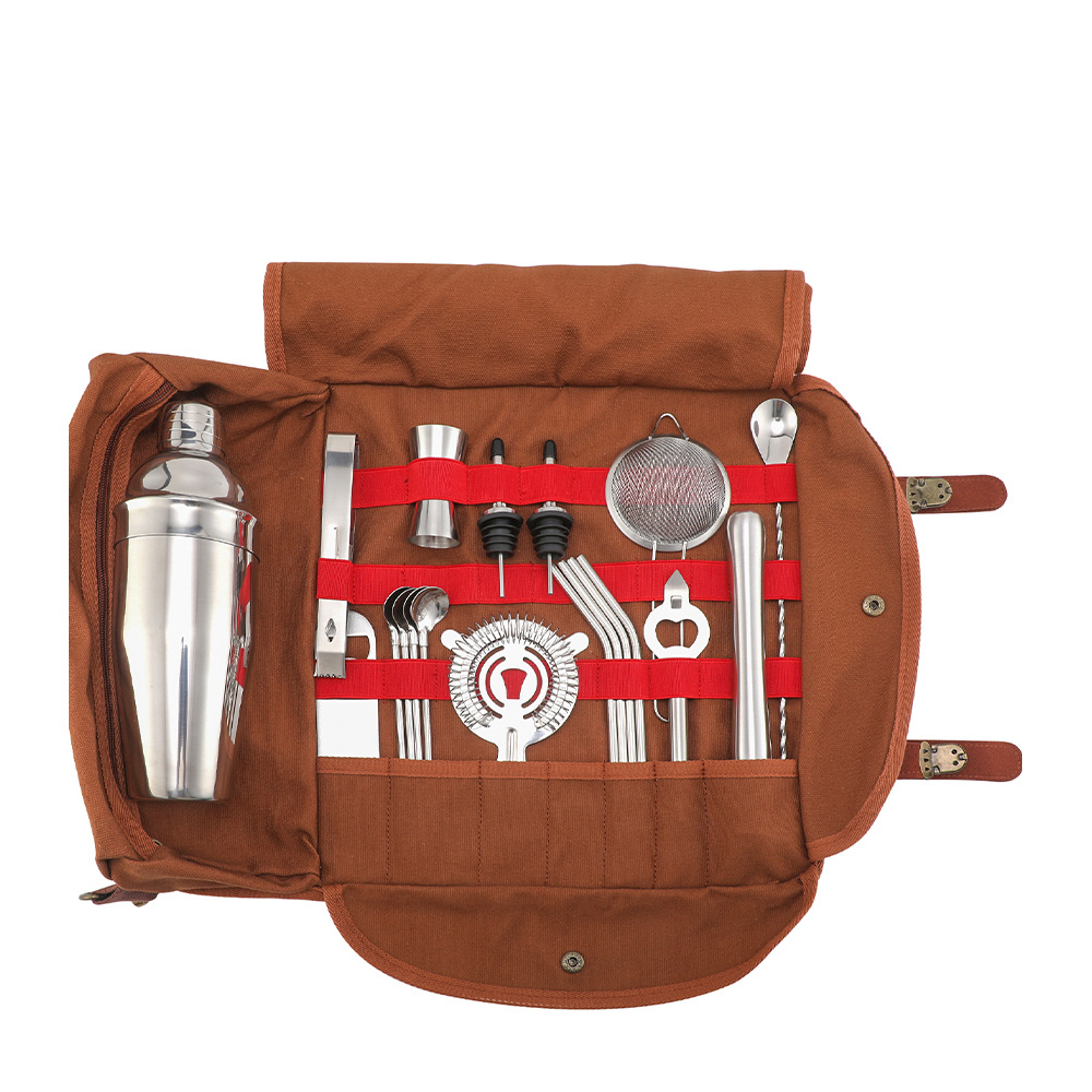 국경 간 직접 공급 스테인레스 스틸 칵테일 믹서 20 세트 바 도구 칵테일 가방 야외 어깨 가방 와인 세트 가방