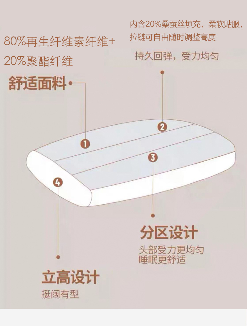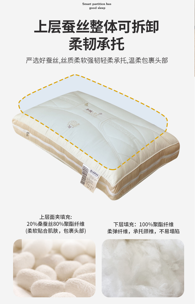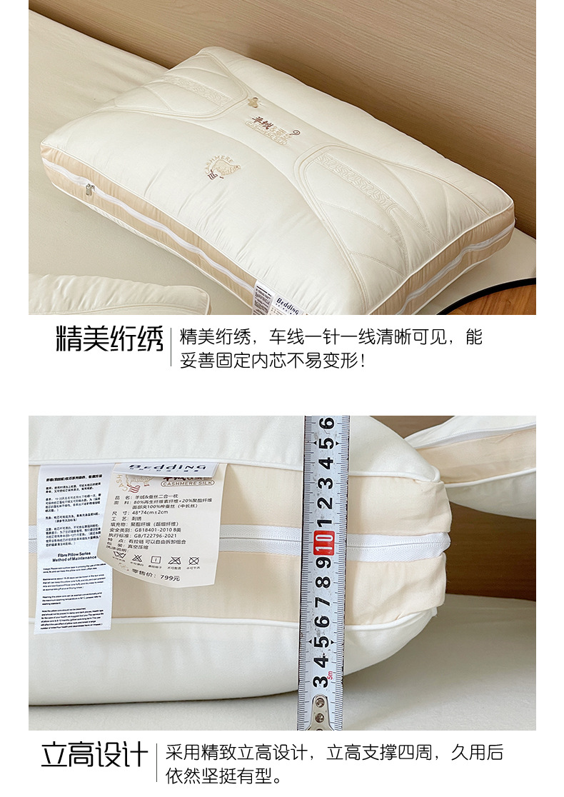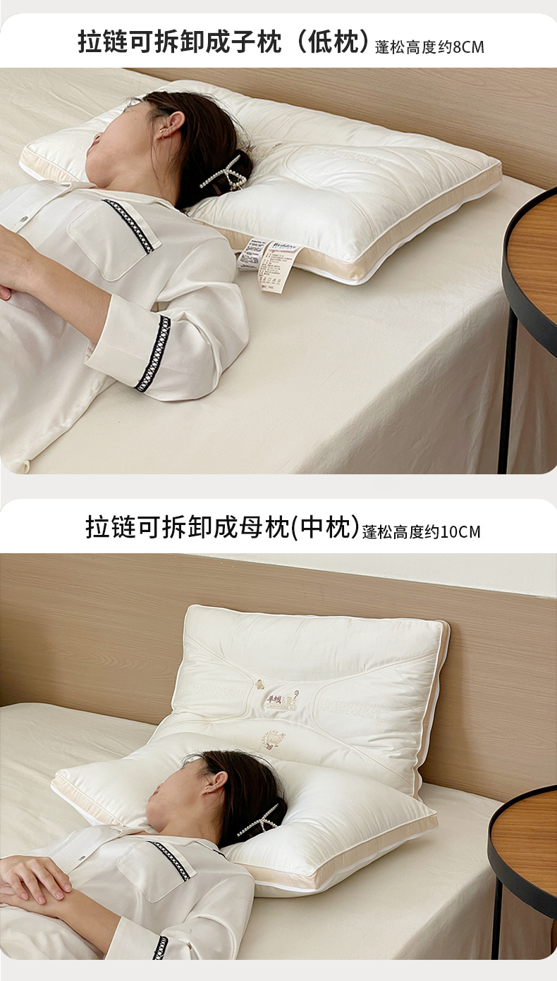 2. 羊绒蚕丝二合一枕,面部内夹20%桑蚕丝填充,柔软贴服,拉链可自由随时调整高度,高低结合,随意拆卸组合,大人小孩都可以使用