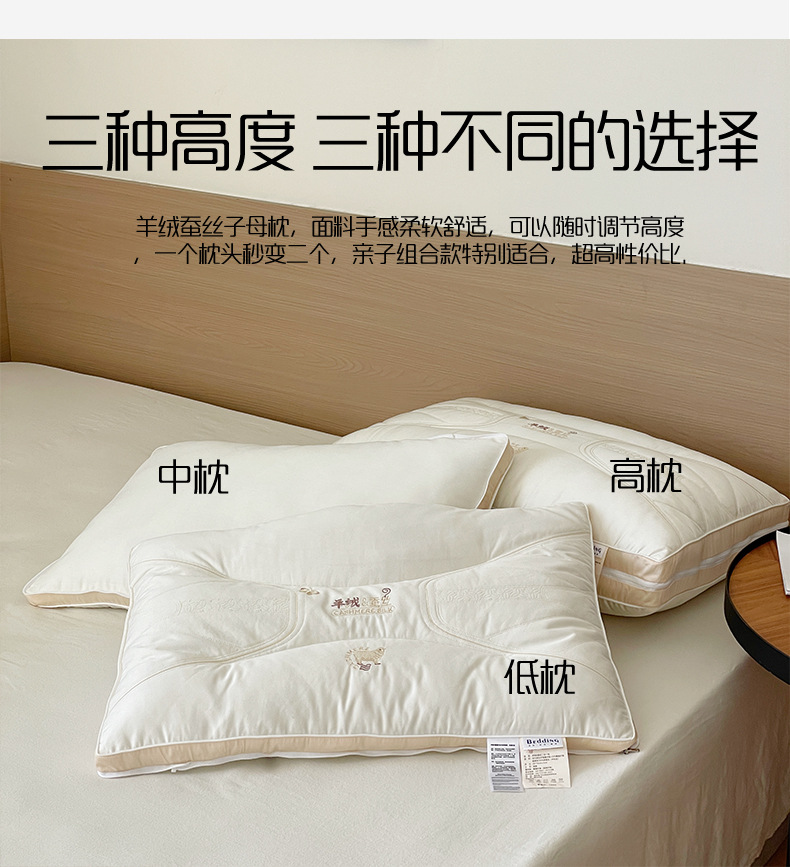 优点:1.羊绒蚕丝子母枕,面料手感柔软舒适,可以随时调节高度,一个枕头秒变二个,亲子组合款特别适合,超高性价比,相当花一个钱买3种睡眠高度的枕芯,超级划算.