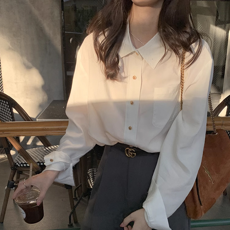 XIAOZHI ~ 작은 골드 버튼 셔츠 프랑스 접이식 클래식 탑 긴 소매 텐셀 화이트 셔츠스토어 가기