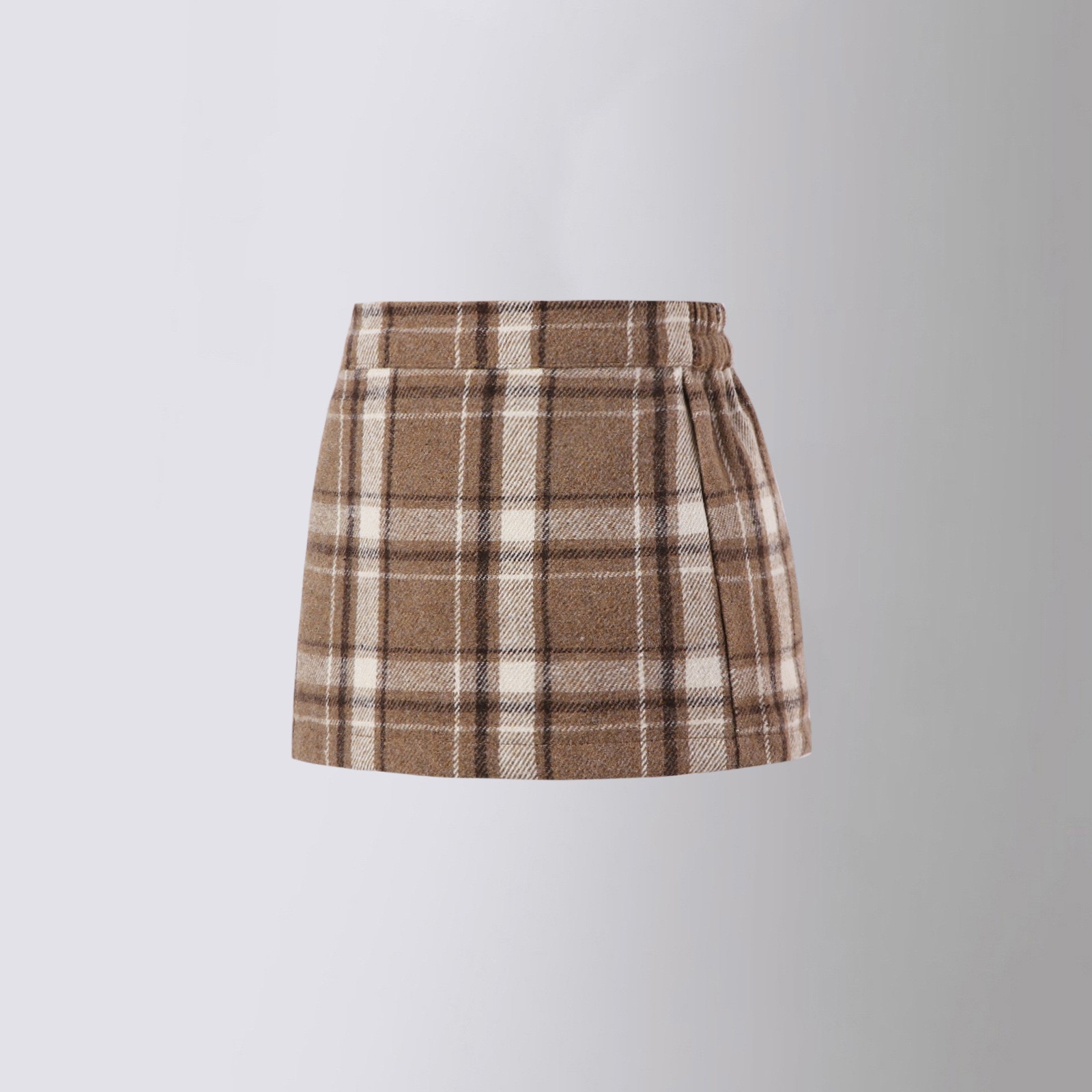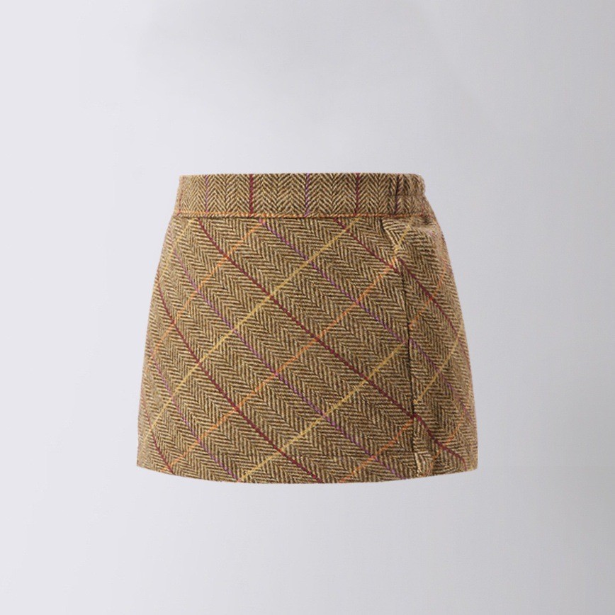 • 2389 체크 무늬 힙 스커트 모직 카키 화이트 체크 무늬