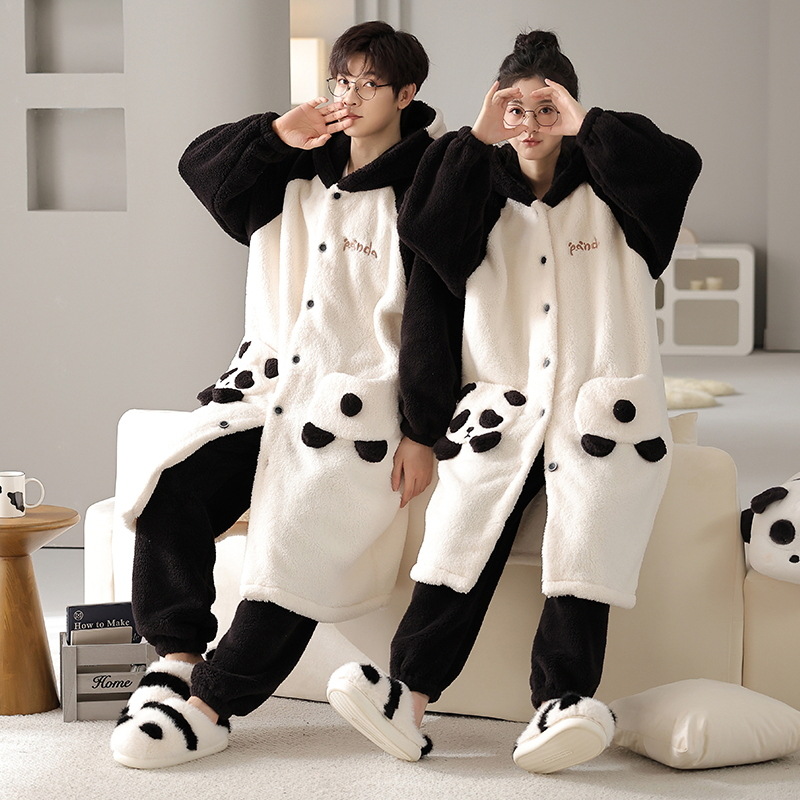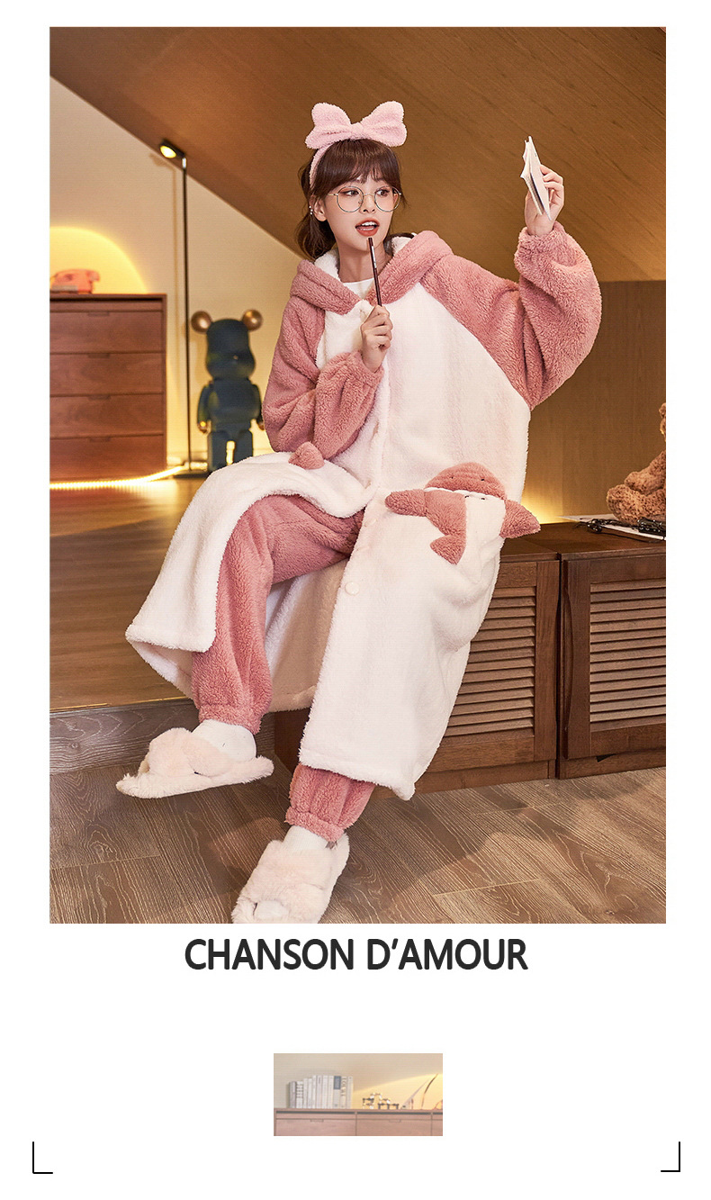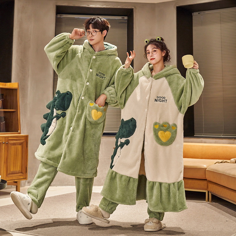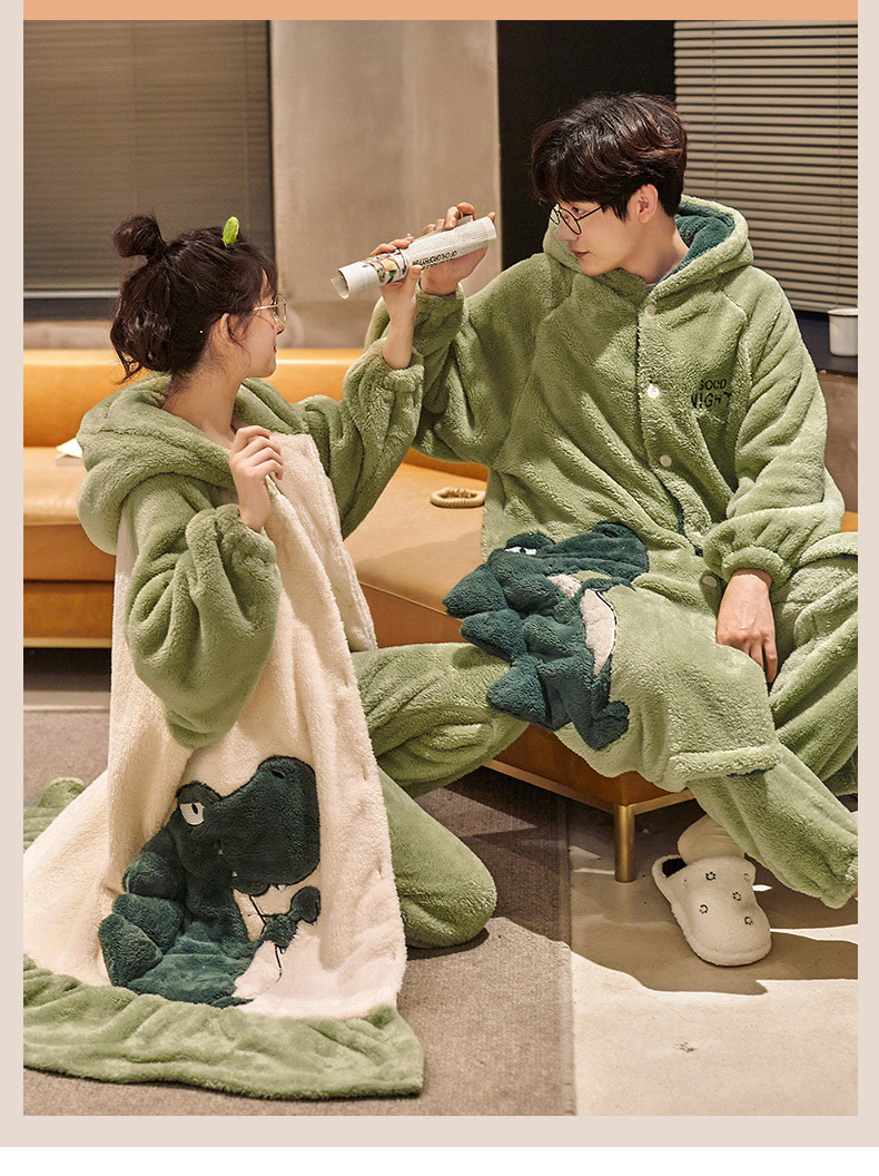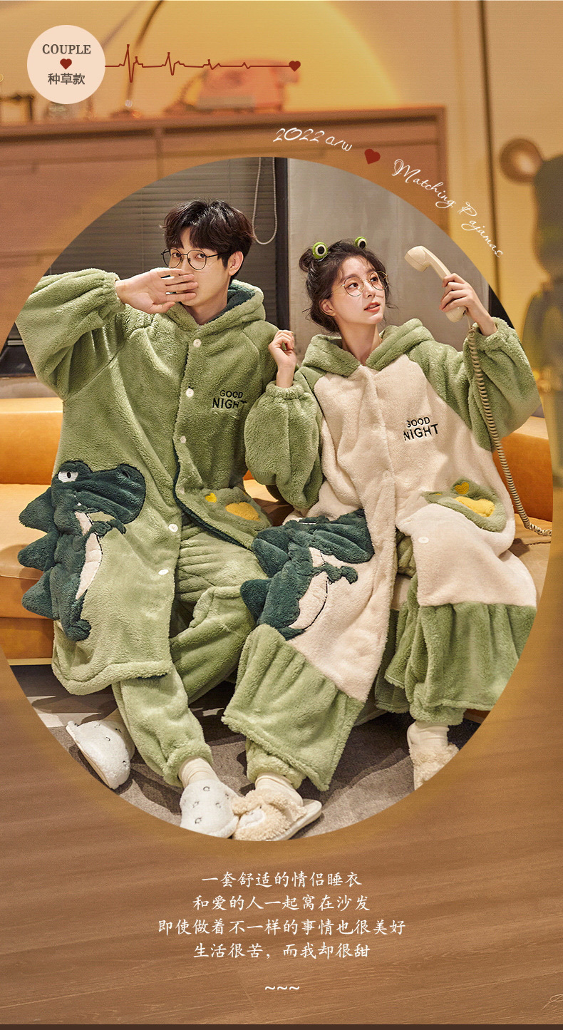 겨울 두꺼운 커플 잠옷 여성의 작은 공룡 만화 남성과 여성의 홈 착용 플란넬 파자마 따뜻한 세트스토어 가기
