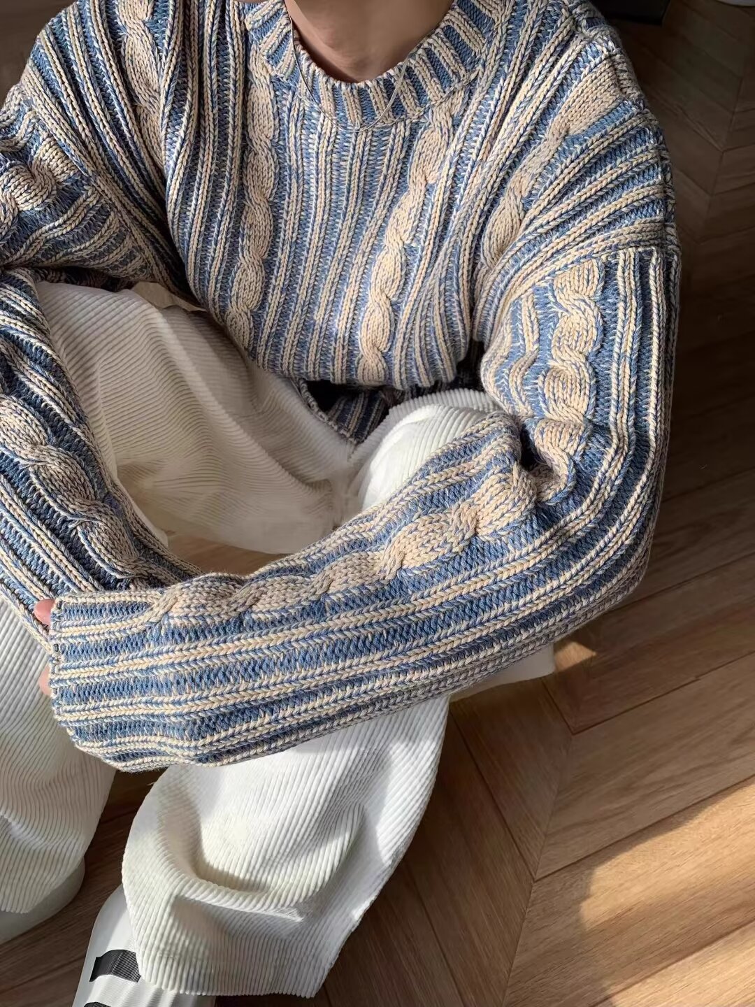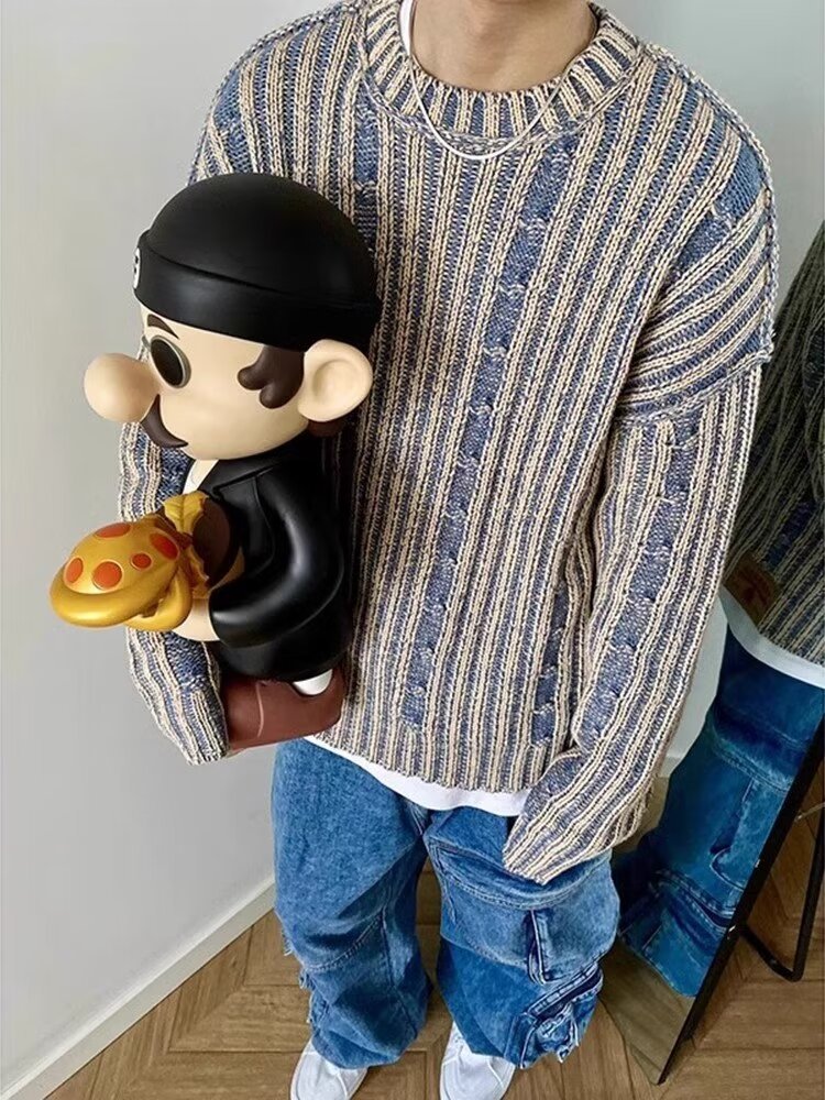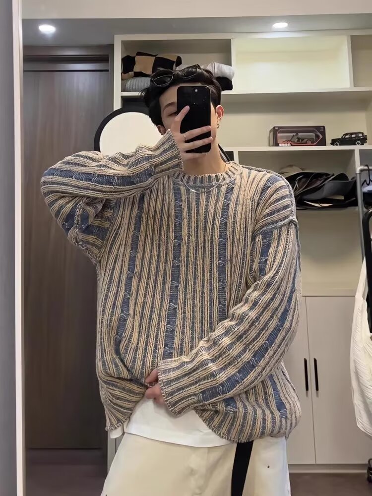 2024 새 소년 고급 스웨터 가을과 겨울 한국식 복고풍 대비 컬러 라운드 넥 캐주얼 스웨터스토어 가기