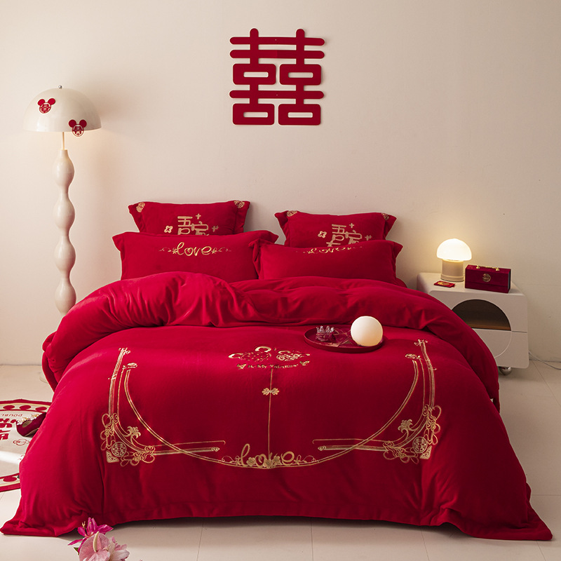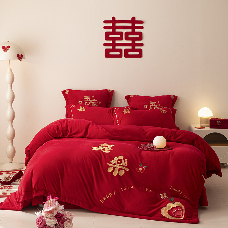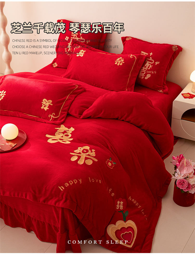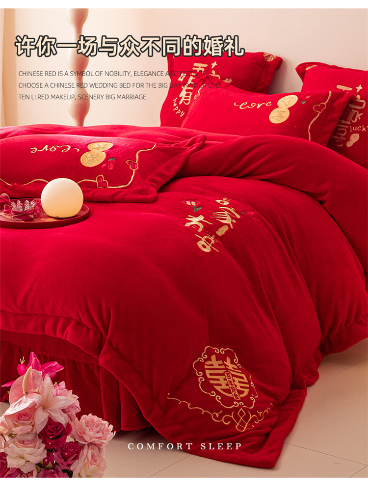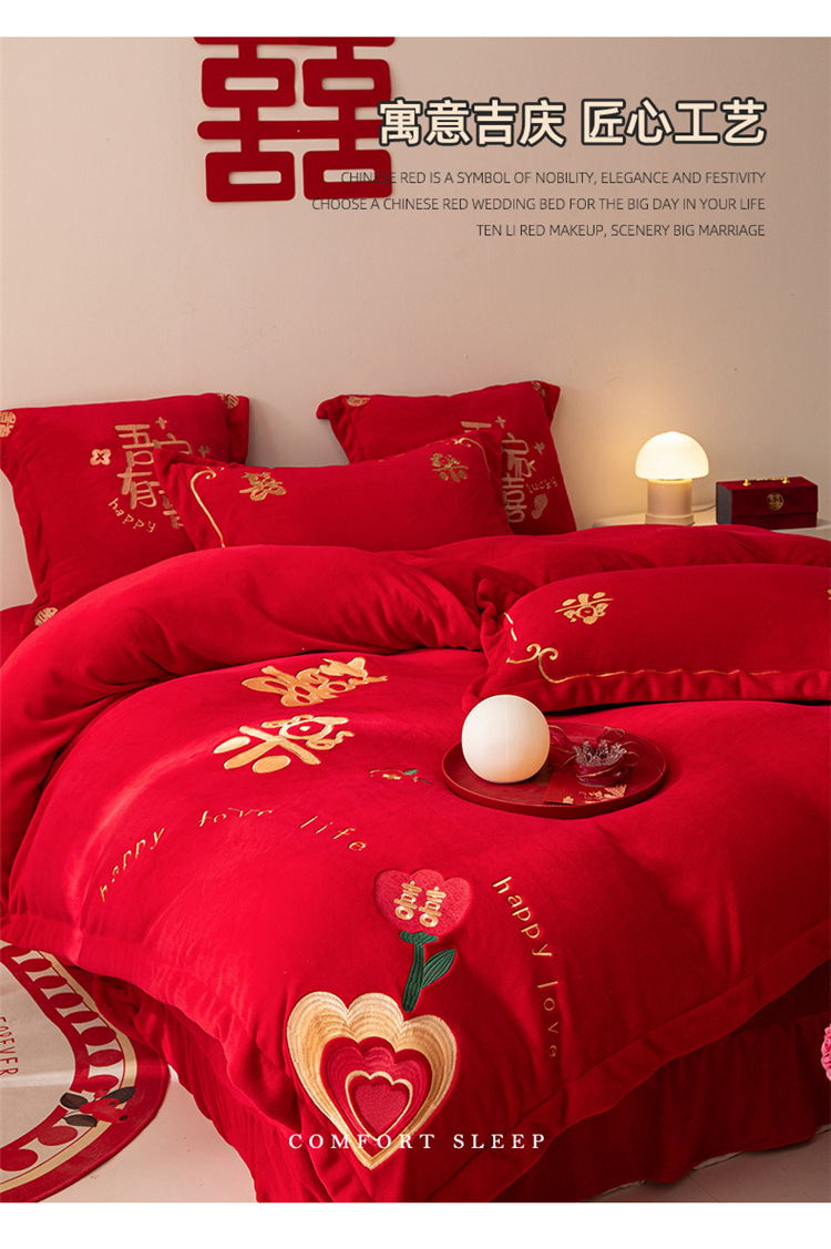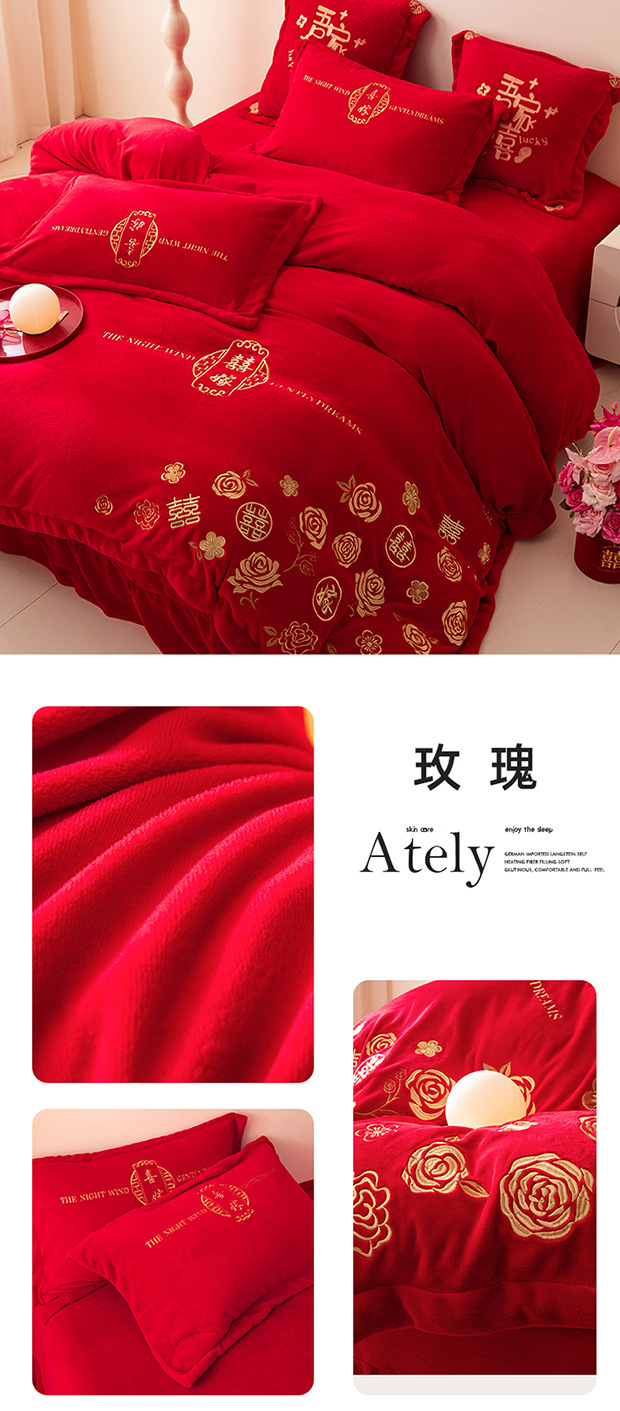 웨딩 가을과 겨울 따뜻한 우유 벨벳 침대 4 조각 두꺼운 자수 퀼트 커버 레드 침대 시트 장착 시트 도매 그룹 구매스토어 가기