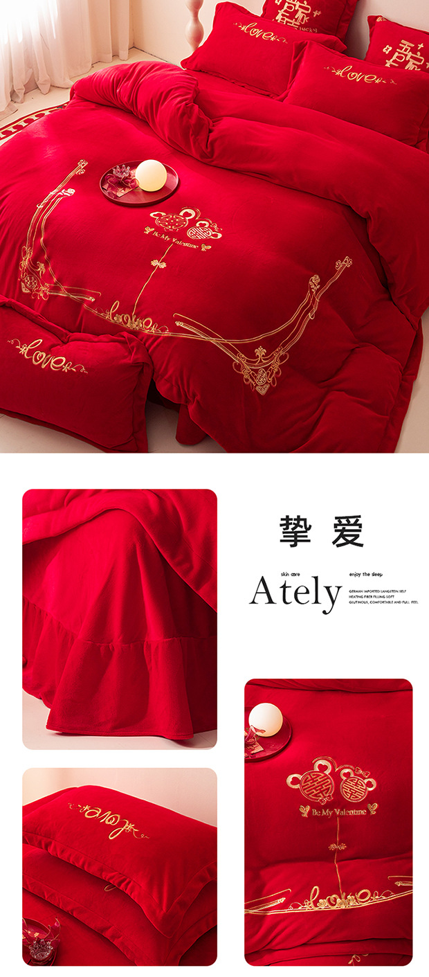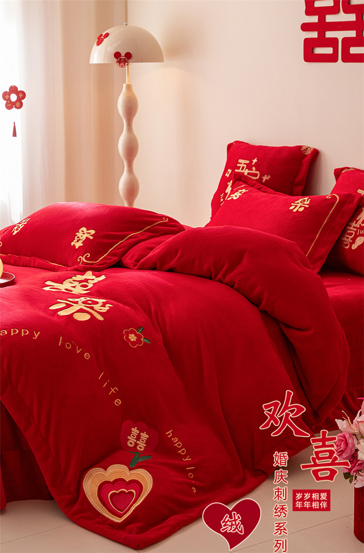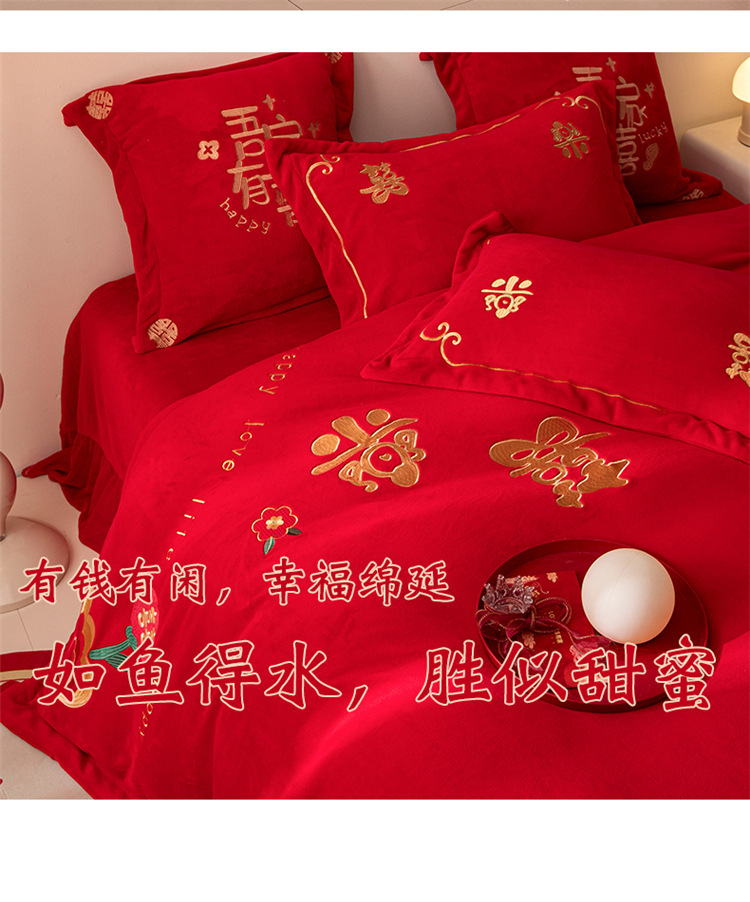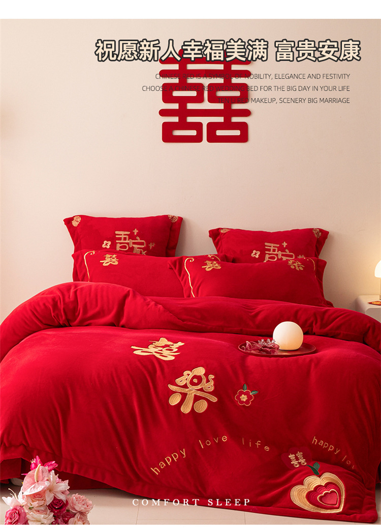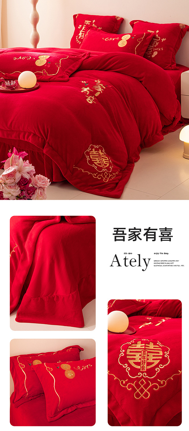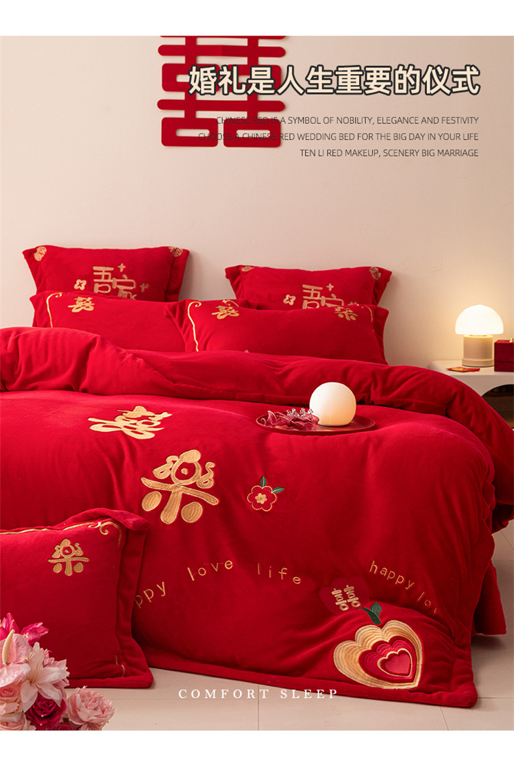 웨딩 가을과 겨울 따뜻한 우유 벨벳 침대 4 조각 두꺼운 자수 퀼트 커버 레드 침대 시트 장착 시트 도매 그룹 구매스토어 가기