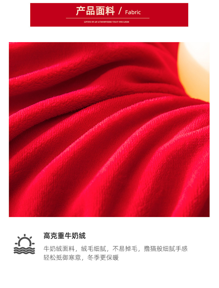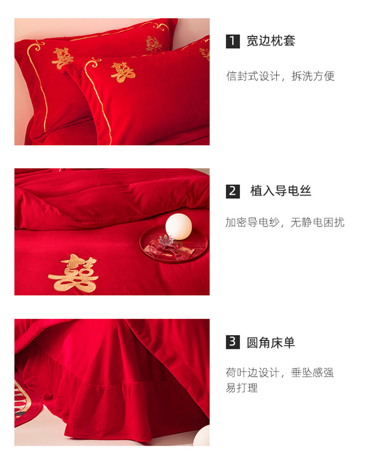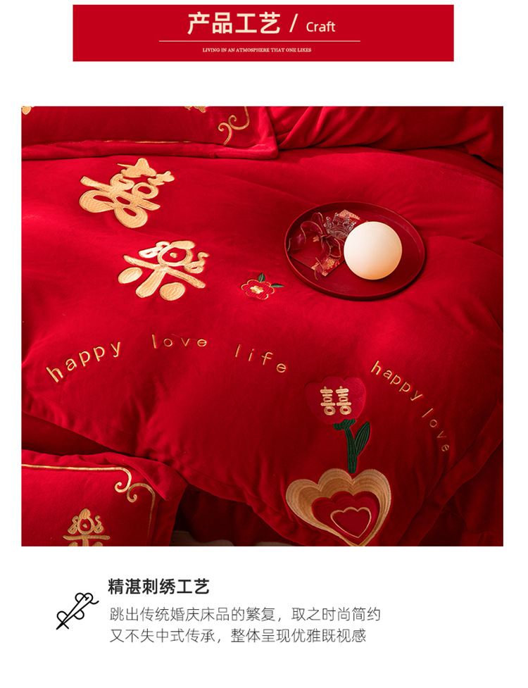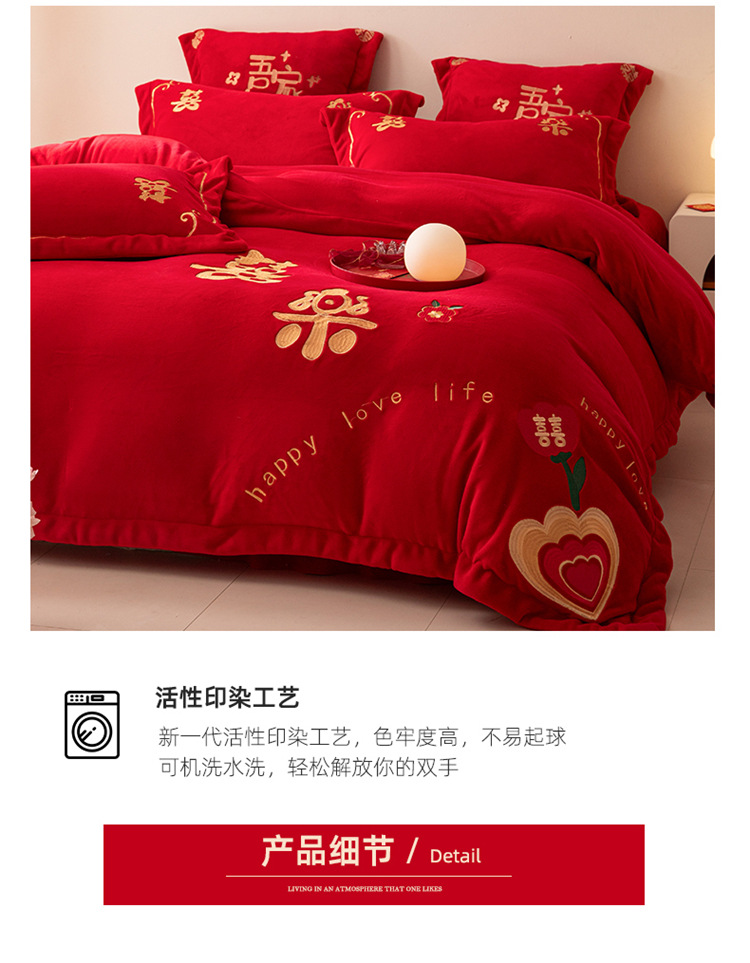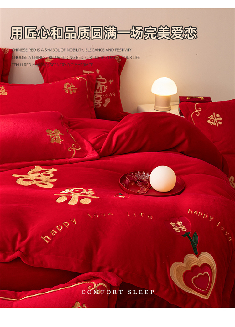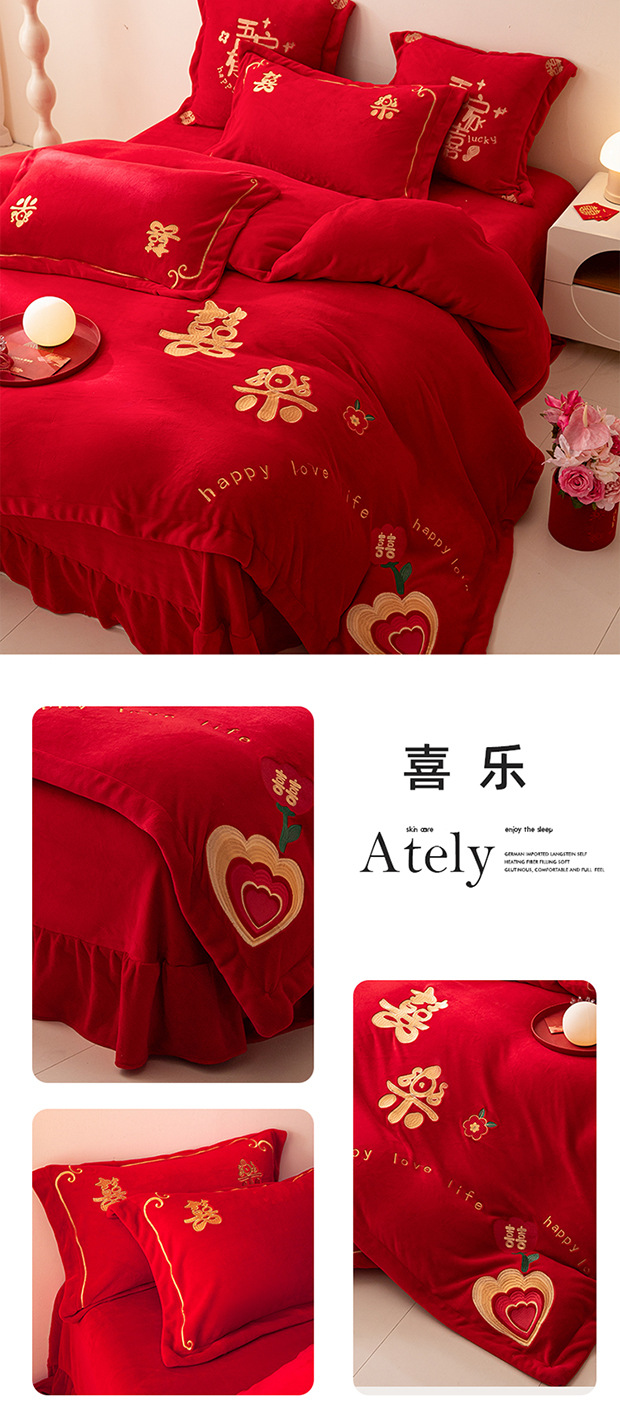 웨딩 가을과 겨울 따뜻한 우유 벨벳 침대 4 조각 두꺼운 자수 퀼트 커버 레드 침대 시트 장착 시트 도매 그룹 구매스토어 가기