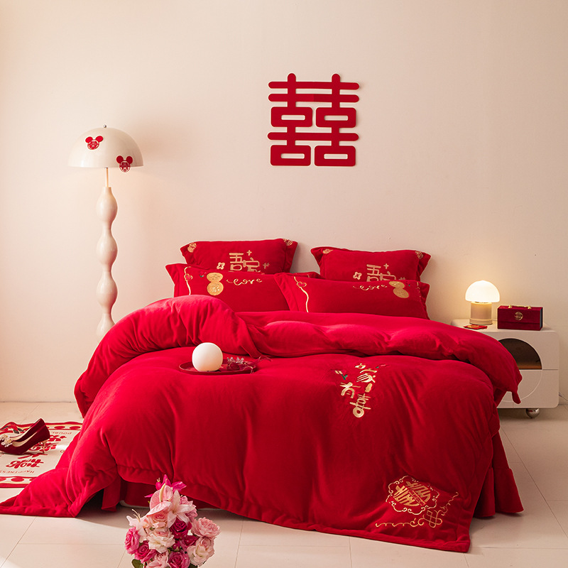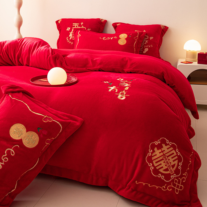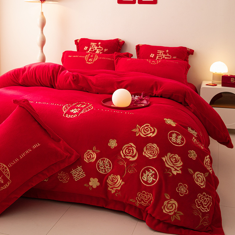 웨딩 가을과 겨울 따뜻한 우유 벨벳 침대 4 조각 두꺼운 자수 퀼트 커버 레드 침대 시트 장착 시트 도매 그룹 구매