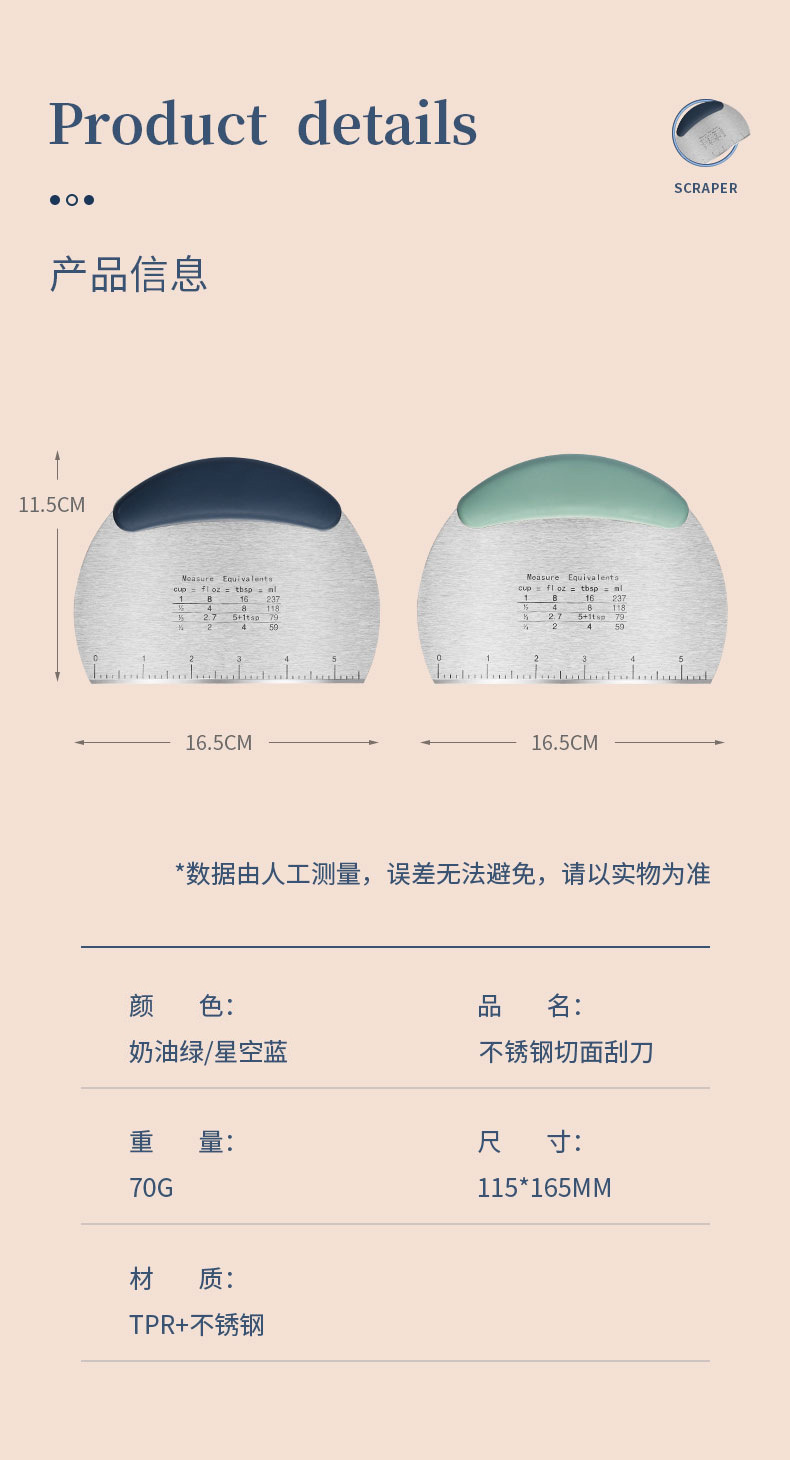 스케일 가정용 스크레이퍼 반죽 베이킹 도구 밀가루 커터 쌀롤이있는 재고 반원 스테인레스 스틸 국수 커터
