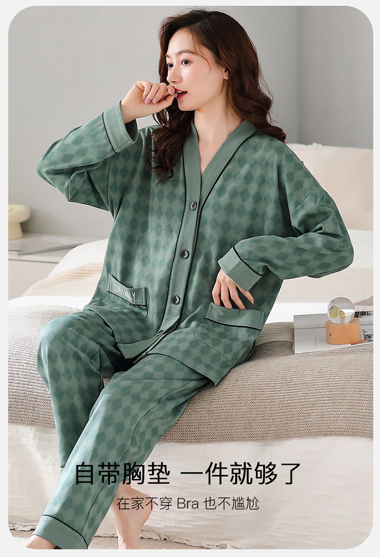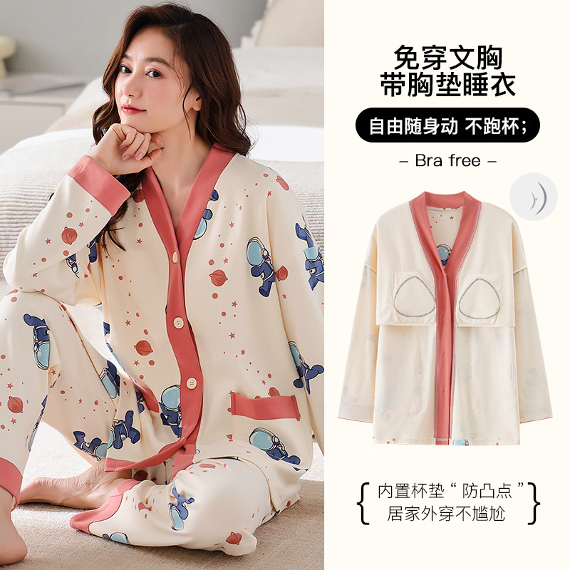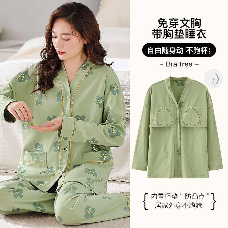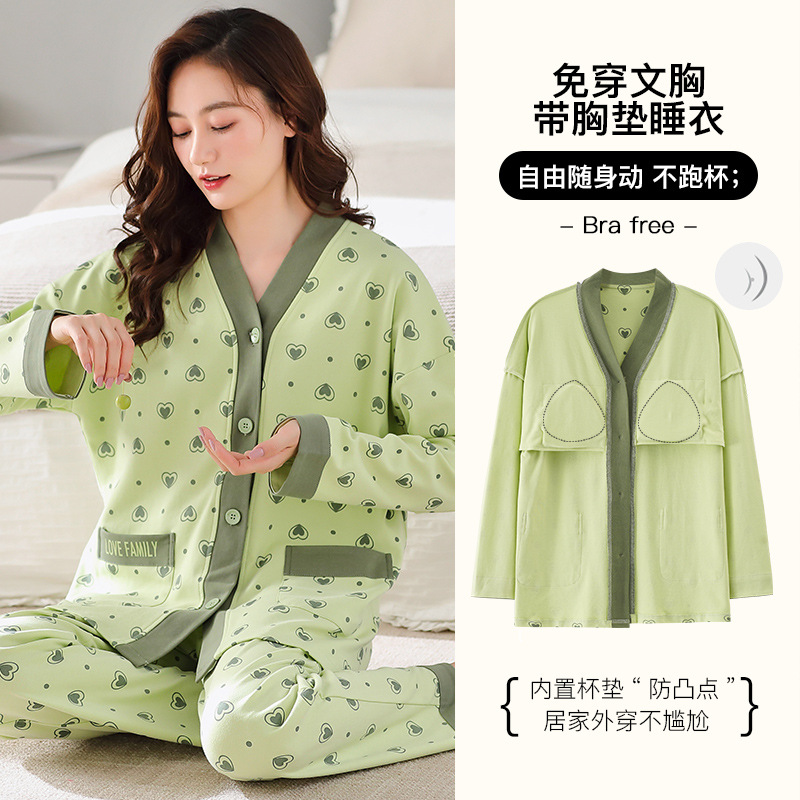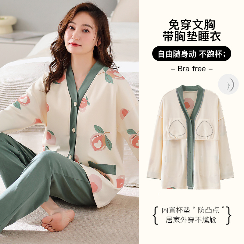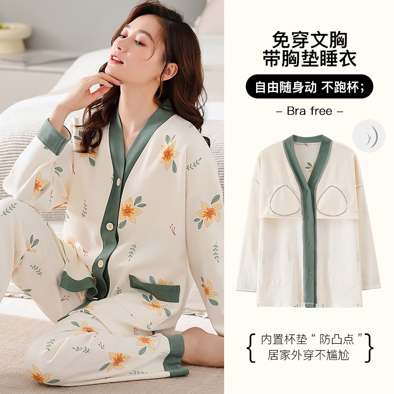 가슴 패드가 달린 여성용 면화 잠옷 봄과 가을 긴팔 카디건 엄마 새로운 고급 홈웨어 여성용 투피스 세트스토어 가기