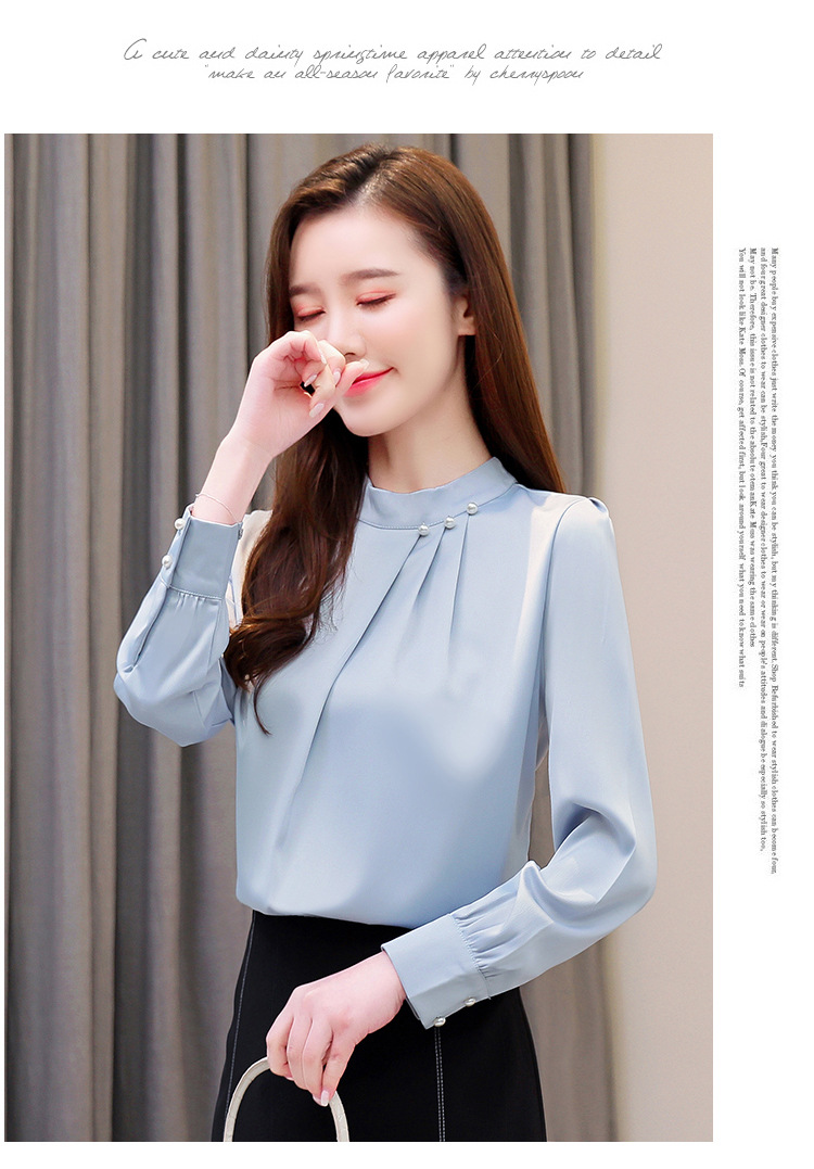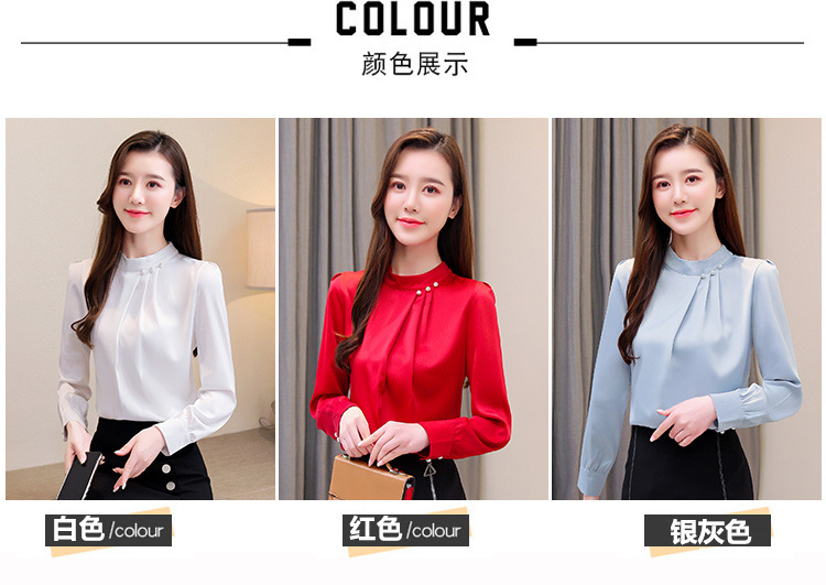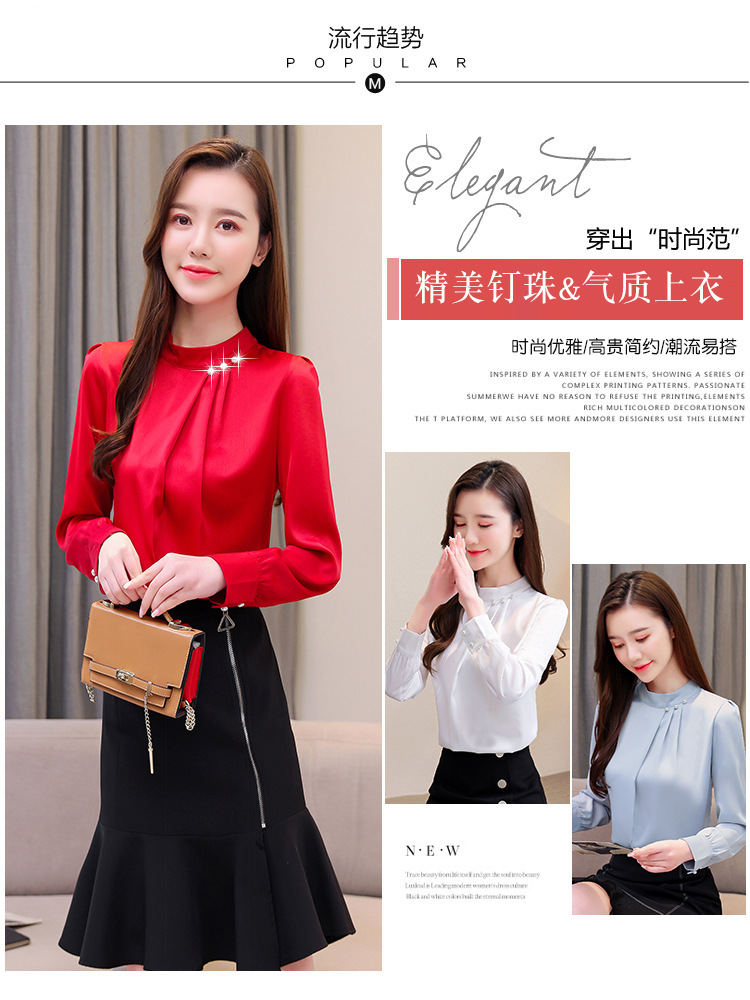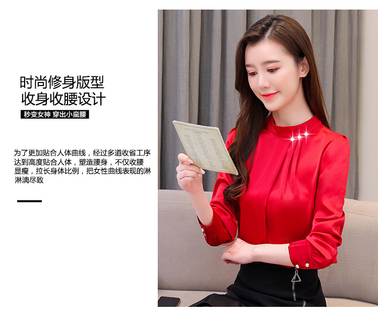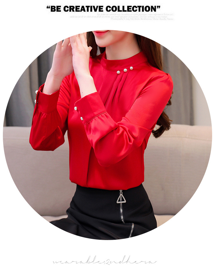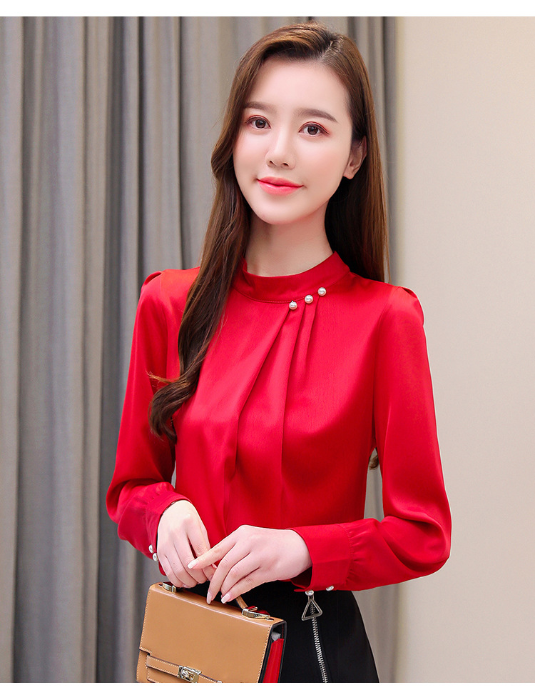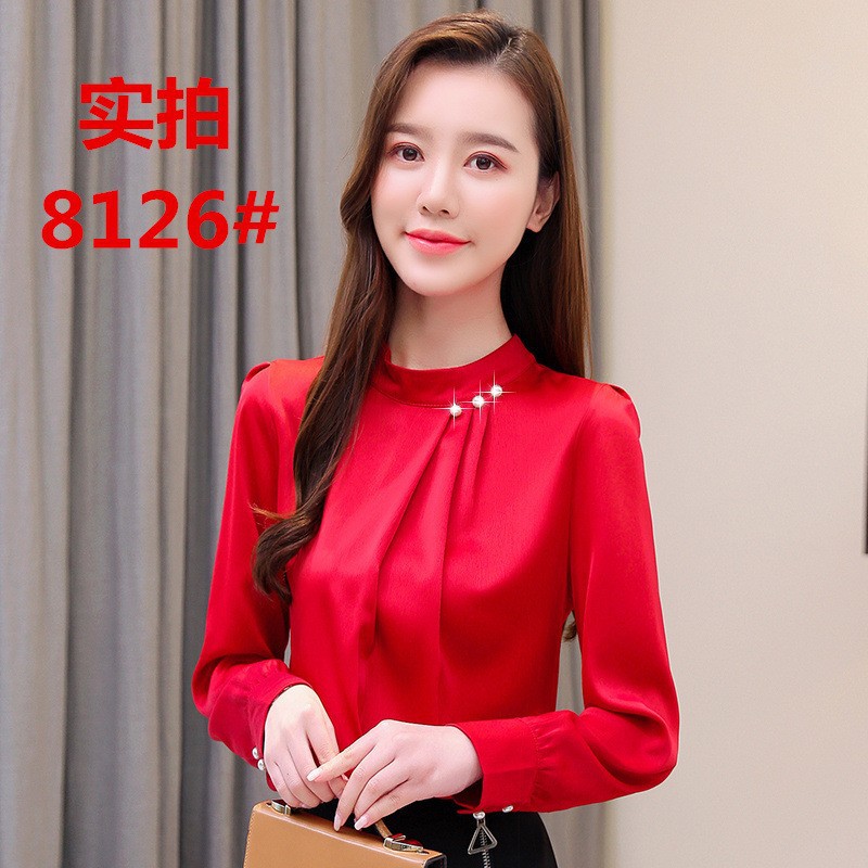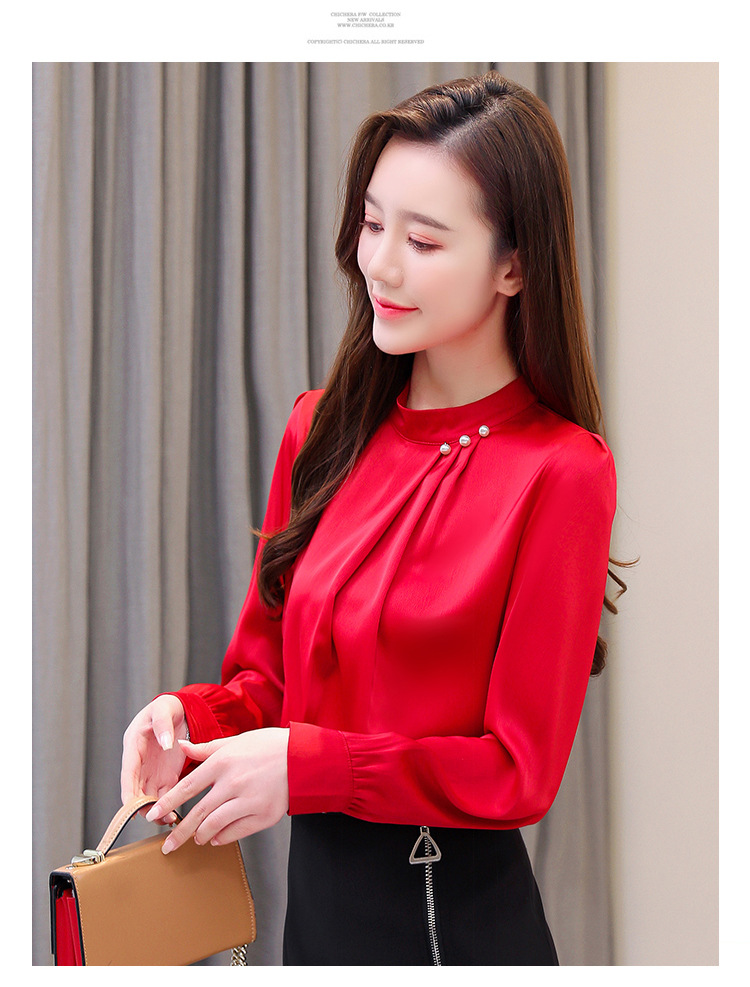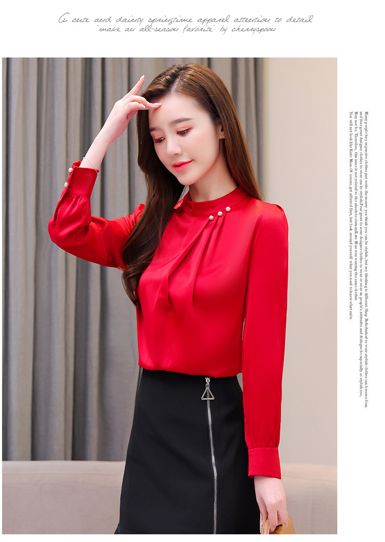 스탠드 칼라 쉬폰 셔츠 여성용 긴소매 서양식 내복 2024 스프링 셔츠 레드 새틴 탑스토어 가기