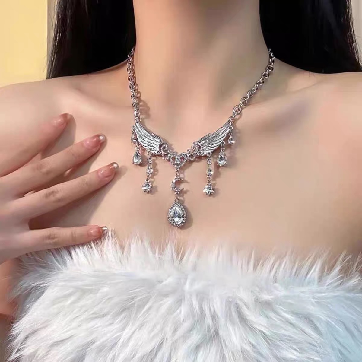 绒绳+合金+铜链+玻璃+羽毛 长32.5+6.7cm 重11g